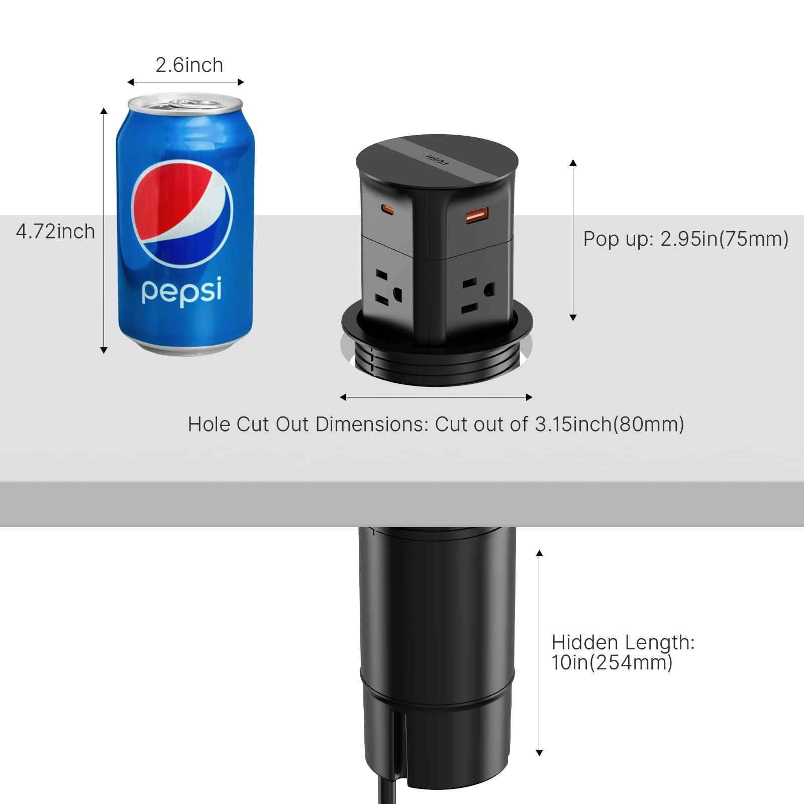 Easy to Installing:Jgstkcity pop up outlet fits 3.15inch(80mm) hole size,and has a built in spring loaded pop up mechanism, simply press in the top to pop the unit up for use. Depth under counter: 10-inch; Height when popped up: 2.95-inch.