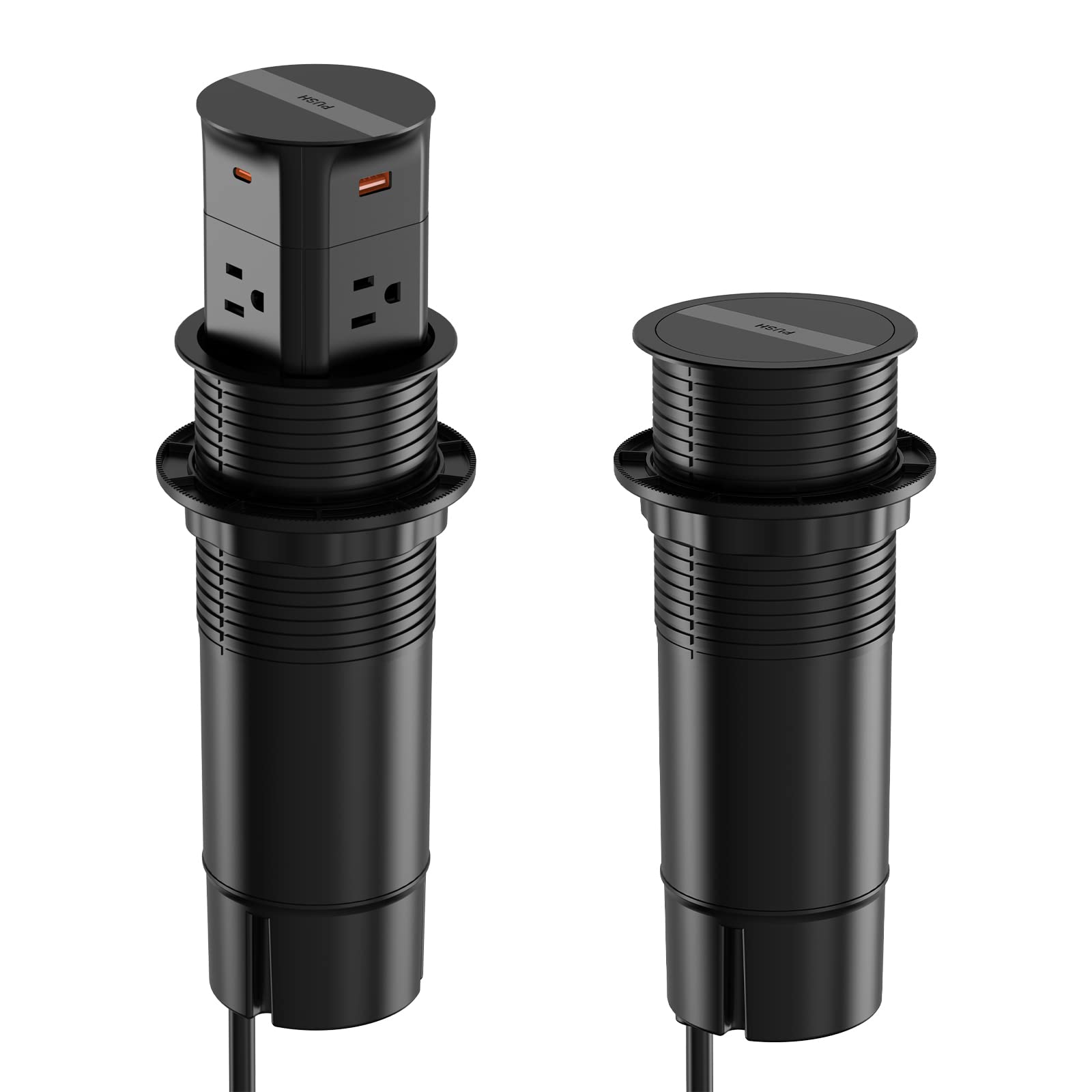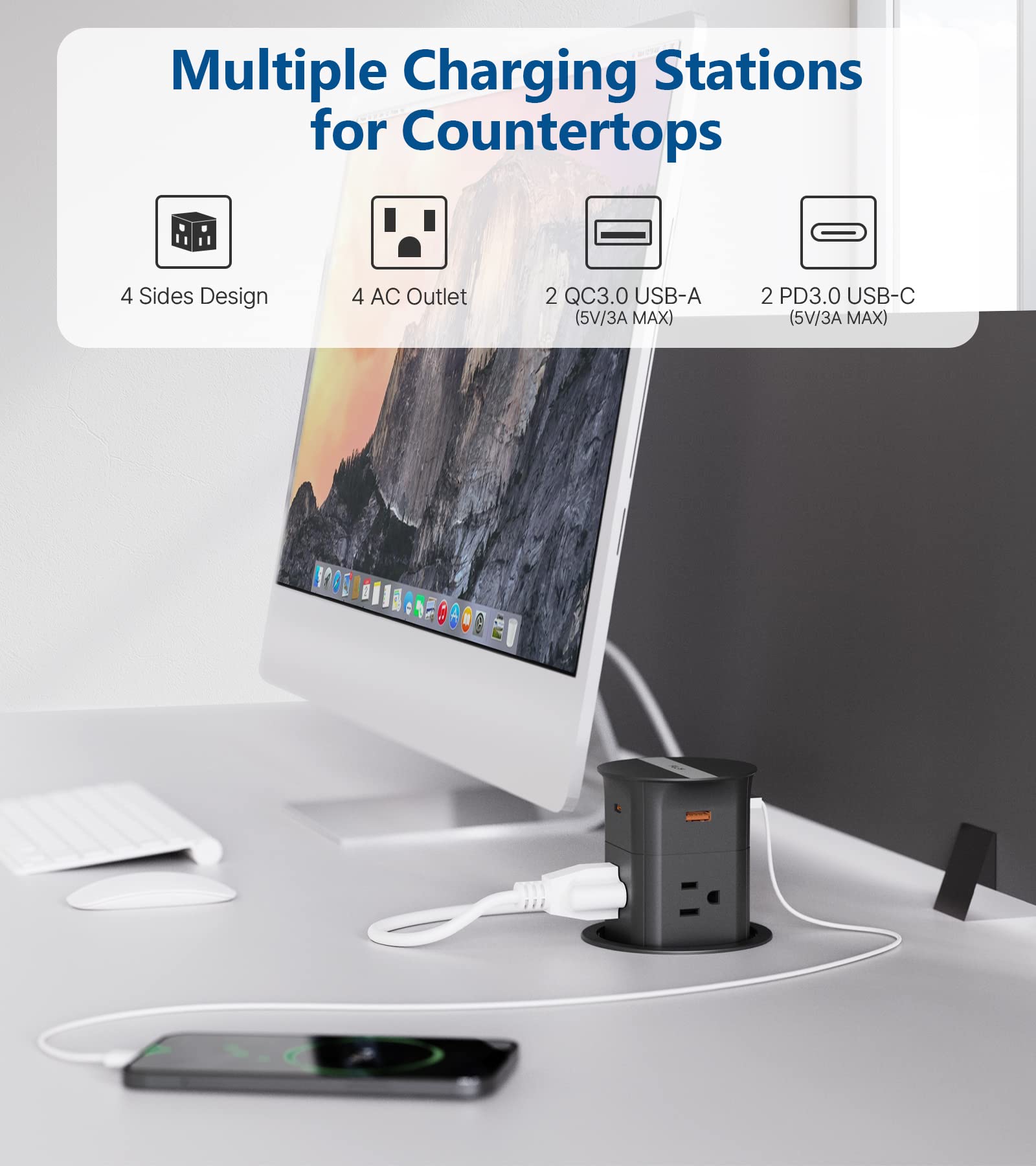 The Automatic Pop Up Outlet is the perfect solution to power up your kitchen counter island.Boasting a unique pop-out design, this outlet station with USB C provides instant access to all the power you need.In addition, it features 4 outlets and 4 USB ports, making it ideal for providing electrical access to all of your kitchen needs—from charging phones and tablets to powering appliances. This Splash Resistant pop-up counter outlet also boasts a 3.15"-diameter round design that easily blends into any countertop and makes a great desk grommet or power grommet.Additionally, this pop up receptacle is perfect for conference tables or any desktop space in need of extra power options. This Automatic Pop Up Outlet comes with an easy installation setup and is designed with convenience in mind. The durable ABS material ensures long lasting protection against dust and moisture—keeping your workspace dry and safe from accidental liquid spills.The sturdy spring mechanism allows the unit to stand upright and not fall over when not in use while also preventing any wiggle or rattle during operation. Plus, its slim profile plus will take up little counter space compared to other traditional outlets – allowing you more room for other tasks. The Automatic Pop-Up Outlet makes charging up devices both convenient and stylish. Its sleek design can fit into many décor themes while providing ample power options at the same time. It's perfect for desk holes, countertops, conference tables, power grommets, – or anywhere else where added electric access may be needed. Whether you're wanting extra sockets in a conference room or a popup socket on your home office desk – no job’s too big or small!