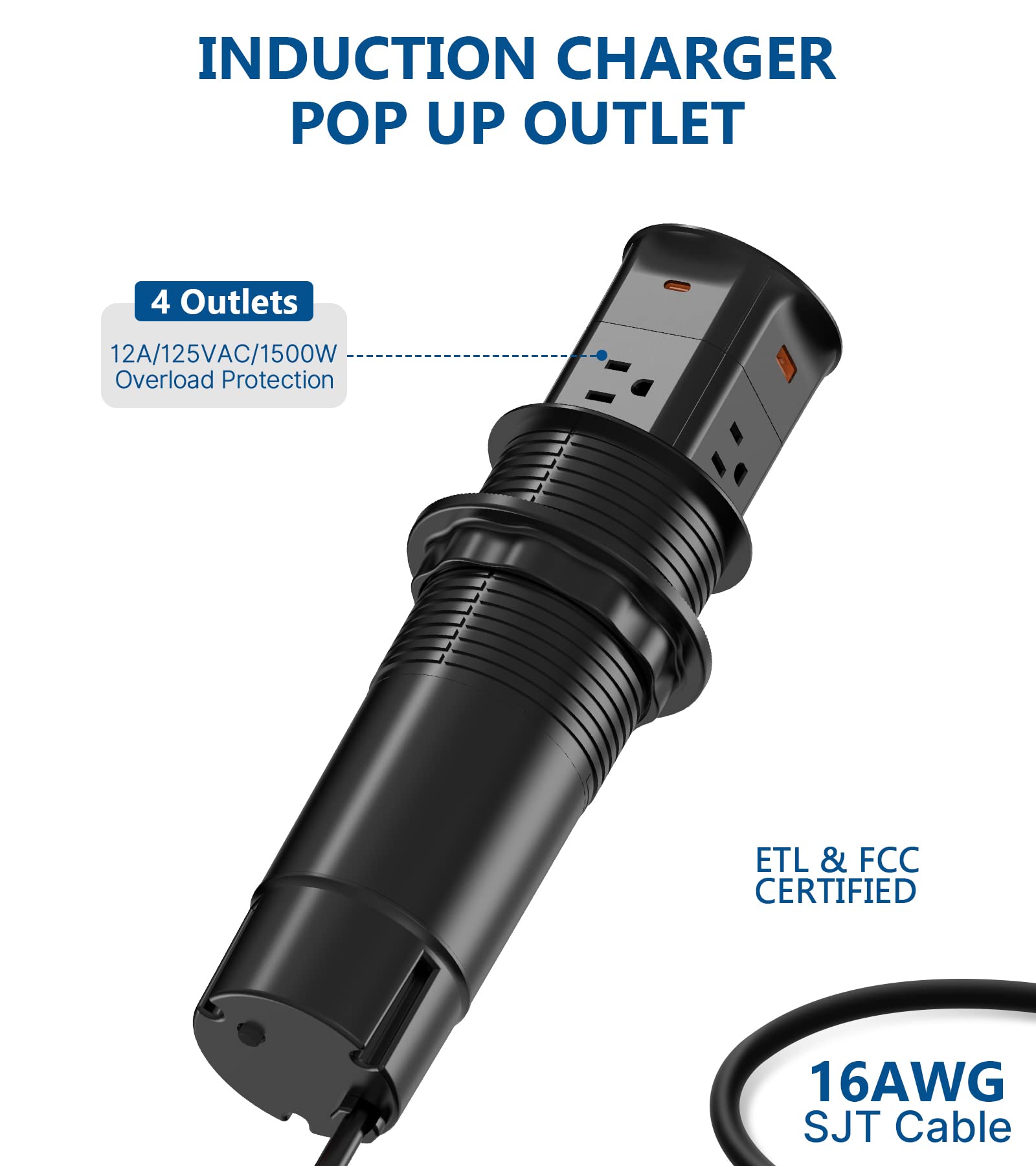 Pop Up Table Power Outlet: with 4 grounded 3 prong AC outlets,12 Amps, provide more options when you need more than one plug. with a 3ft 16 AWG/3C extension cord. There are only power sockets and USB ports, no wireless charging function!