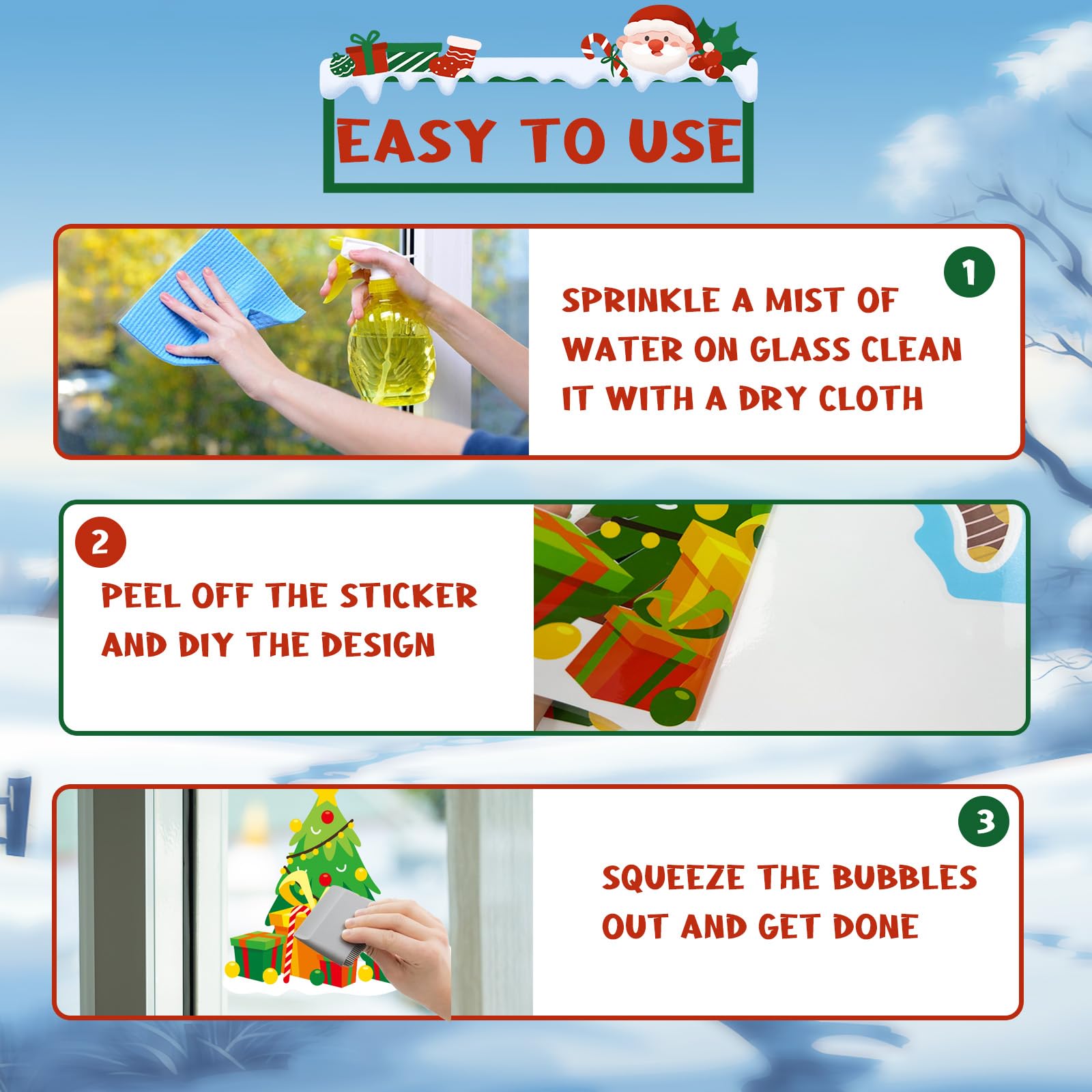 Easy Application And Removal :To use these Christmas window stickers, simply spray a light mist of water on the smooth surface, then press the window clings to remove any air bubbles. They stick firmly yet can be repositioned easily to achieve the perfect layout. These large Christmas window clings, and Christmas decals for windows make decorating windows,or other smooth surfaces simple and fun for any holiday setting