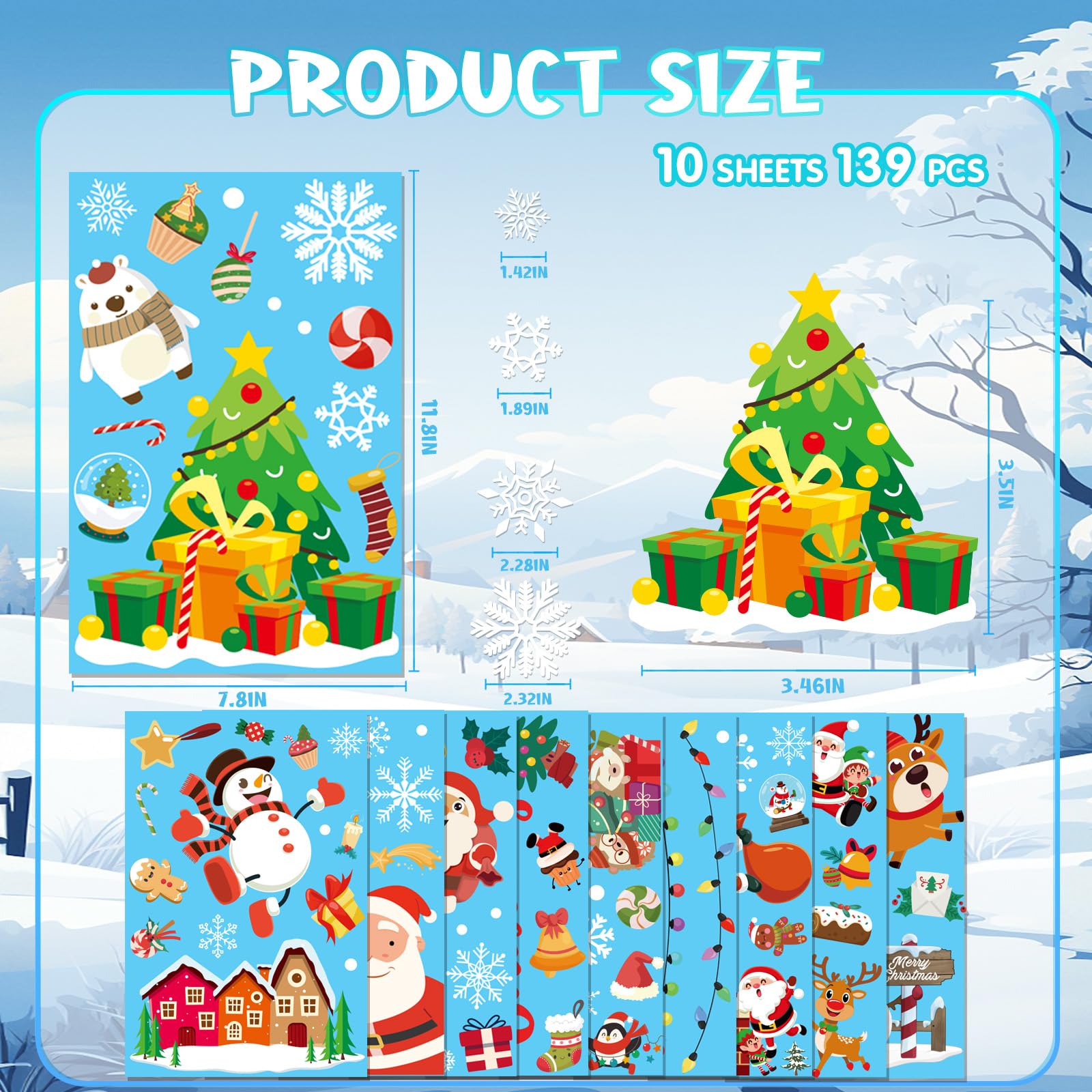 Full Set Of Christmas Window Stickers:This set includes 10 sheets with 139pcs Christmas window stickers featuring Santa Claus, Christmas trees, reindeer, snowmen, gift boxes, snowflakes, Christmas elves, and more. Perfect for Christmas window clings, window Christmas decorations, and holiday window clings for glass. Bright colors and detailed designs make these Christmas decals ideal for creating a cheerful, festive atmosphere at home, classrooms