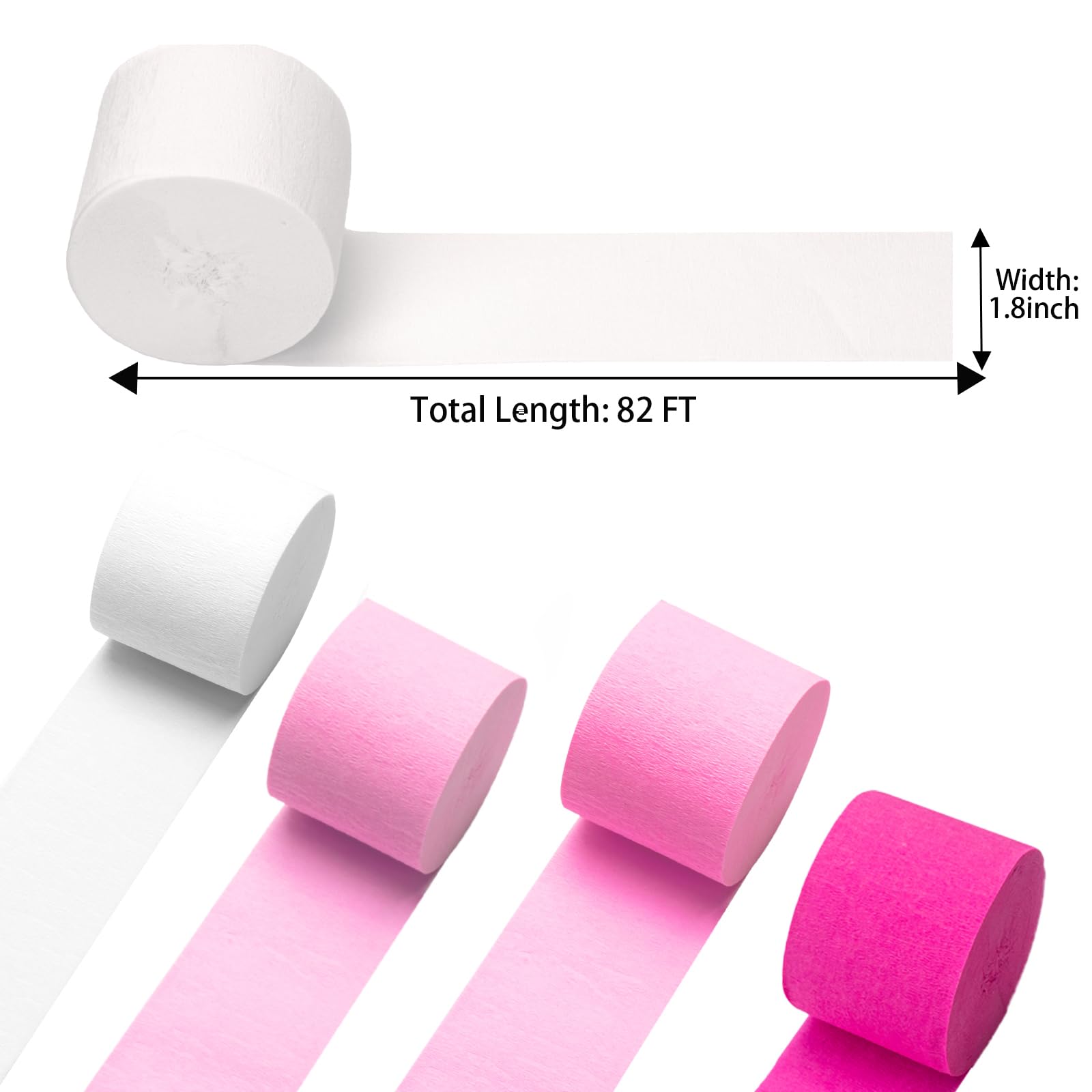 What Will You Get: includes 4 rolls of pink and White Color Crepe Paper Streamer in total, Each streamer measures 1.8 inch/ 4.5 cm wide and extends to length of 82 feet/ 25 m long, total 110 yards, Totally enough length for you to use, no need cutting or splicing. for unicorn party,Crepe Paper Streamers will let your party decor more eye-catching, Beautiful Crepe Paper for decorating window doorway, walls Garden, home party, office create a romantic dream party atmosphere