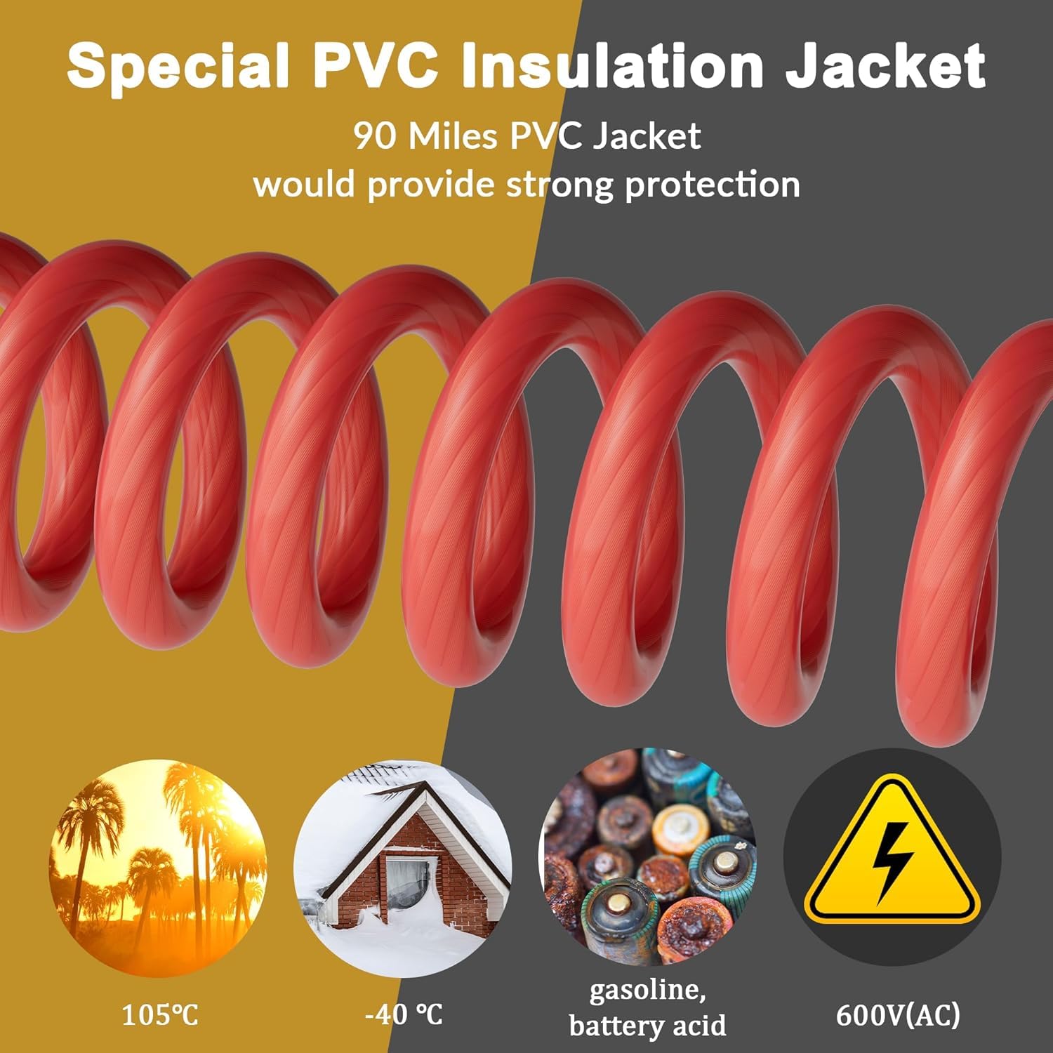 Soft-Touch PVC Jacket Maximizing Flexibility and Durability- HiFind true spec 4 gauge wires come with a rugged 90 Miles PVC jacket, offering both flexibility and durability for challenging placements, effectively preventing cable oxidation, corrosion, high temperature, gasoline, battery acid and abrasion. Its soft-touch design suits electrical and auto repair installations, providing indoor use versatility with built-in resilience to impacts and diverse conditions. Extreme Heat Tested.
