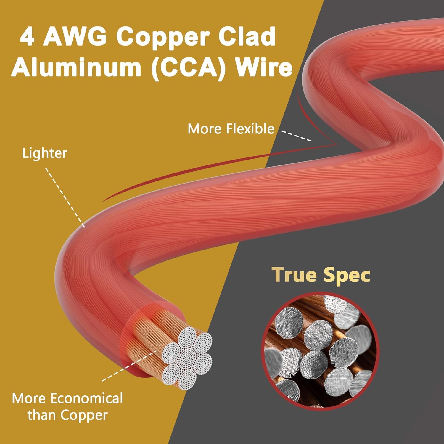 HiFind 4 gauge 4 AWG Welding Battery Wire Cable HiFind 4 gauge power/ground wire meets American Wire Gauge(AWG) standard, offering true-to-gauge quality that guarantees the necessary power flow for your wiring projects. 4 AWG PREMIUM COPPER-CLAD ALUMINUM (CCA) WIRE CONTAINS 30% COPPER SOFT-TOUCH PVC JACKET MAXIMIZING FLEXIBILITY AND DURABILITY Rated for up to 600 volts Withstanding temperatures from -58??F to +221??F(-50??C to +105??C) resistant to most solvents and fire resistant Dedicated to offering top-notch wiring solutions for a variety of projects, including car audio systems, home stereos, RV trailers, solar panel installations, generators and more. Ideal for DC applications that involve high-voltage batteries.
