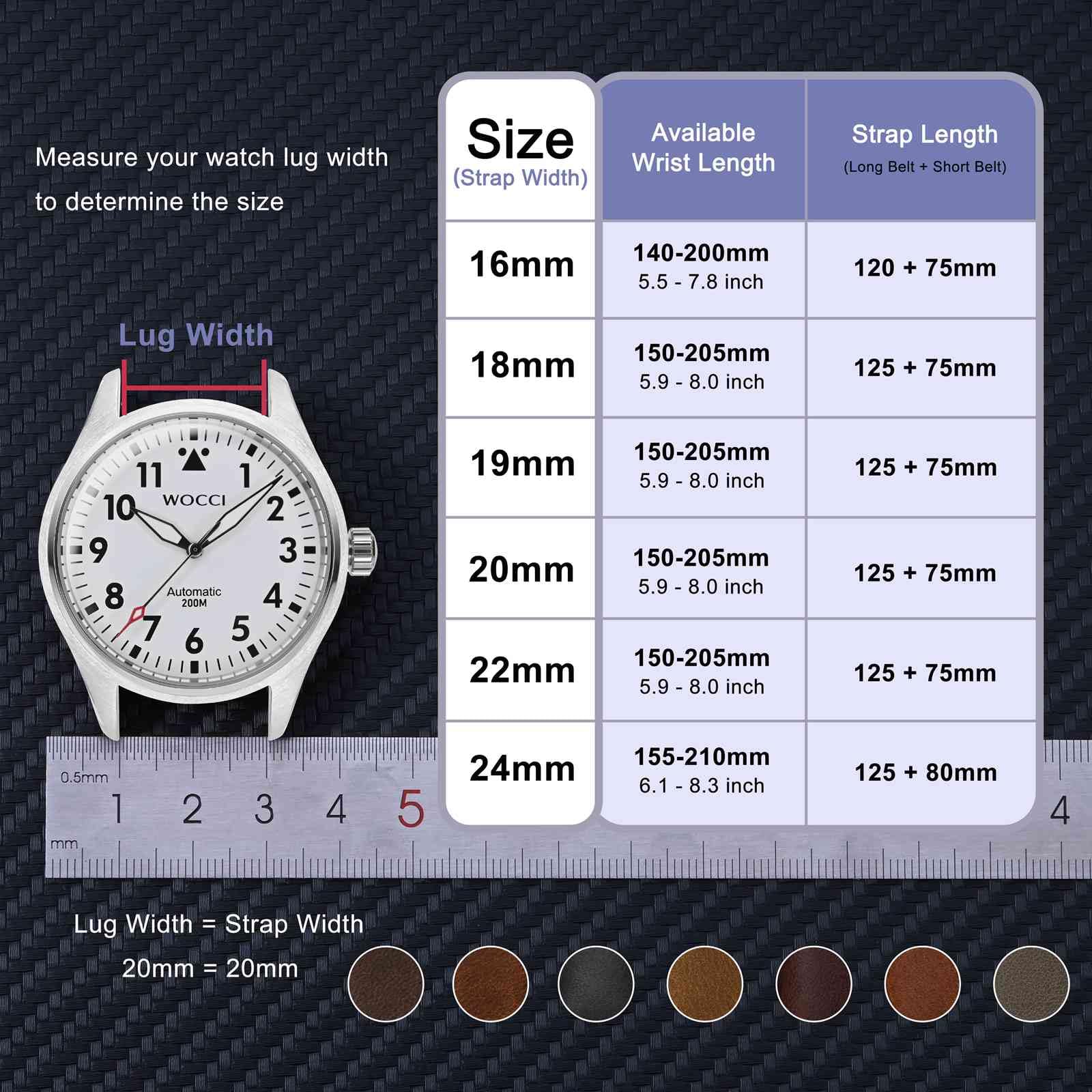 Strap Length: 125mm+75mm. Suitable for wrist around 5.9 to 8 inch (150mm to 205mm), but watch dial also impacts fit. Compatible with most traditional watches and smart watches which lug width is standard 18 mm, 20 mm, 22 mm