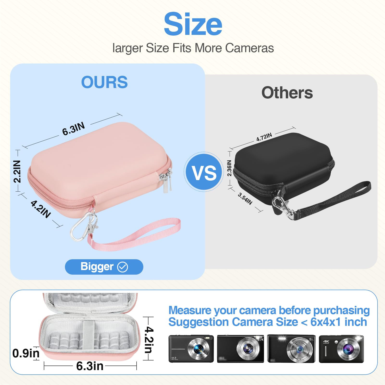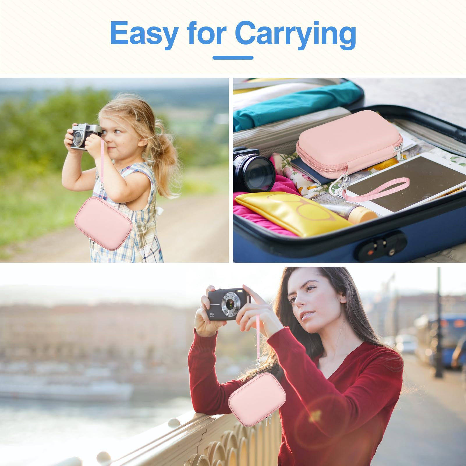 【Portable Design】Case External dimension: 6.3x4.2x2.2inch/16x10.7x5.6cm(L * W * H). Includes detachable wristband and climbing button for easy carrying for your comfort. You can carry canon powershot camera anywhere, put point and shoot digital cameras case in your hand. Kids digital camera case is slim and lightweight, save space and can easily slide into your backpack or other bag.