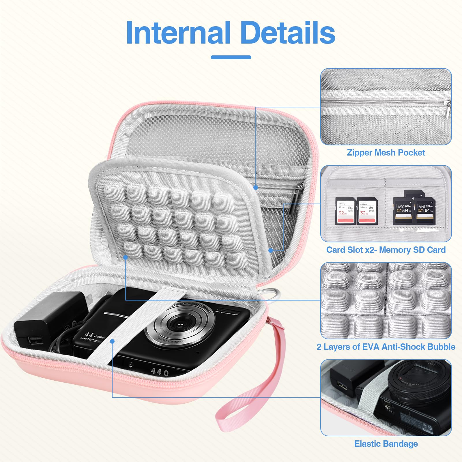 【Simple and Practical Design】 The inner zipper mesh pocket storage space keeps the items well-organized, 6 to 8 SD cards can be stored in 2 card slots,and can effectively store PowerShot vlogging camera accessories. Built-in elastic band can fix camera and prevent travel canon camera from accidentally falling. Double strong zipper allows you to easily remove or put the 5k digital camera from the canon case.