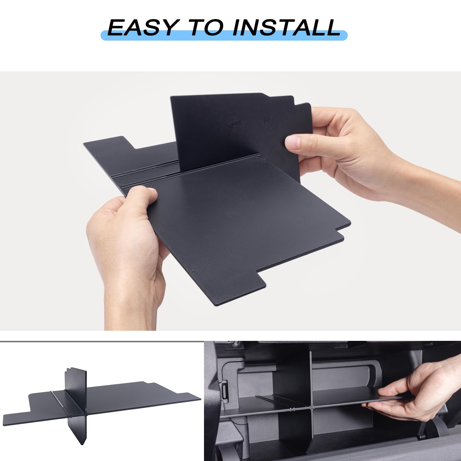 【PATENT DESIGN】Turn the glove box into 4 compartments for you to organize items according to your needs such as the owner’s manual, pens, cables, notepads. The large size compartment can fit the owner’s manual