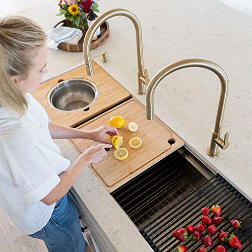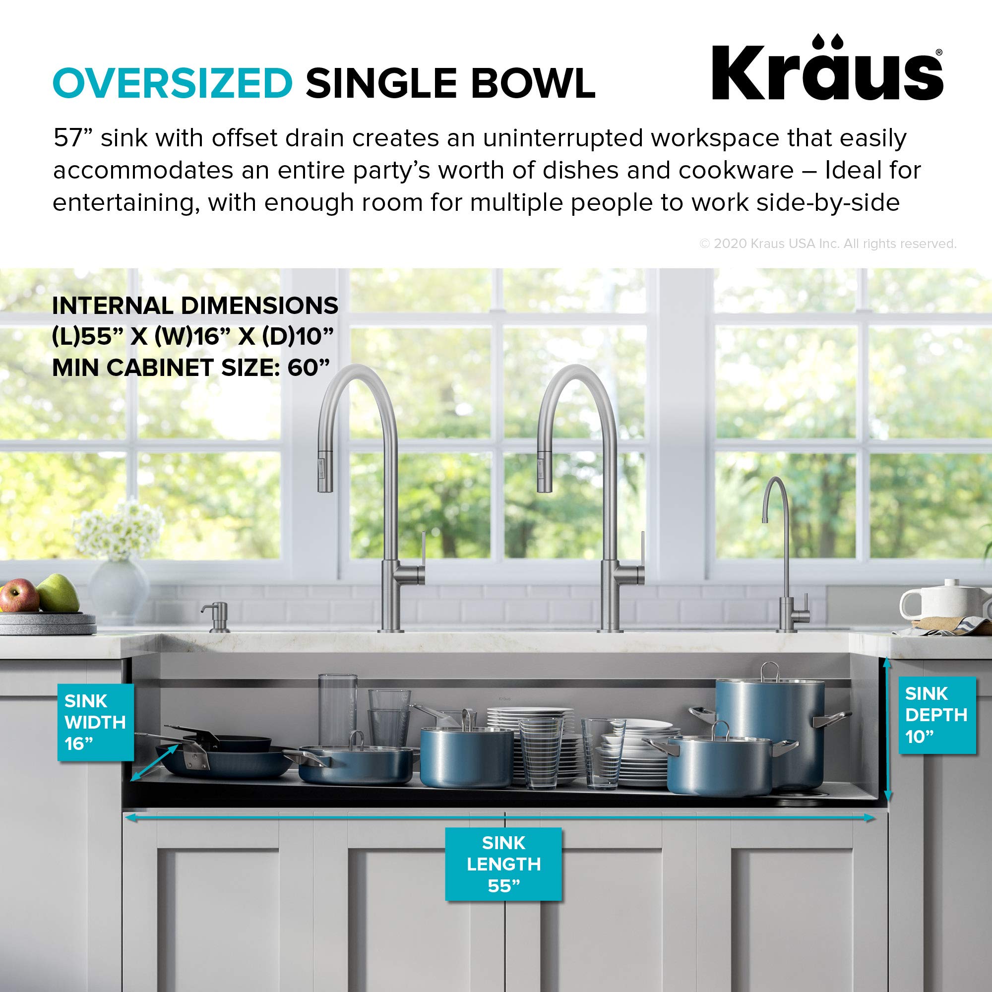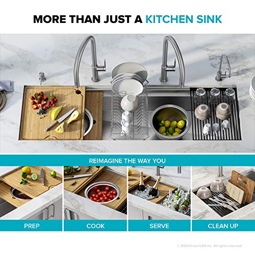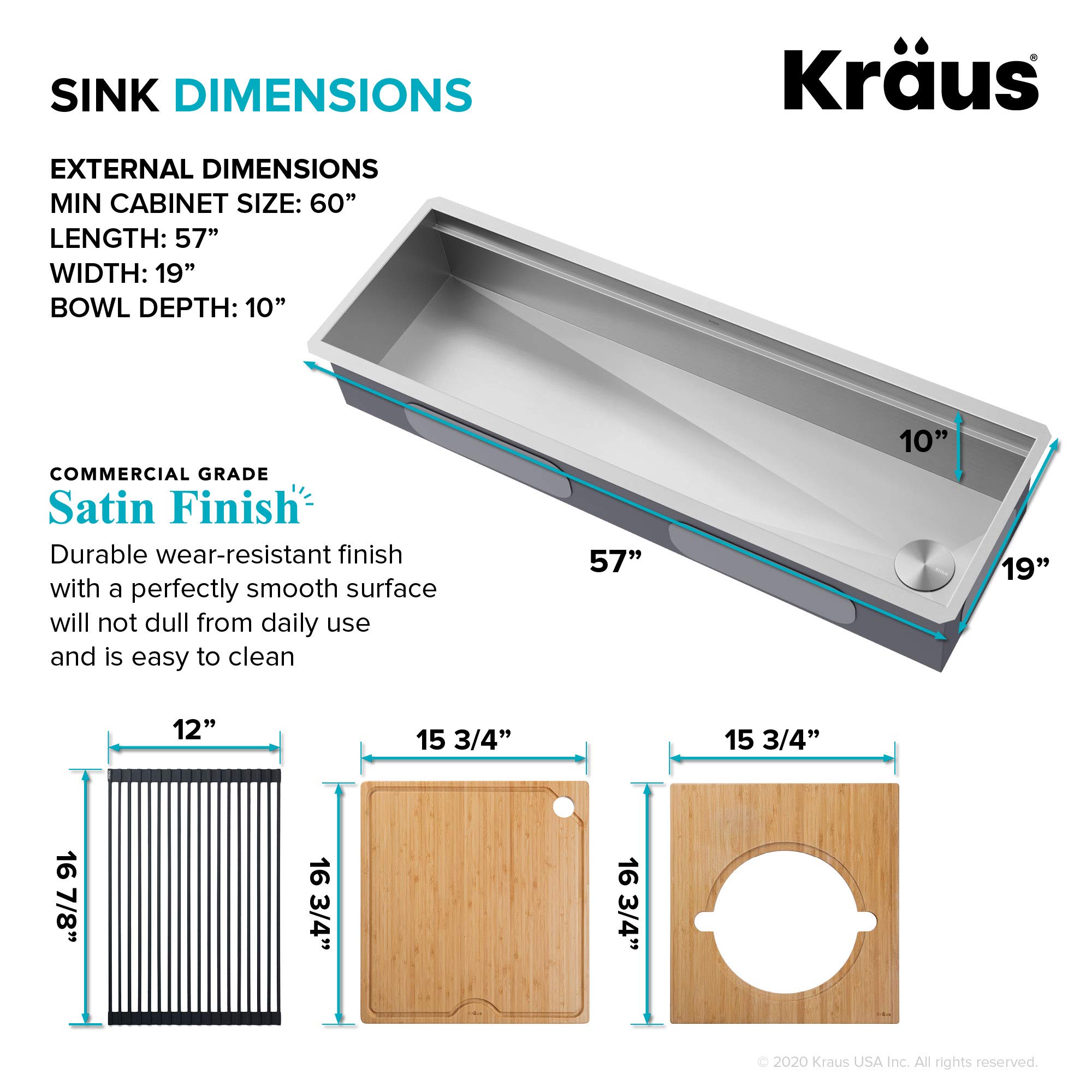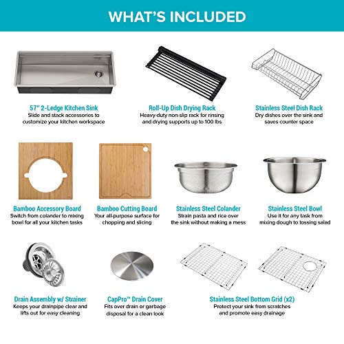Discover a whole new way to cook, serve, and entertain with the 57” Kore™ Workstation Sink. An innovative 2-tier ledge system allows you to slide accessories across the sink on two levels, doubling your workspace and streamlining all your kitchen tasks from meal prep to cleanup. The heavy-duty sink comes with a chef’s kit of 10 premium accessories that includes a solid bamboo cutting board, serving board set with mixing bowl and colander, stainless steel dish rack, and multipurpose roll-up drying mat that allow you to work right over the sink without taking up counter space. This high-performance sink is made with KRAUS TRU16 – the thickest stainless steel on the market – for uncompromising industrial-grade durability. Undermount installation creates a seamless transition between sink and countertop, with no exposed mounting deck to trap food and debris. The oversized 57” single bowl with offset drain creates an uninterrupted workspace that easily accommodates an entire party’s worth of dishes and cookware, and offers enough room for multiple people to work side-by-side. A sloped bottom with channel grooves drives water toward the drain to allow for complete drainage. The installation-ready package includes all required mounting hardware, a premium stainless steel drain assembly with decorative cover, and two heavy-duty bottom grids to protect your investment. Ideal for single or double faucet installation, this sink pairs perfectly with Kraus Oletto™ High-Arc Kitchen Faucets (KPF-2821) for a stunning kitchen design with pro-chef functionality