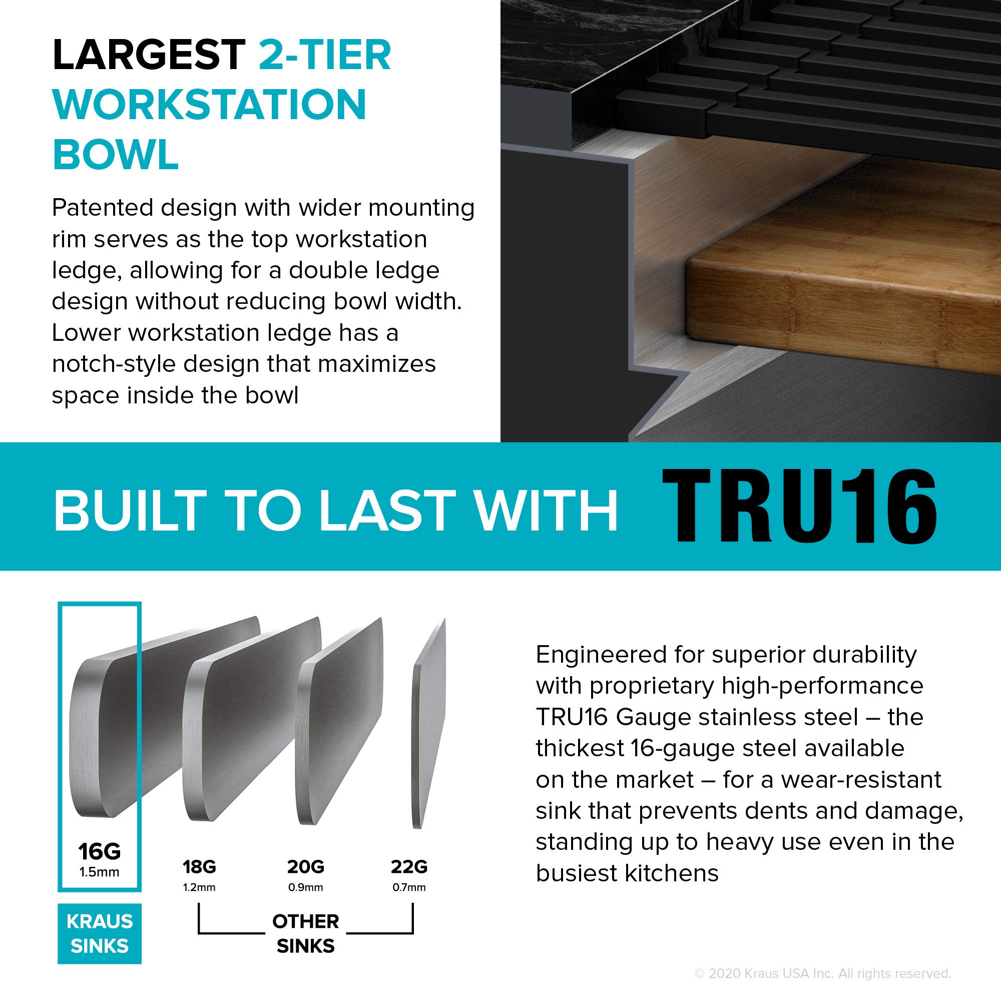 HEAVY-DUTY 16 GAUGE SINK: Designed for lasting durability, extra-tough TRU16 gauge stainless steel sink stands up to everyday use with great resistance to corrosion, dents, and damage