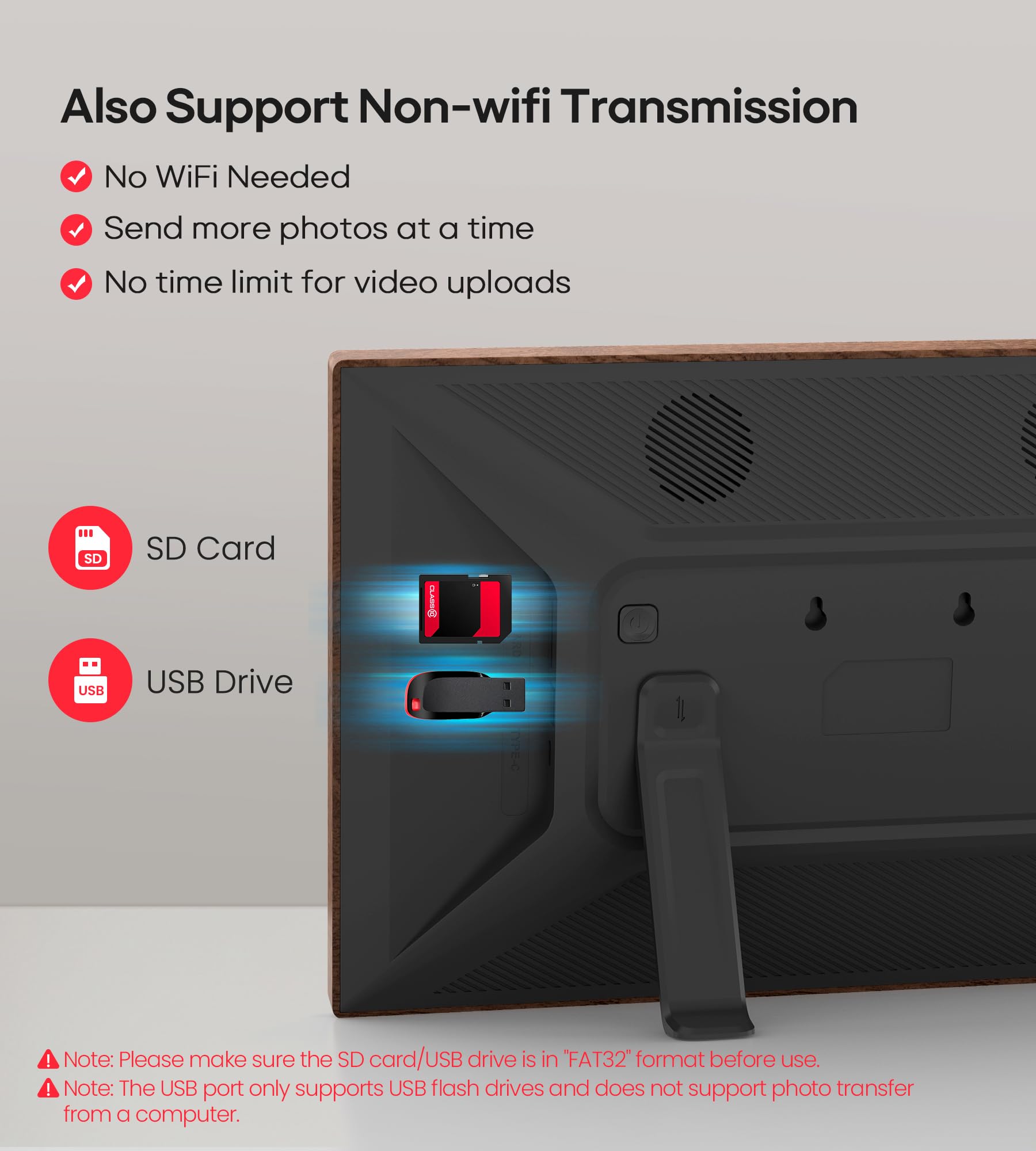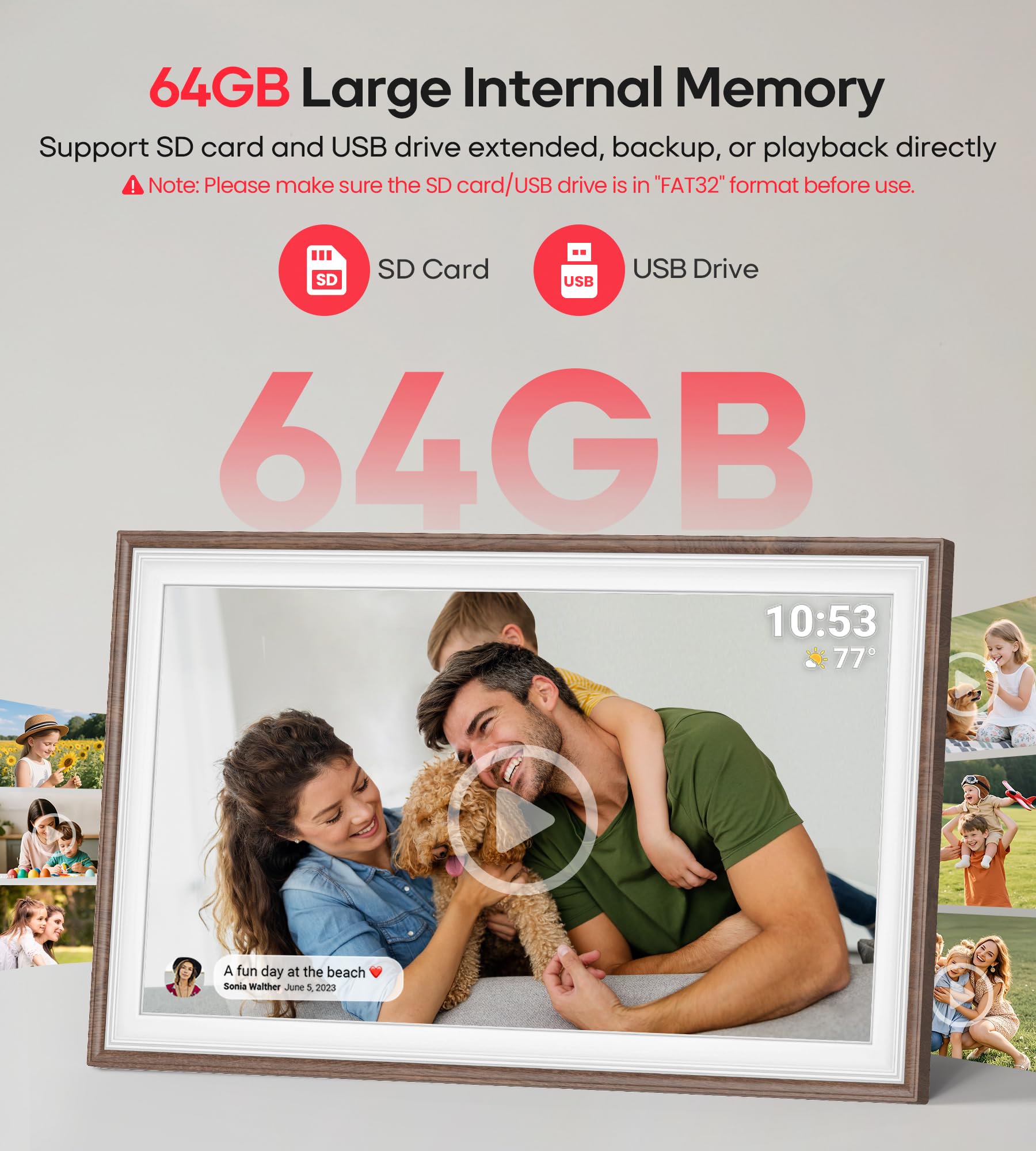 【64GB Large Memory & Supports SD Card/USB Flash Drive】Built-in 64GB large storage space (can store about 100,000 photos). Supports direct playback of photos and videos on SD card and USB flash drive without importing, and can also expand storage, import, export, and backup pictures through SD card or USB flash drive. Note: 1. Please make sure the SD card/USB drive is in "FAT32" format before use. 2. For better compatibility, we recommend using a 32GB SD card/USB drive, as 64GB and 128GB options may not work properly with the frame. 3. The USB port only supports USB flash drives and does not support photos transfer from a computer