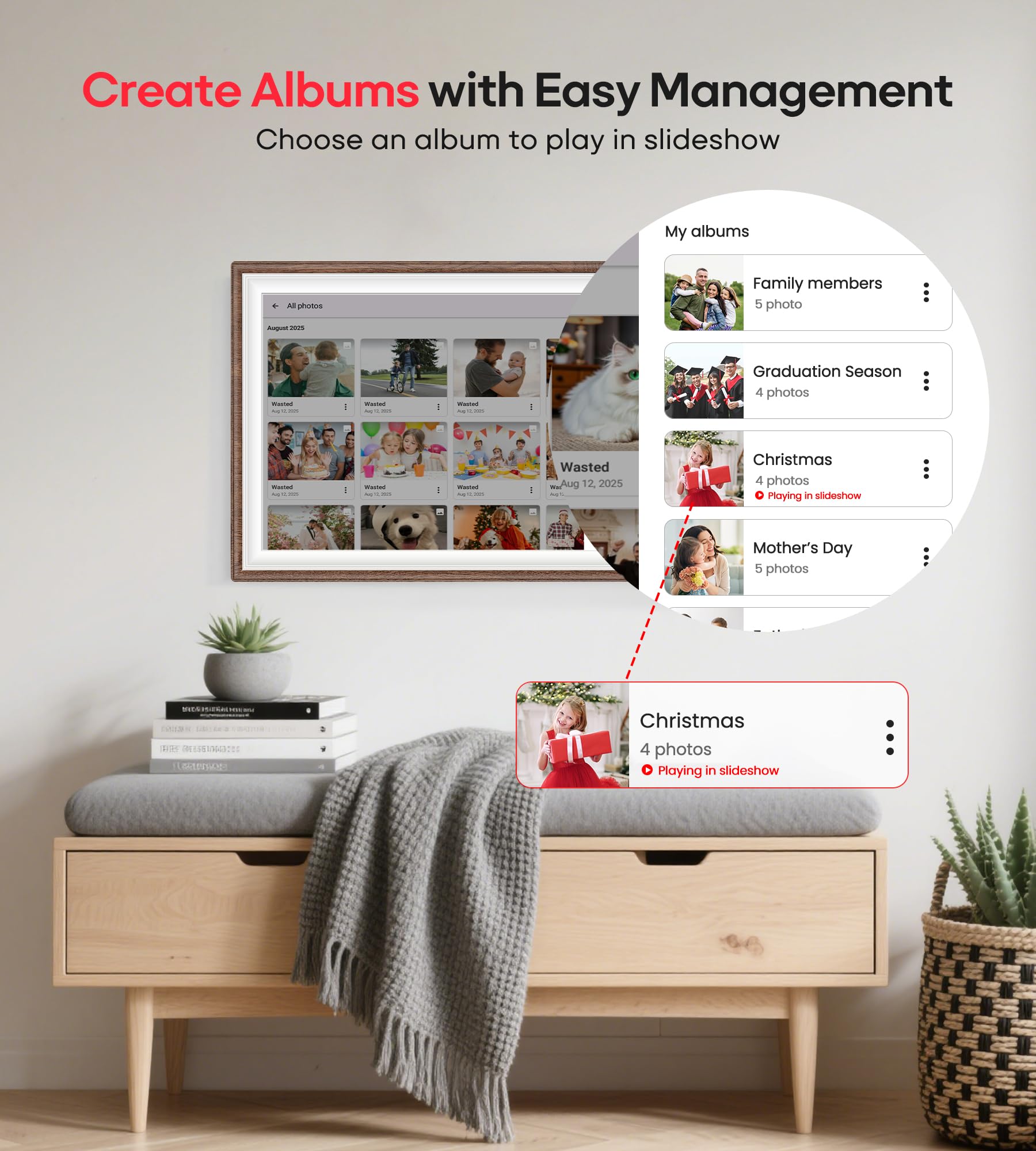 【More Impressive Special Features】① Create Albums: Album management keeps your photos organized and makes memories easier to find and enjoy. ② Fun function: Use "React" to send emojis to loved ones in real time to let the sender know how it made you feel. ③ Greetings: Never miss out great moments by sending greetings anytime. ④ Auto Rotation: Automatically rotates photos horizontally or vertically. Equipped with a detachable stand and a screw, you can place the digital frame on the desk or hang it on the wall. ⑤ Custom functions: play order, adjust brightness, title display, sleep mode, etc