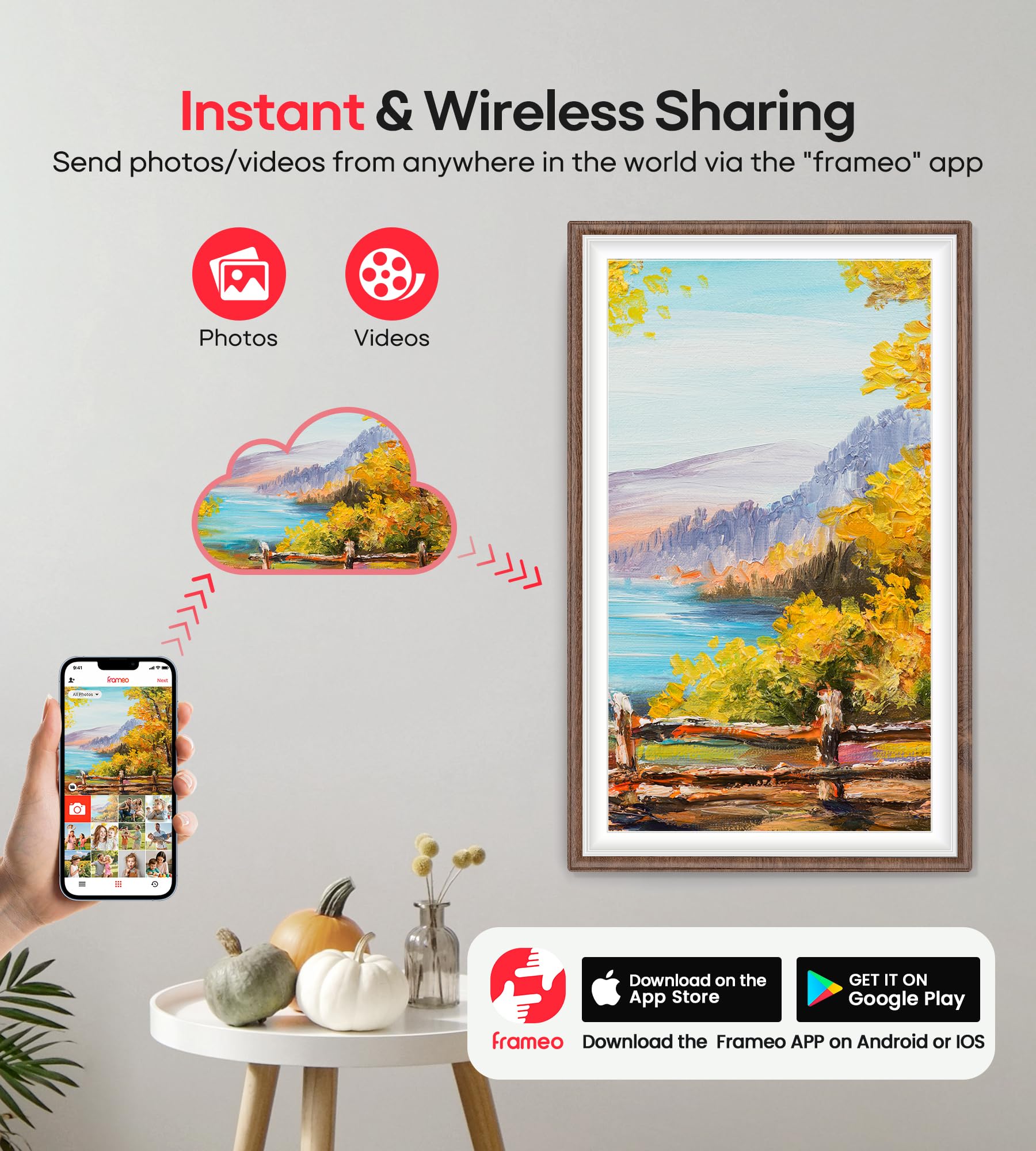 【Share Photos and Videos Instantly Via "Frameo" APP】Share every wonderful moment with your family and friends. Connect the 15.6" digital picture frame to a WiFi network and share photos and videos anytime and anywhere Via "Frameo" APP. Photos and videos can be presented within a few seconds, add titles to photos to show your mood and experience fully! Download the "frameo" app for iOS and Android for fr-ee to give you full control of the large digital frame