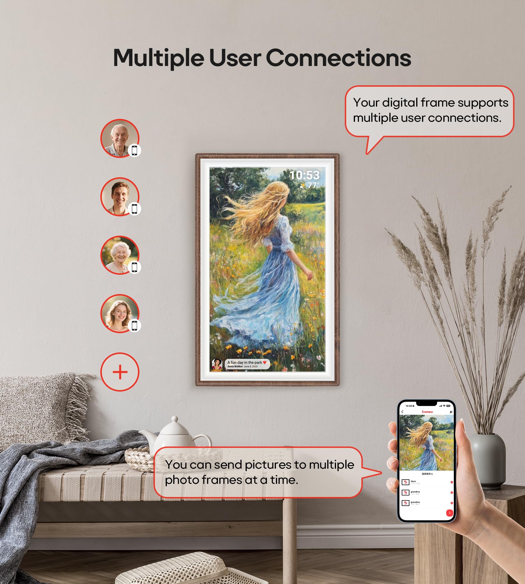 【Secure & Easy to Use】 Frameo is a professional photo management application that originated in Denmark with millions of users and is known for its security. No one can access your digital frame except the users you added. Easy to use and not limited by distance. You can use the "Frameo" APP to bind multiple frames and send photos and videos to different frames. You can also let multiple people join your frame and send you photos and videos, so families can share happy moments with each other