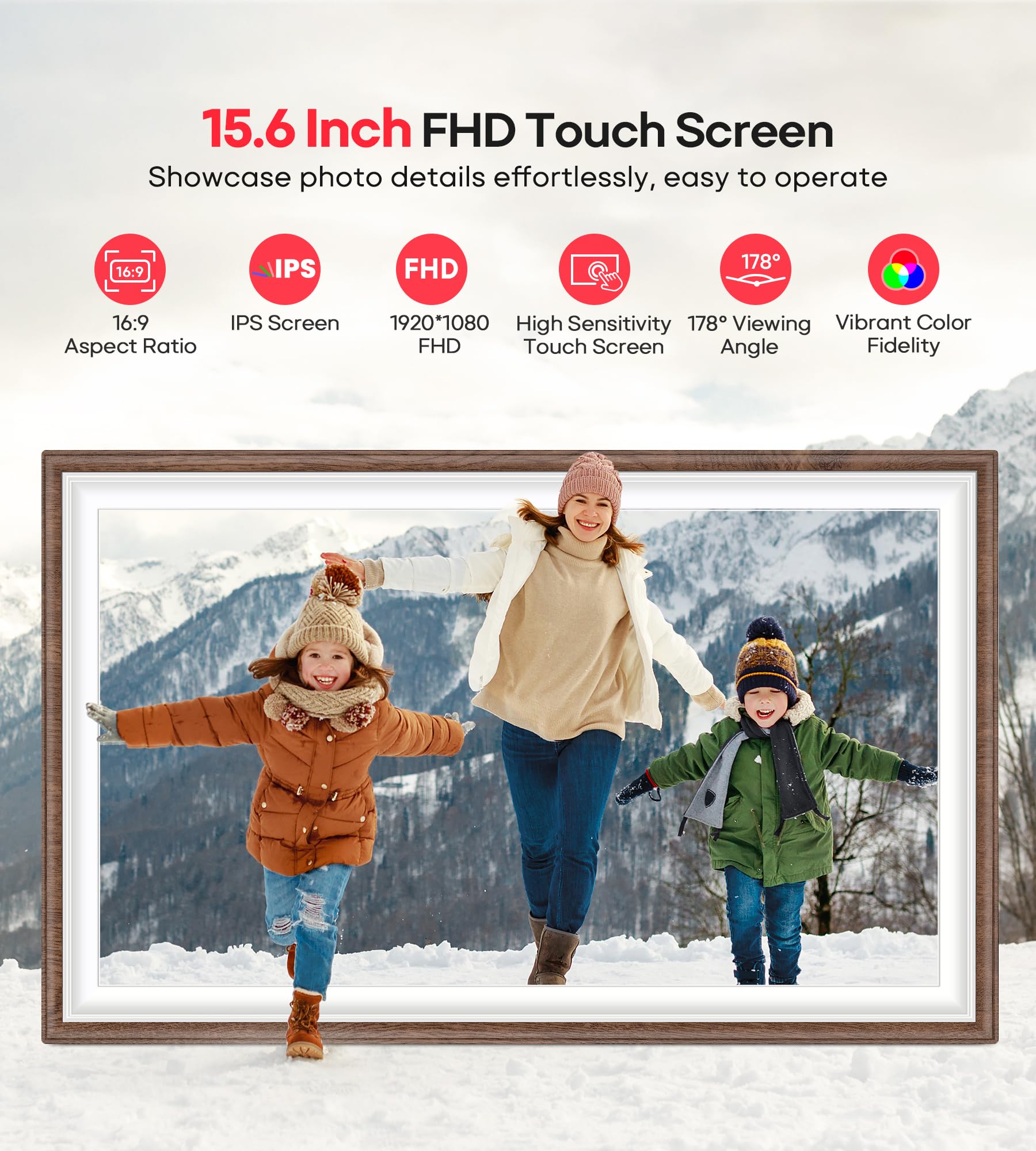 【15.6 Inch Large IPS FHD Touch Screen】The 15.6-inch large wifi digital frame is equipped with a full-view display screen with 1920x1080 pixels for vivid colors and exquisite details. The touch screen design to easily set up and view photos. Through the 15.6" smart photo frame, you can see the tiny ripples in the lake, capture the slightly raised smile at the corner of the eye, and perceive every tiny detail, which together constitute your colorful life. Supports picture formats JPG/JPEG/BMP/PNG and video format MP4. Product Dimensions: approx. 15.43 x 9.61 inch