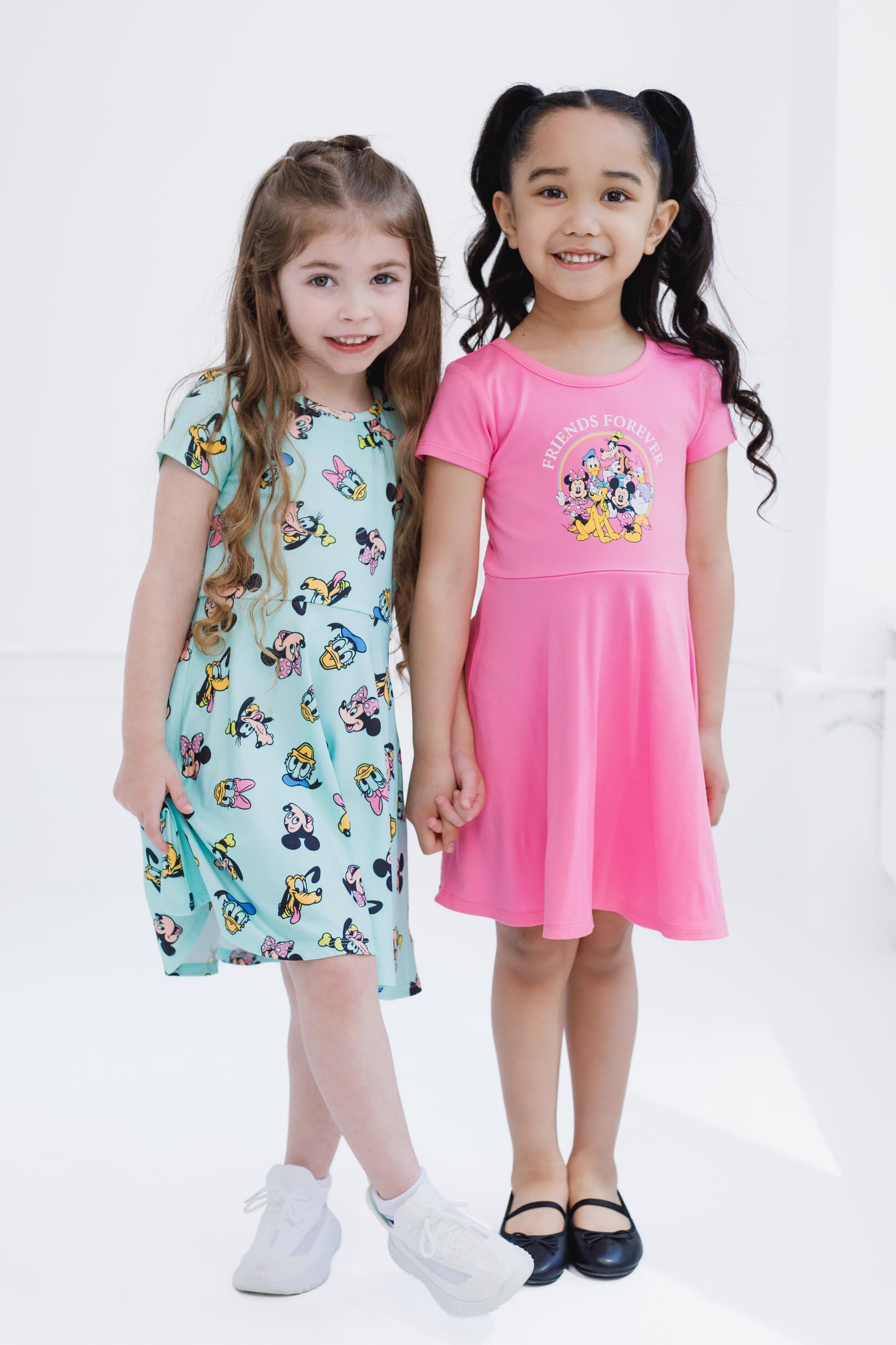Description Your little girl is ready for a day filled with Disney magic in these cute Disney dresses! This stylish set includes 2 short sleeve skater dresses featuring fun and colorful Disney artwork your kid will love to wear! Choose from vibrant designs of iconic characters like Lilo, Stitch, and Angel from Lilo and Stitch, Elsa, Anna, and Olaf from Frozen, Woody, Buzz Lightyear, Jessie, and the rest of their friends from Toy Story, Jack Skellington, Sally, and Zero the ghost dog from Nightmare Before Christmas, the iconic cats and dogs or Disney, and Mickey Mouse and friends Minnie Mouse, Donald Duck, Goofy, Daisy Duck, and Pluto. Made of a soft and lightweight material that keeps your child comfortable, these fashionable Disney dresses are the perfect outfits for all day adventure and play!