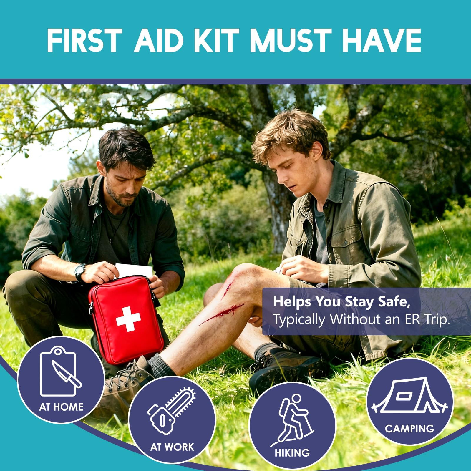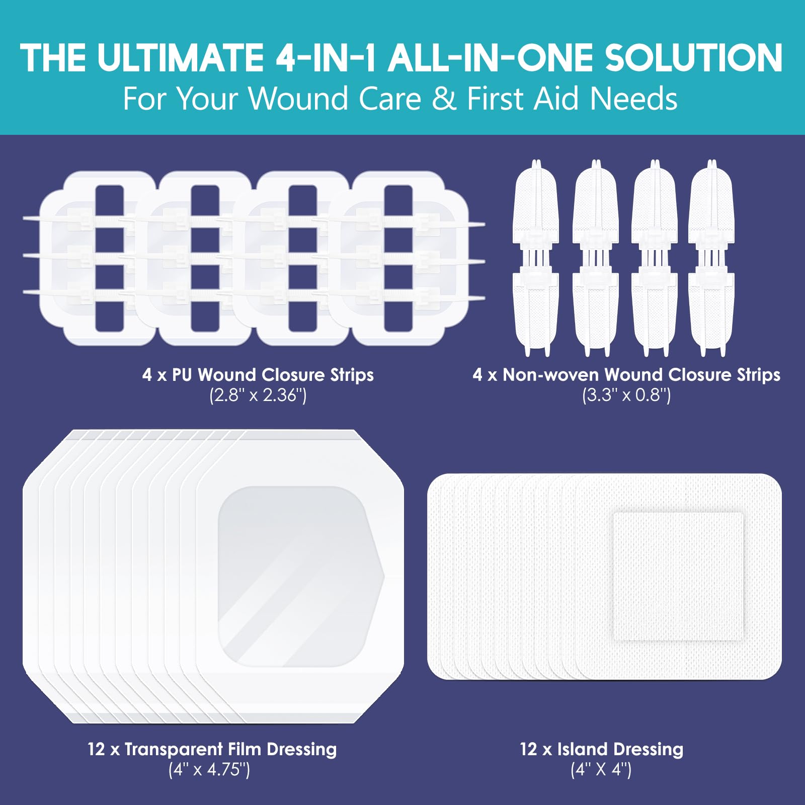 【FIRST AID KIT ESSENTIALS】Our wound closure strips kit is the perfect solution for effective emergency wound management. Each laceration closure strips kit includes: 4 x Emergency PU Wound Closure Devices, 4 x Emergency Non-woven Wound Closure Strips, 12 x Island Dressings, 12 x Waterproof Transparent Film Dressings.