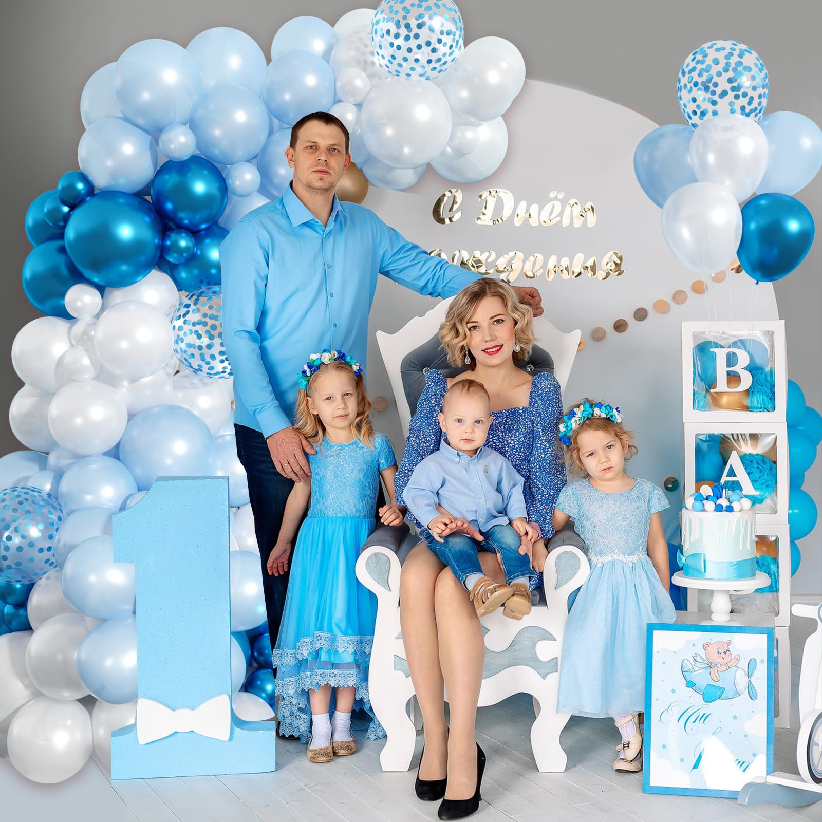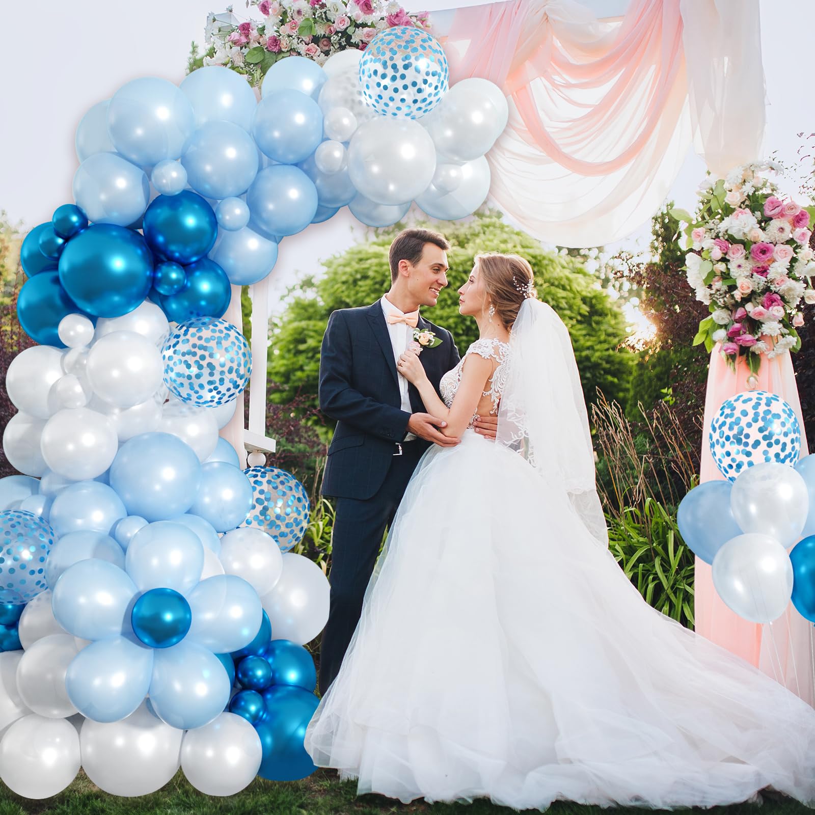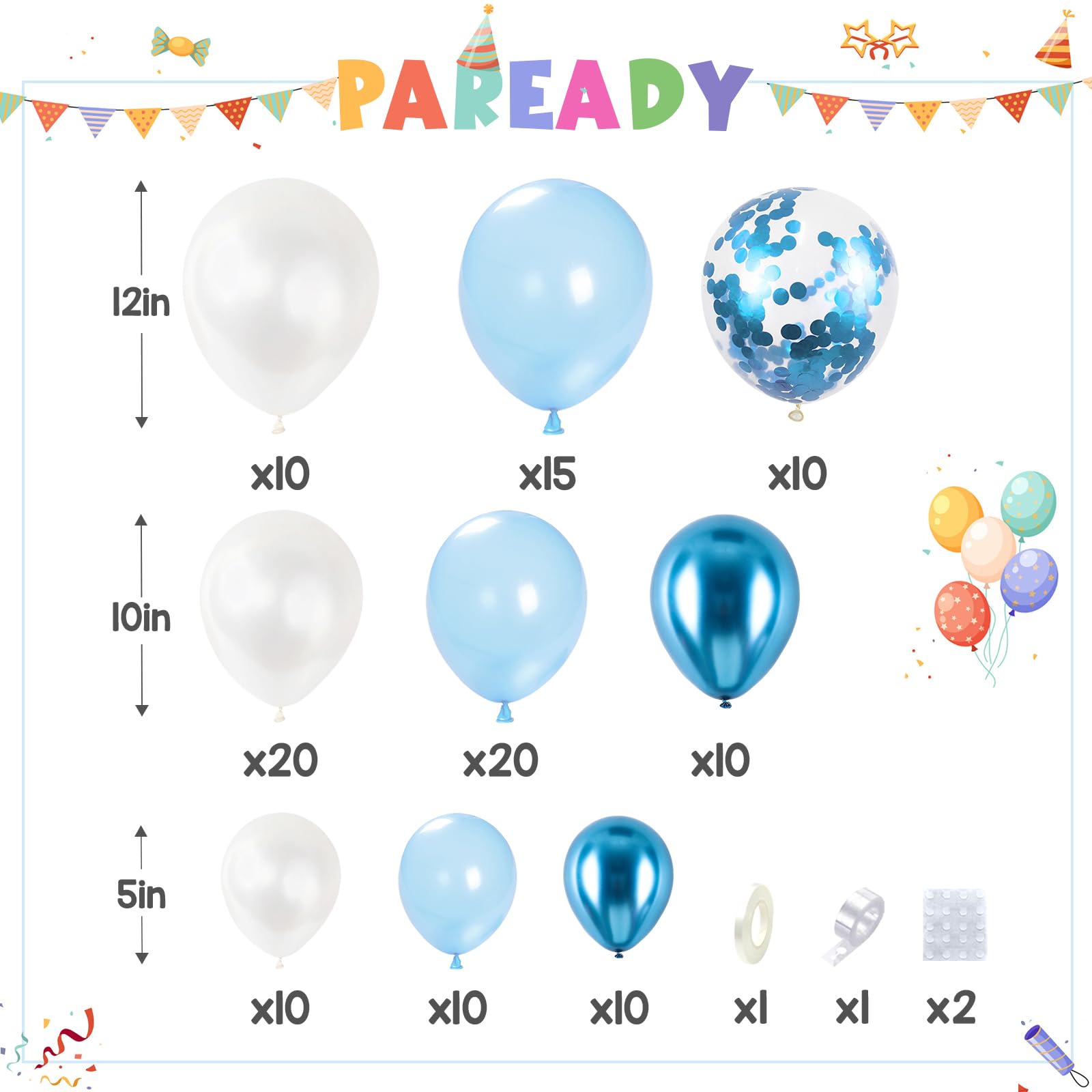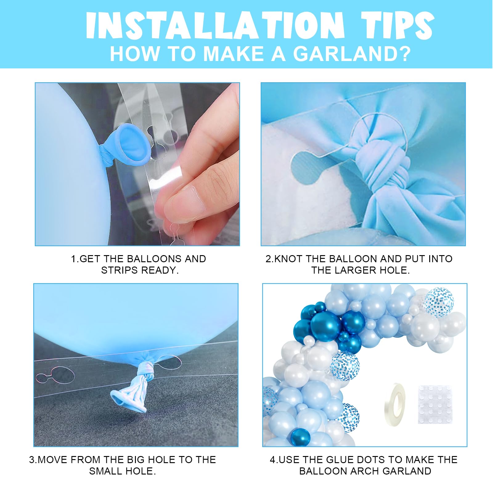 【Blue Balloon Garland Kit】 The blue balloons arch kit included pear light blue, pear white, metallic blue, blue confetti balloons for size of 5, 10, 12 inches. Equipped with 1 white ribbon, 1 roll of balloon chains, 2pcs dispensing adhesive. With this balloon arch kit, you can create the nice balloon garland for any event.
