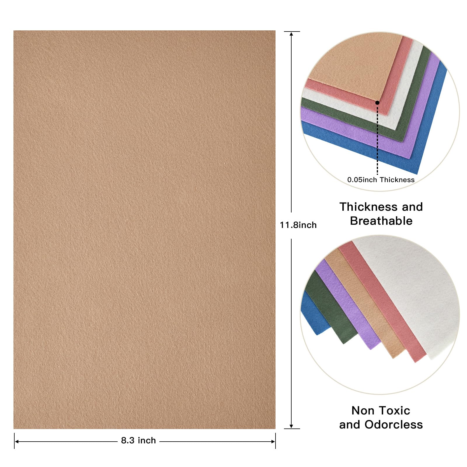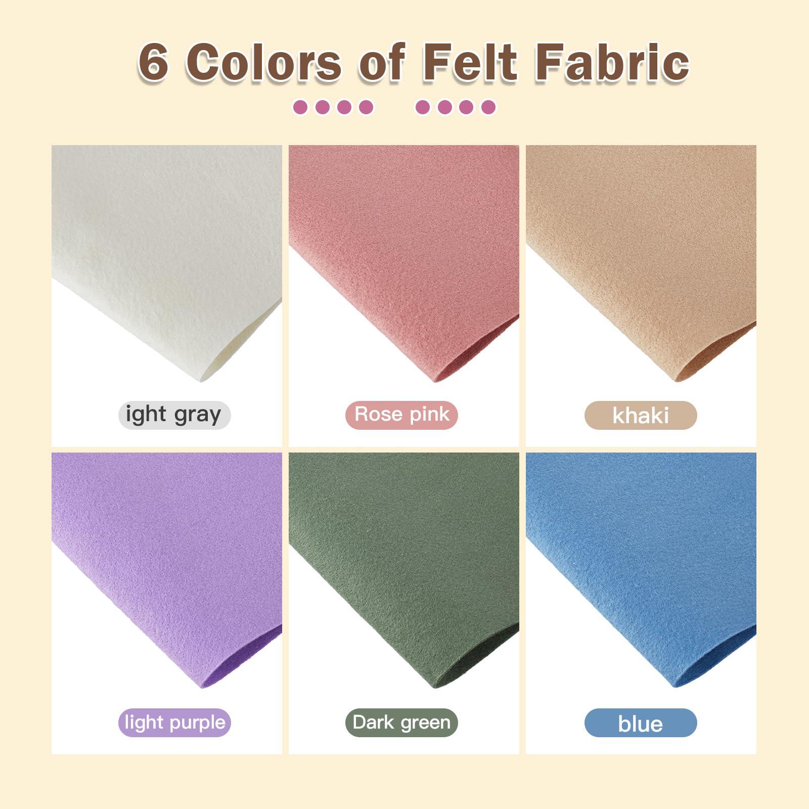 【Wide Variety of Colors and Quality Material】Felt sheets 6 colors to choose from, our felt sheets offer endless possibilities for all your crafting needs. each felt pack includes 6 pieces of 1mm thick felt sheets made of staple fiber + polypropylene - soft felt to the touch yet firm enough to handle any project.