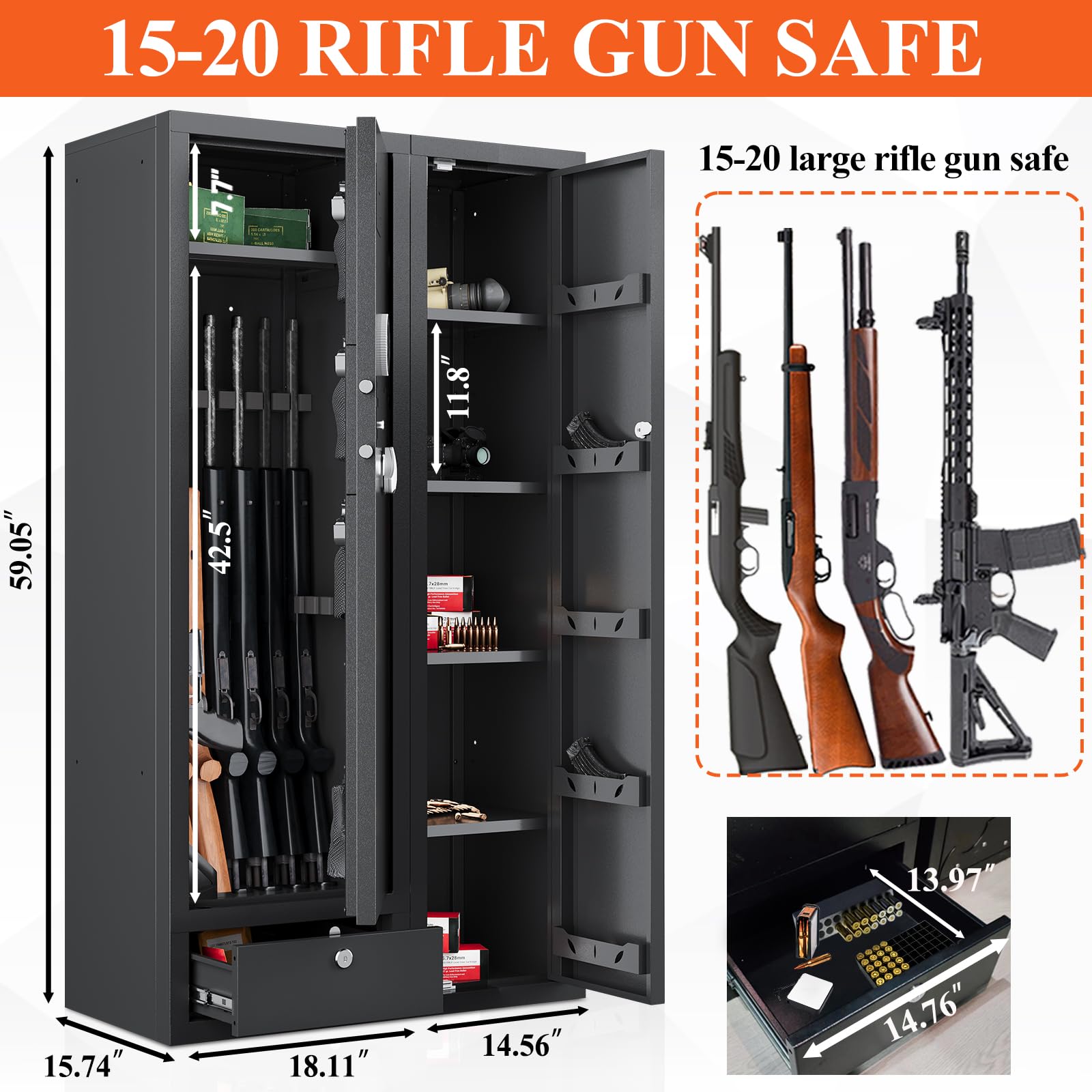 【15-20 Rifle Gun Safe】: the new upgraded gun safe has more available space, the gun cabinets external dimensions : H59.05" x W18" x D15.7". The gun safe can hold up to 15-17 rifles/shotguns (with/without scopes).Inside the gun cabinet has three gun stocks accompanied with an adjustable removable buttstock; 3 magazine bandages, 3 pistol pouches, a Mesh Pouch and a Storage Pouch on the inside door of the gun safe.