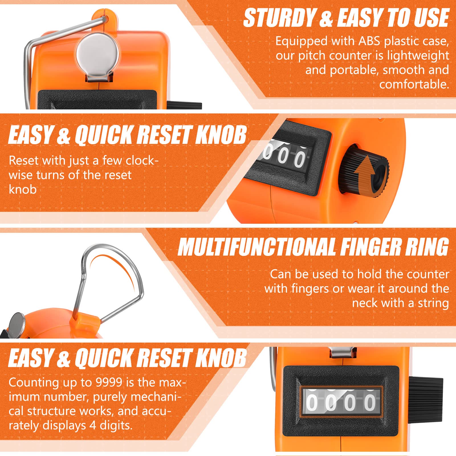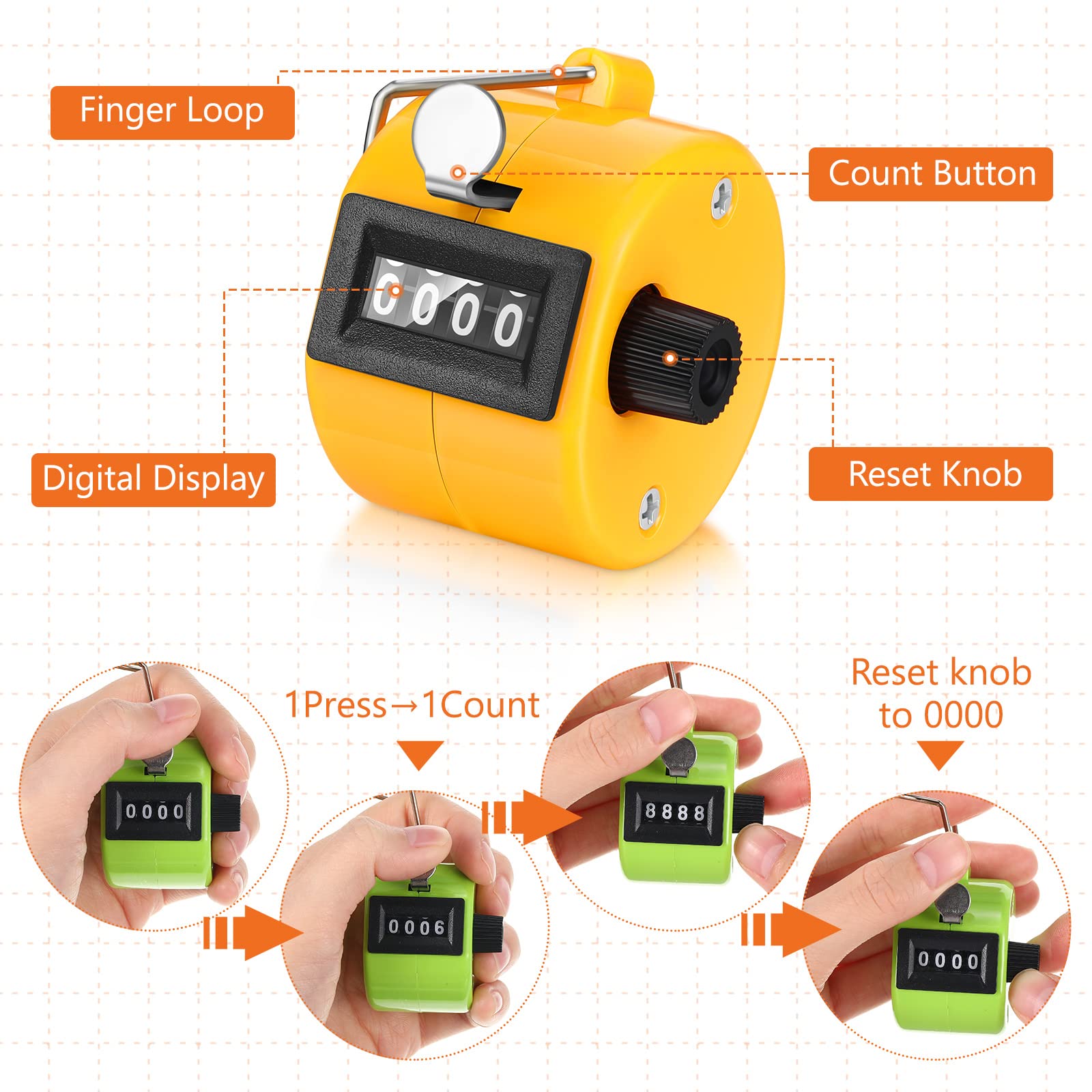 No Batteries Needed: our counter clicker is no batteries required; When you press it, the counter will react and count accurately; The counter counts up from 0 to 9999 with a reset knob, and it supports immediate reset, you only need to rotate a few clockwise to reset easily and quickly, without the need to cycle display 9999