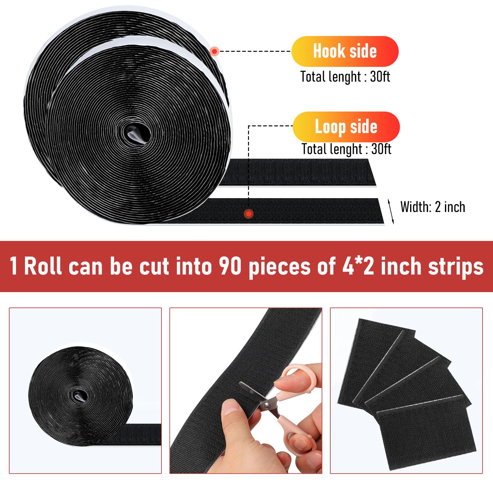 【Cut Freely】:One set contains 1 roll of hook tape and 1 roll of loop tape. Each roll measures 30 feet in length and 2 inches in width, providing ample material for a variety of needs. The box also comes with a pair of scissors and a retractable tape measure for easy cutting measurement
