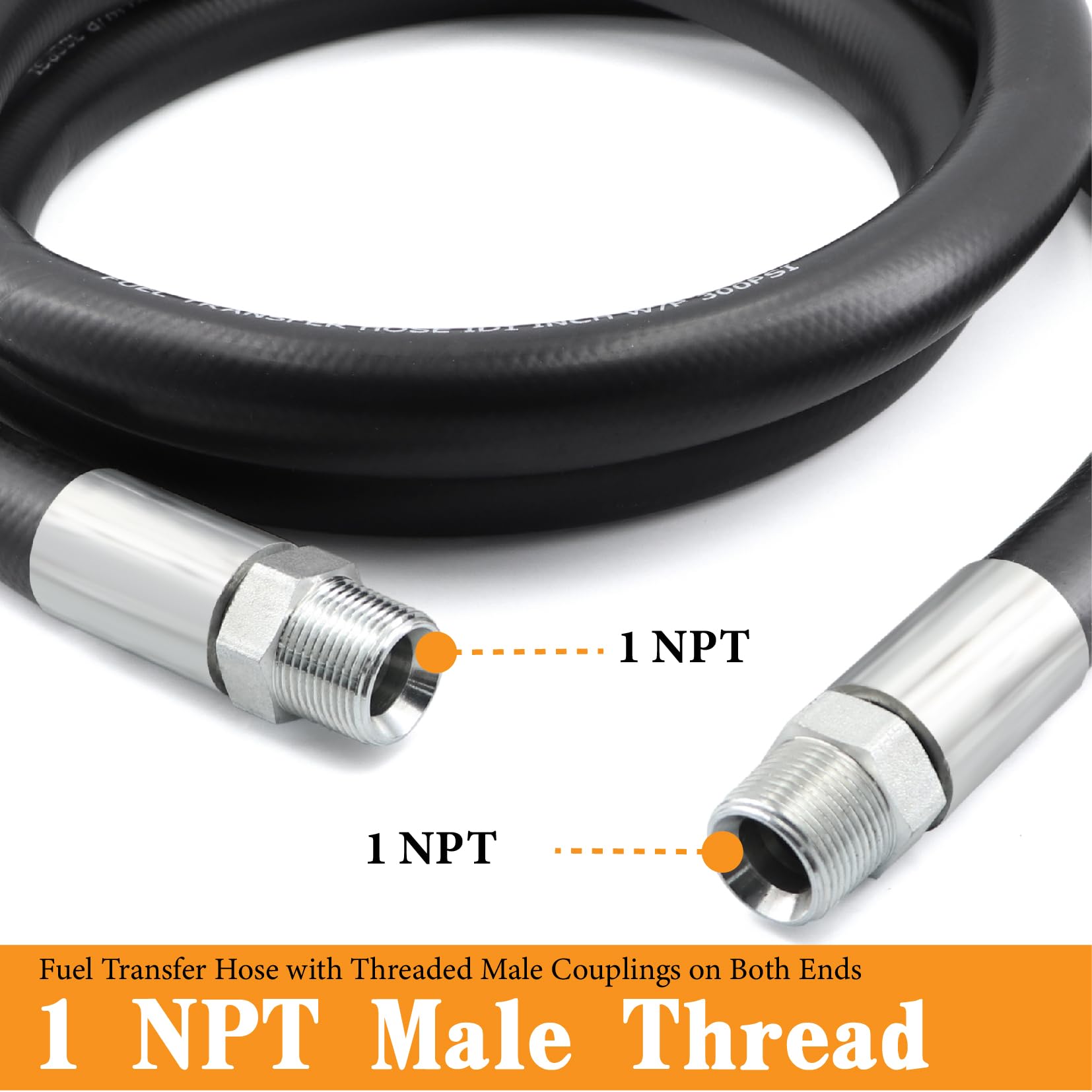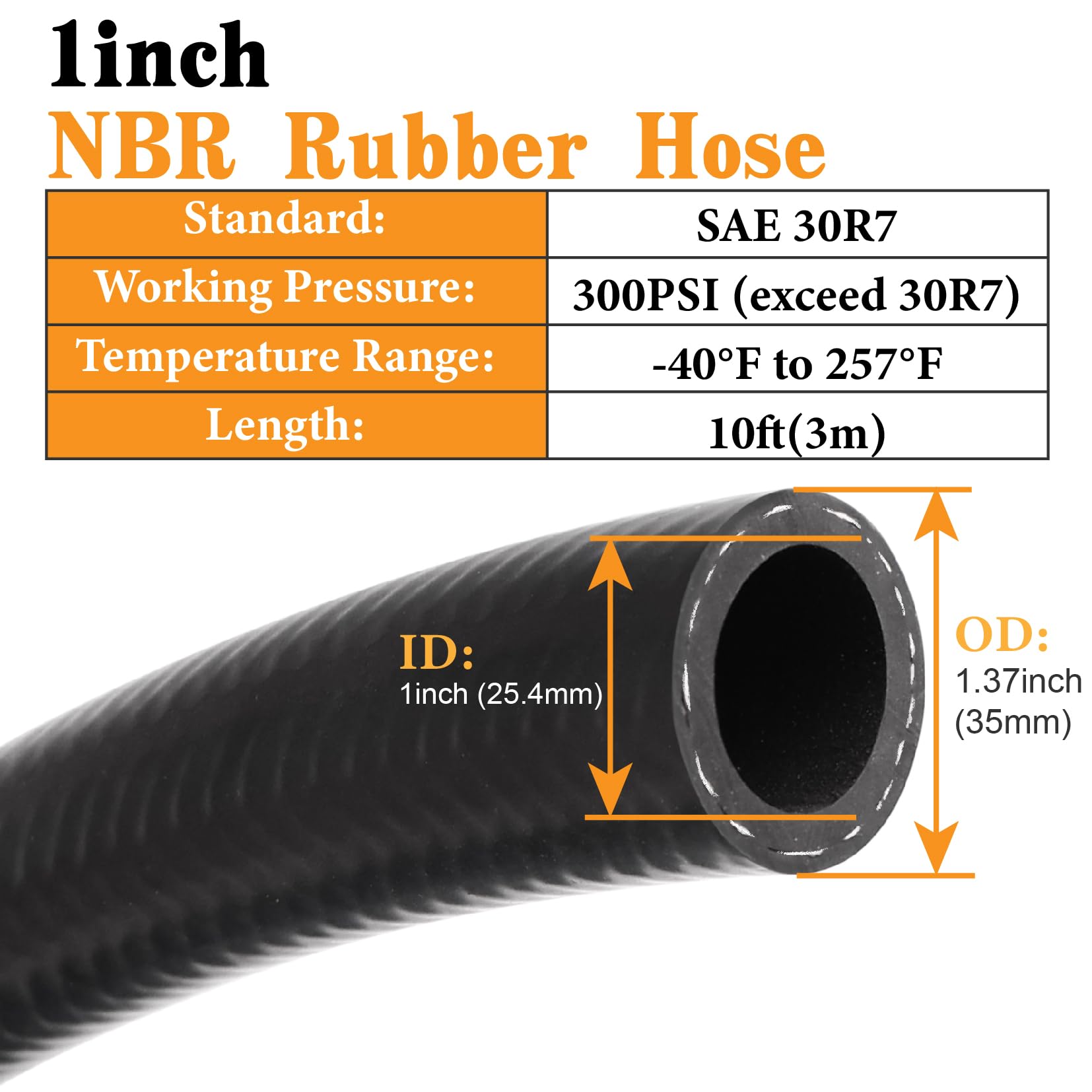 Hose ID: 1-inch(25mm);OD: 35.5mm;Length: 10feet(3.05m);Min. bending radius: 300mm.connector: 1 NPT