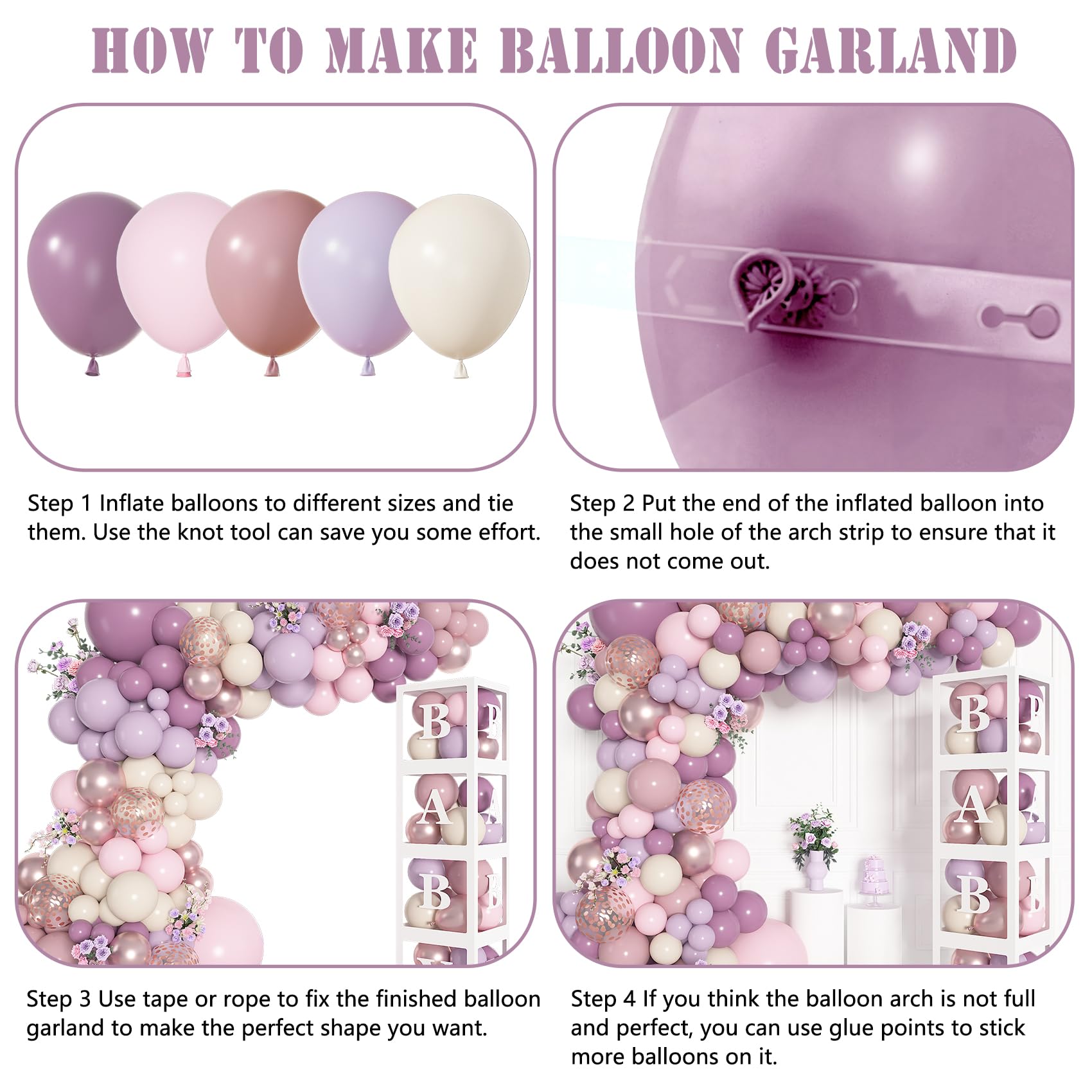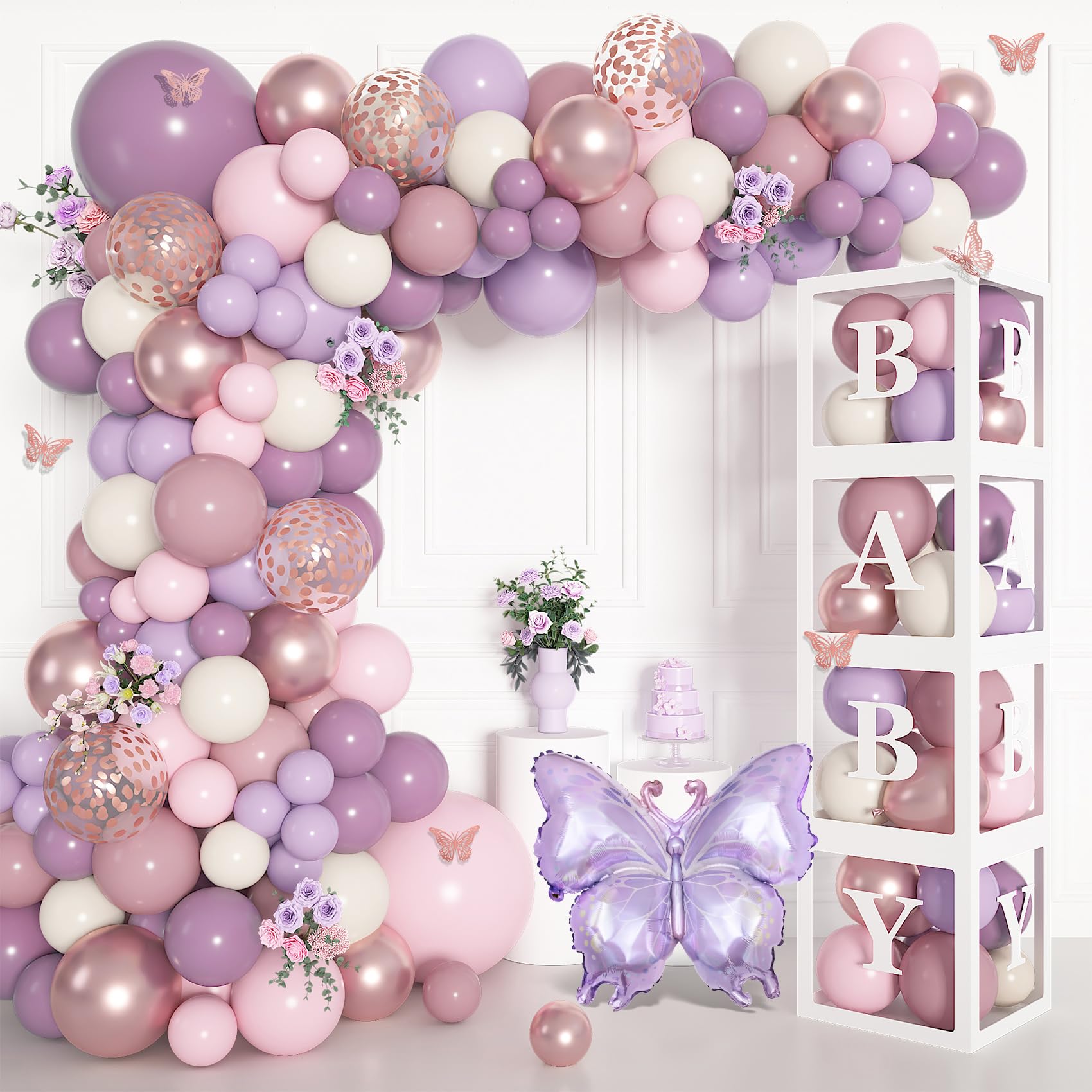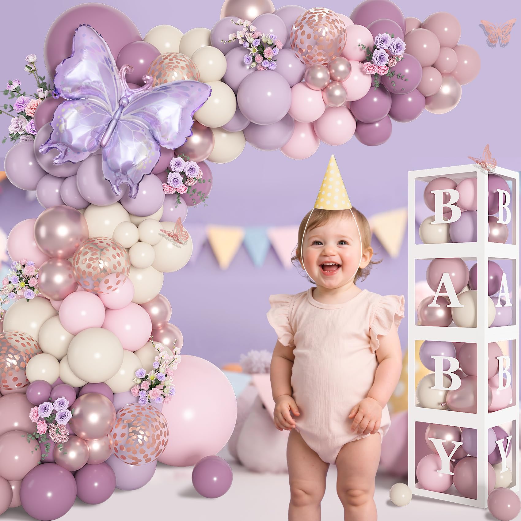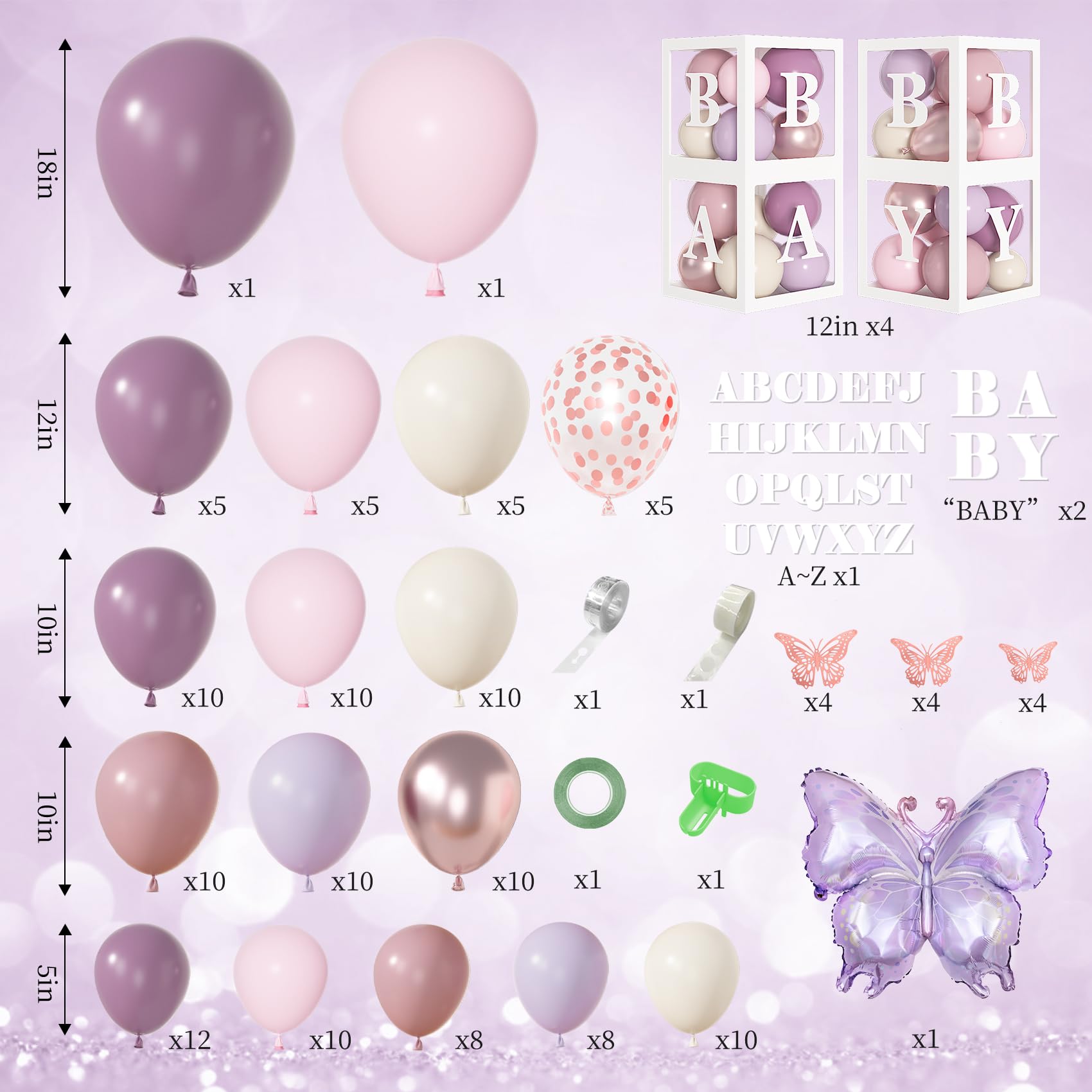 Purple Baby Shower Decorations: 1 pcs foil butterfly balloons, 4 pcs baby boxes with 1 set 26 letters and 1 set BABY letters, 12 pcs butterfly stickers, 2 pcs 18" double-stuffed pink/dusty purple balloons, 20 pcs 12" rose gold confetti/dusty purple/white sand/double-stuffed pink balloons, 60 pcs 10" metallic rose gold/dusty purple/white sand/double-stuffed pink/lavender/dusty pink balloons, 48 pcs 5" dusty purple/double-stuffed pink/lavender/dusty pink/white sand balloons, 4 pcs balloon tools