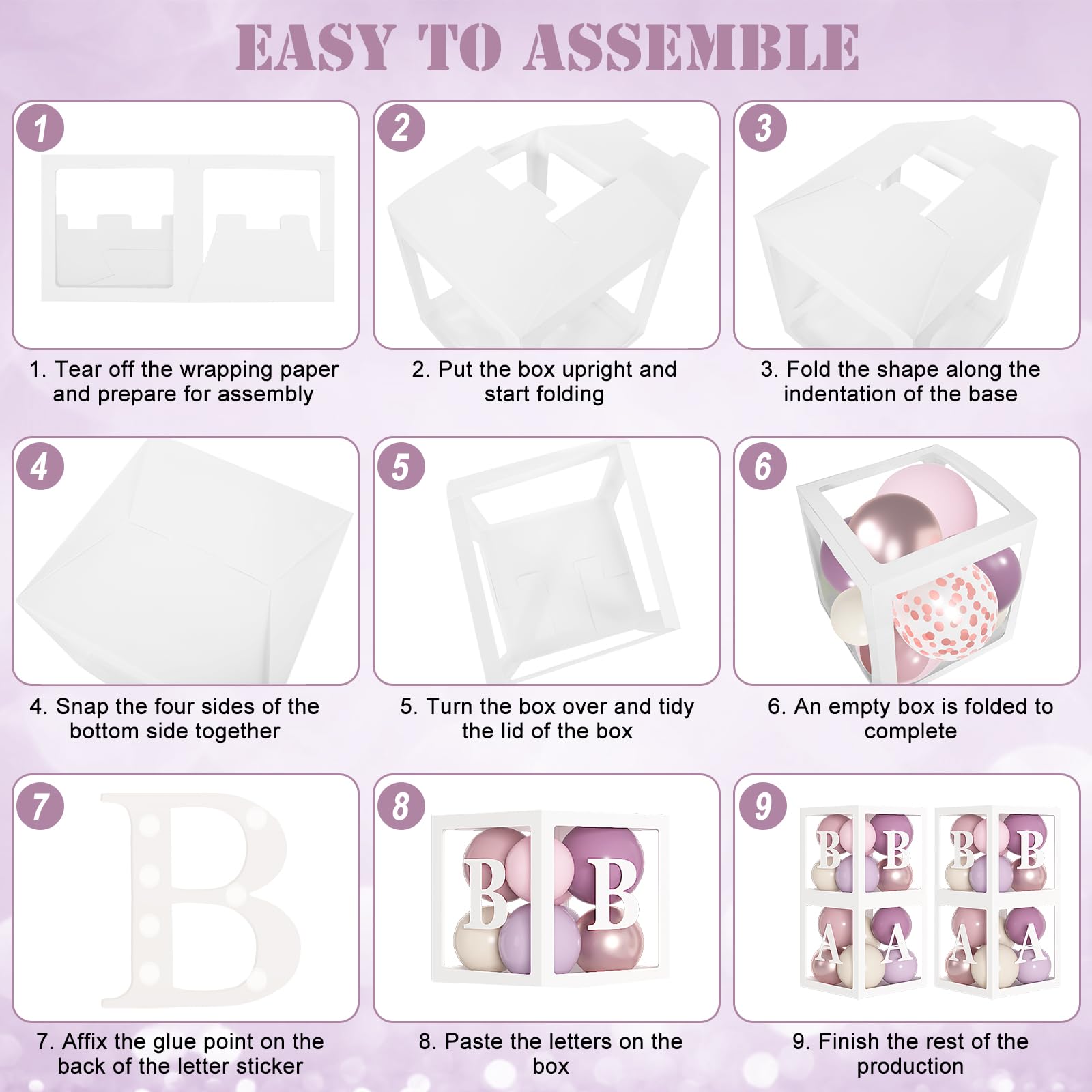 Convenient to Use: The baby boxes with letters for baby shower come pre-folded and you can easily set up with steps in pictures; Baby shower decorations for girl also comes with 4 accessories, including balloon arch strip, glue points, tying tool and ribbon to help you build beautiful pink and purple balloons to enrich your party decorations