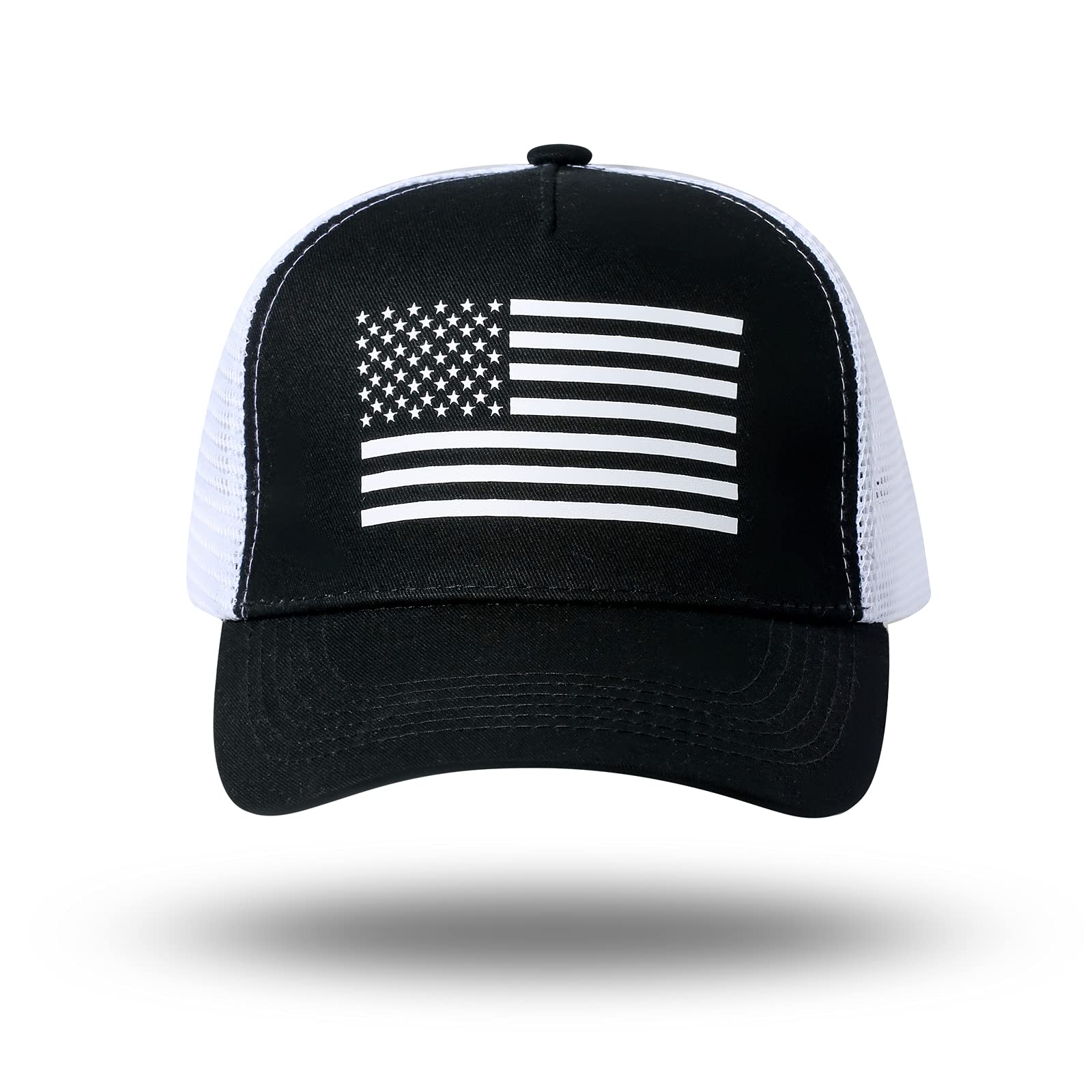 SHOW OFF YOUR PATRIOTIC SIDE - Wear your love for country with pride with these American flag hats for men and women. The front of this USA hat features a printed blacked out American flag design