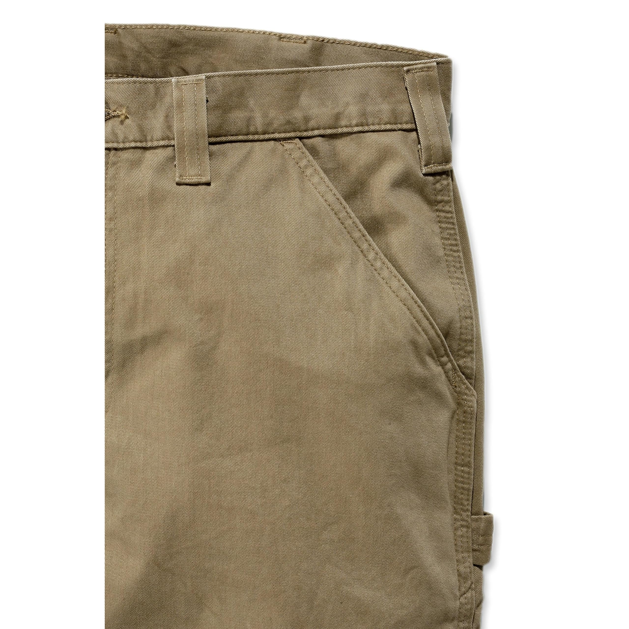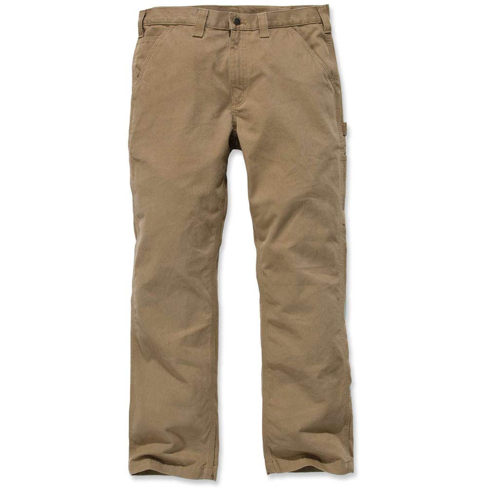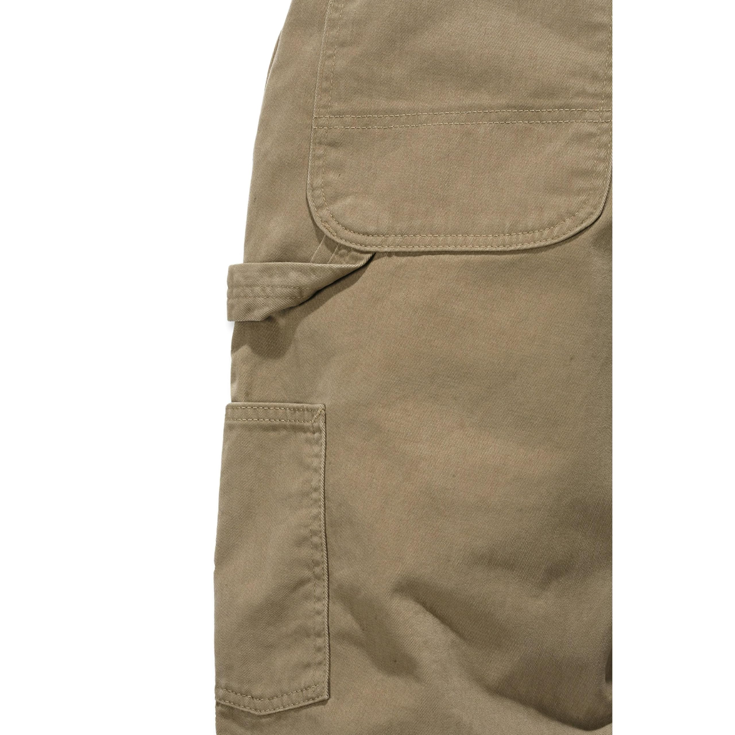 Description Carhartt's washed twill dungaree combines all-day comfort with long-lasting toughness. constructed of 9.25-ounce, 100% cotton ring-spun washed twill with a relaxed-fitting seat and thighs, it sits slightly below the natural waist. well outfitted, it includes multiple tool and utility pockets, a left-leg hammer loop, and two reinforced back pockets. the leg openings are sized to fit over boots.