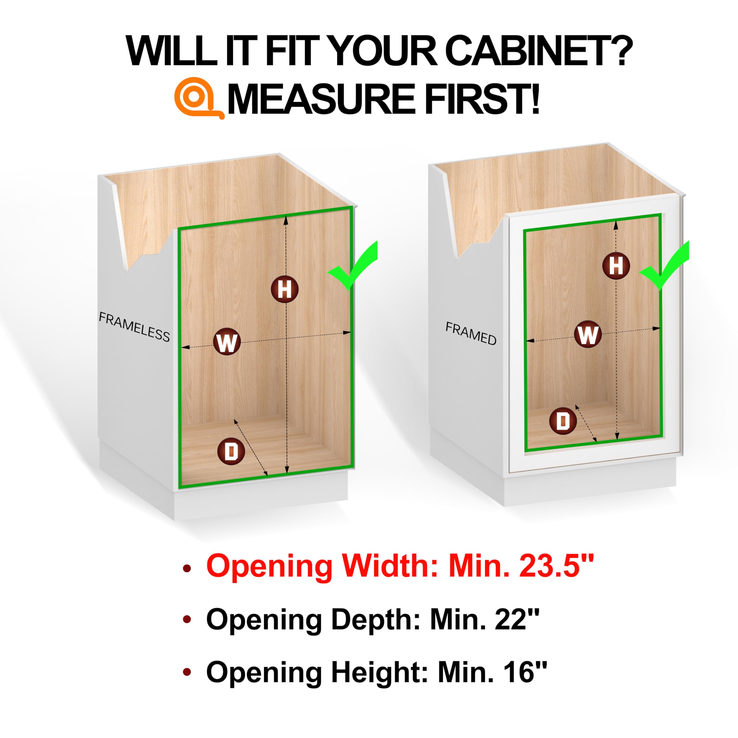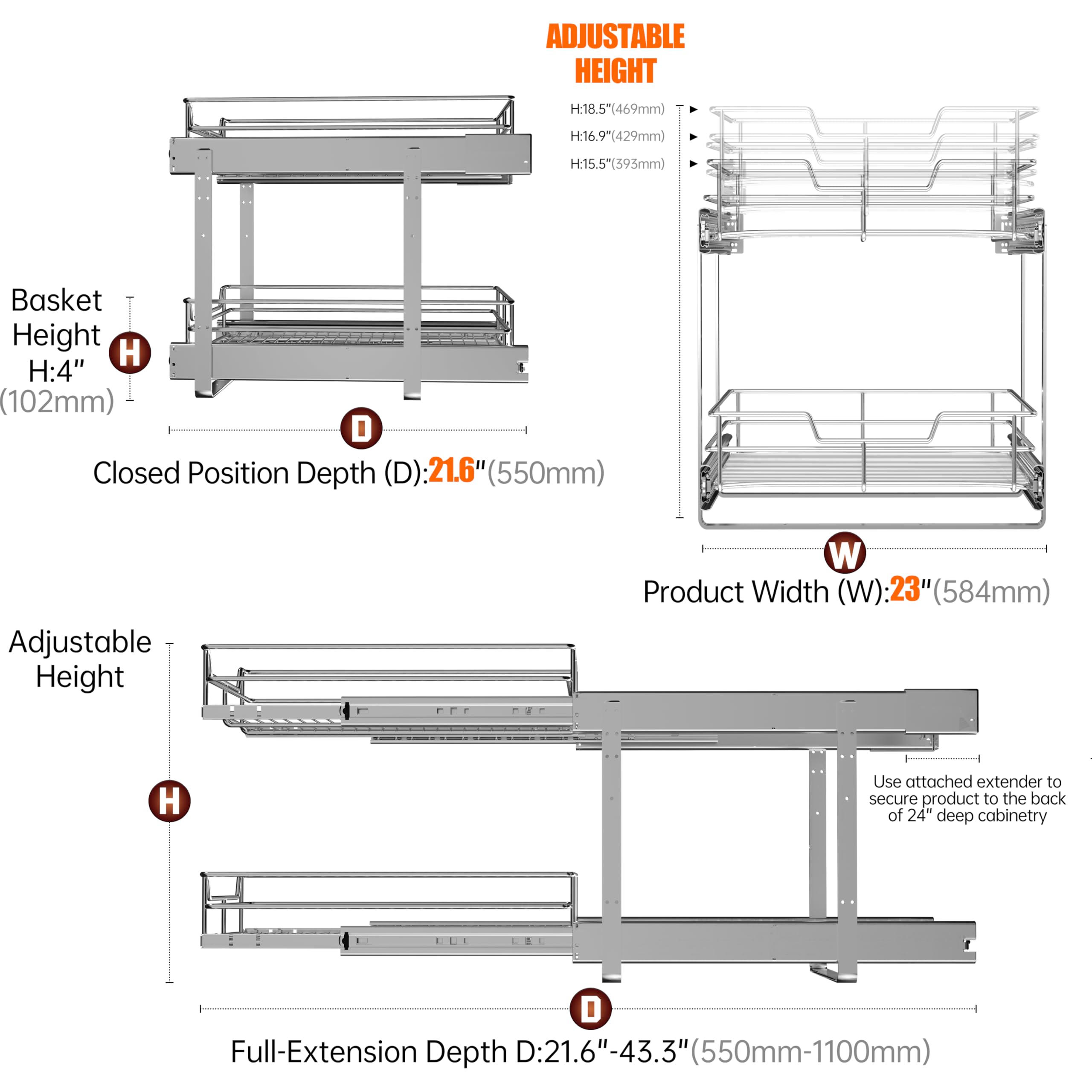 FITS 24" CABINET OPENINGS: DIMENSIONS: 23"W x 22"D x 18.3"H. This sliding cabinet organizer pull out shelves system is specifically designed for standard 24-inch wide cabinet openings. Please confirm your measurements for a perfect installation