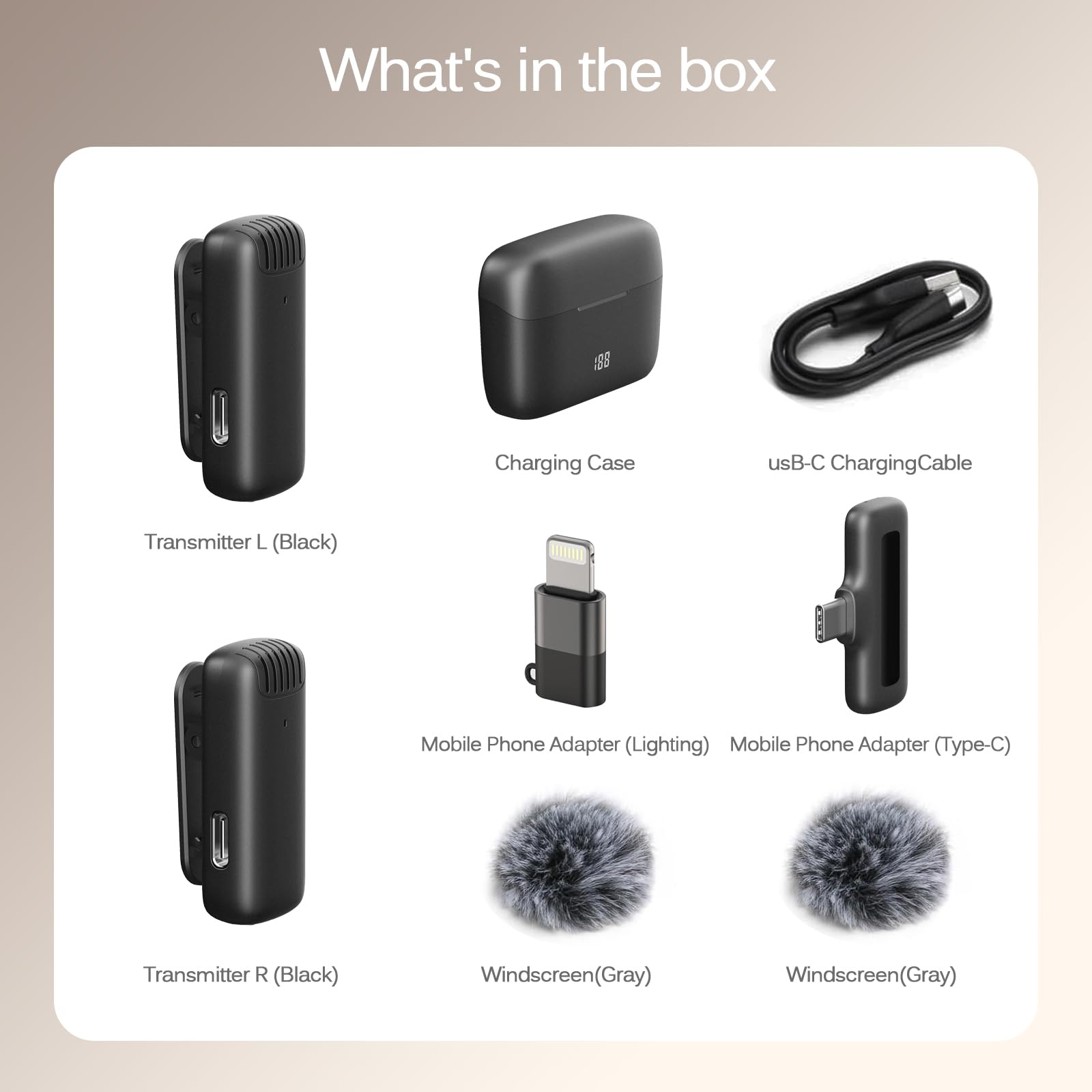 Warranty for the kit: Rechargeable Wireless Microphones with Receiver kit, User Manual, USB-C charging Cable, once purchased, enjoys lifetime VIP customer service, any question, contact us for faster solutions.