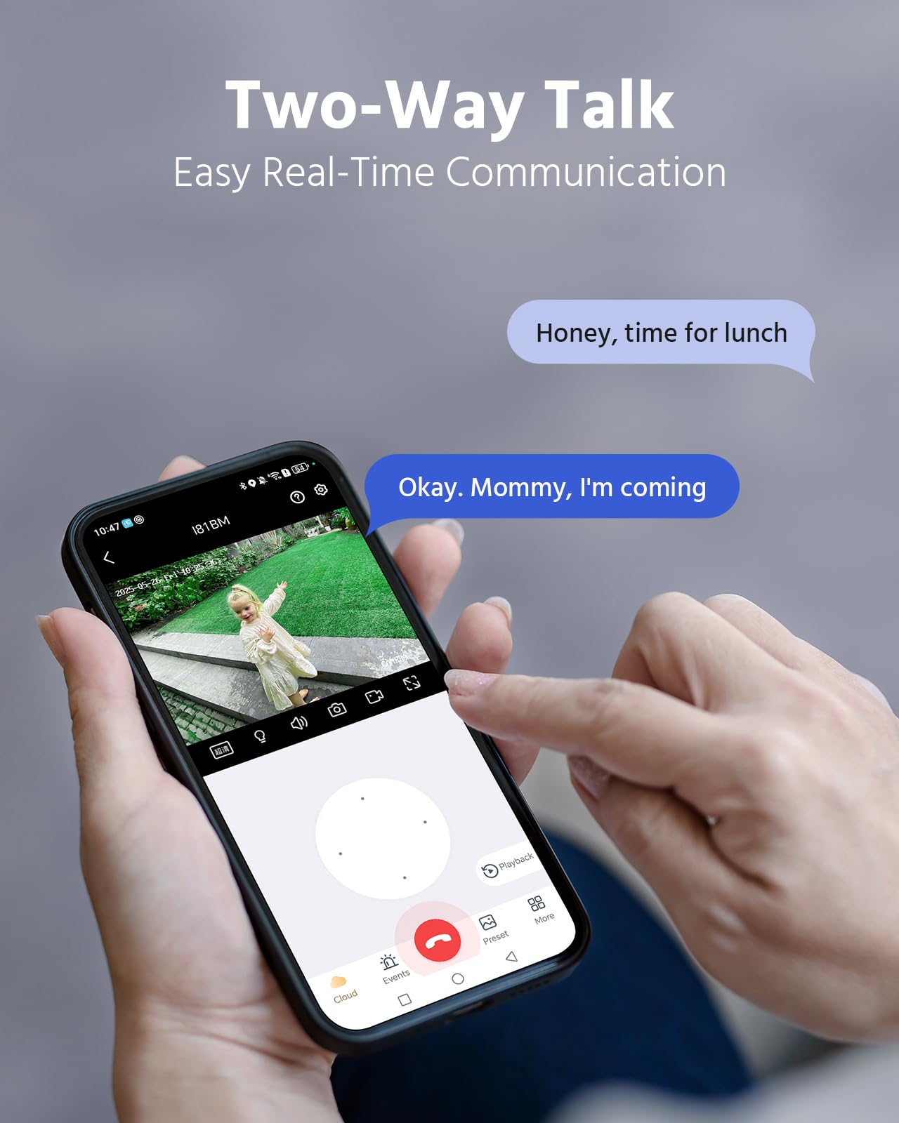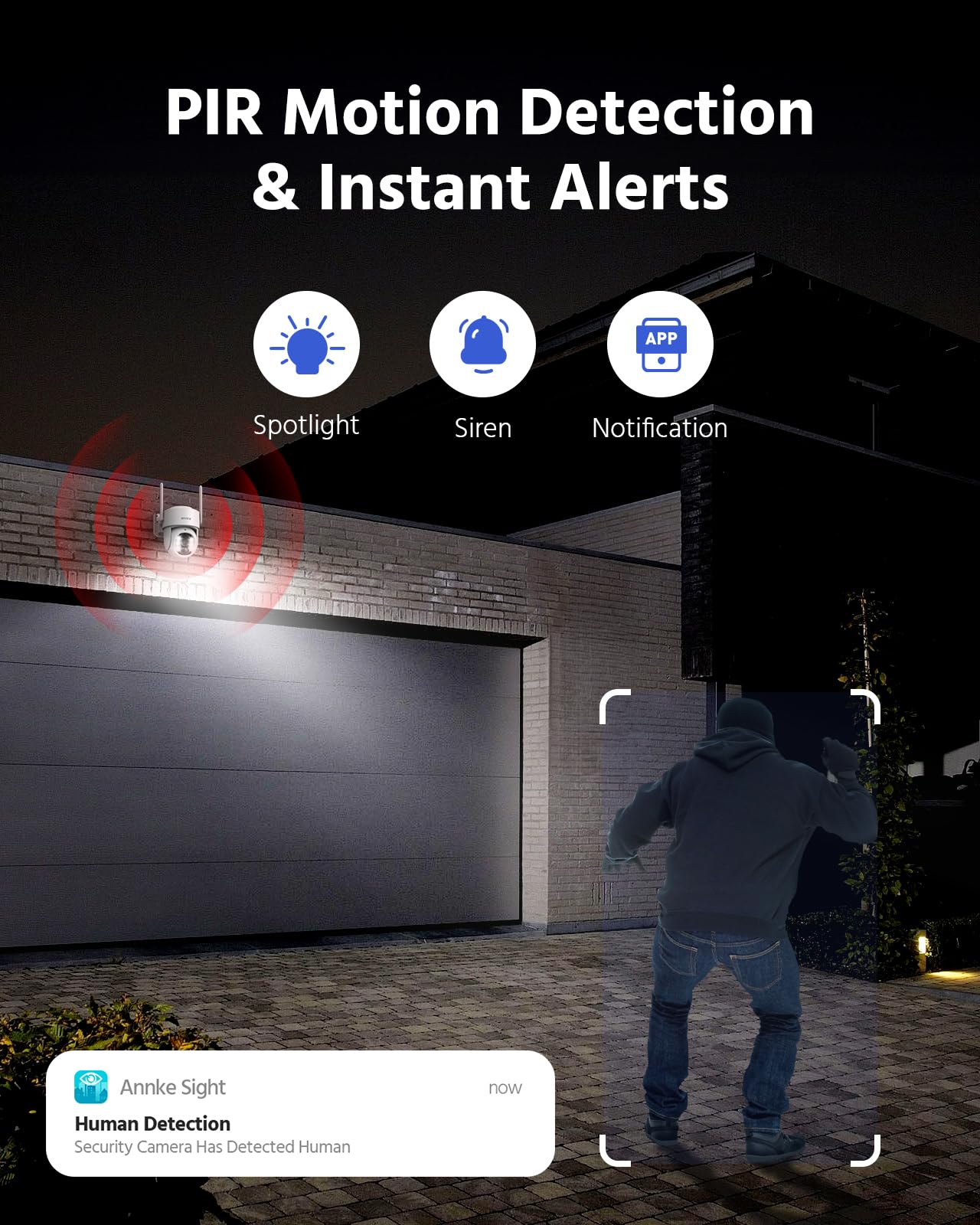 【Smart AI Detection & 2-Way Audio】AI-powered human detection sends instant app alerts with snapshots - minimizing false alarms from pets or leaves. Two-way audio lets you warn intruders in real-time, while built-in siren & strobe light automatically scare them away.