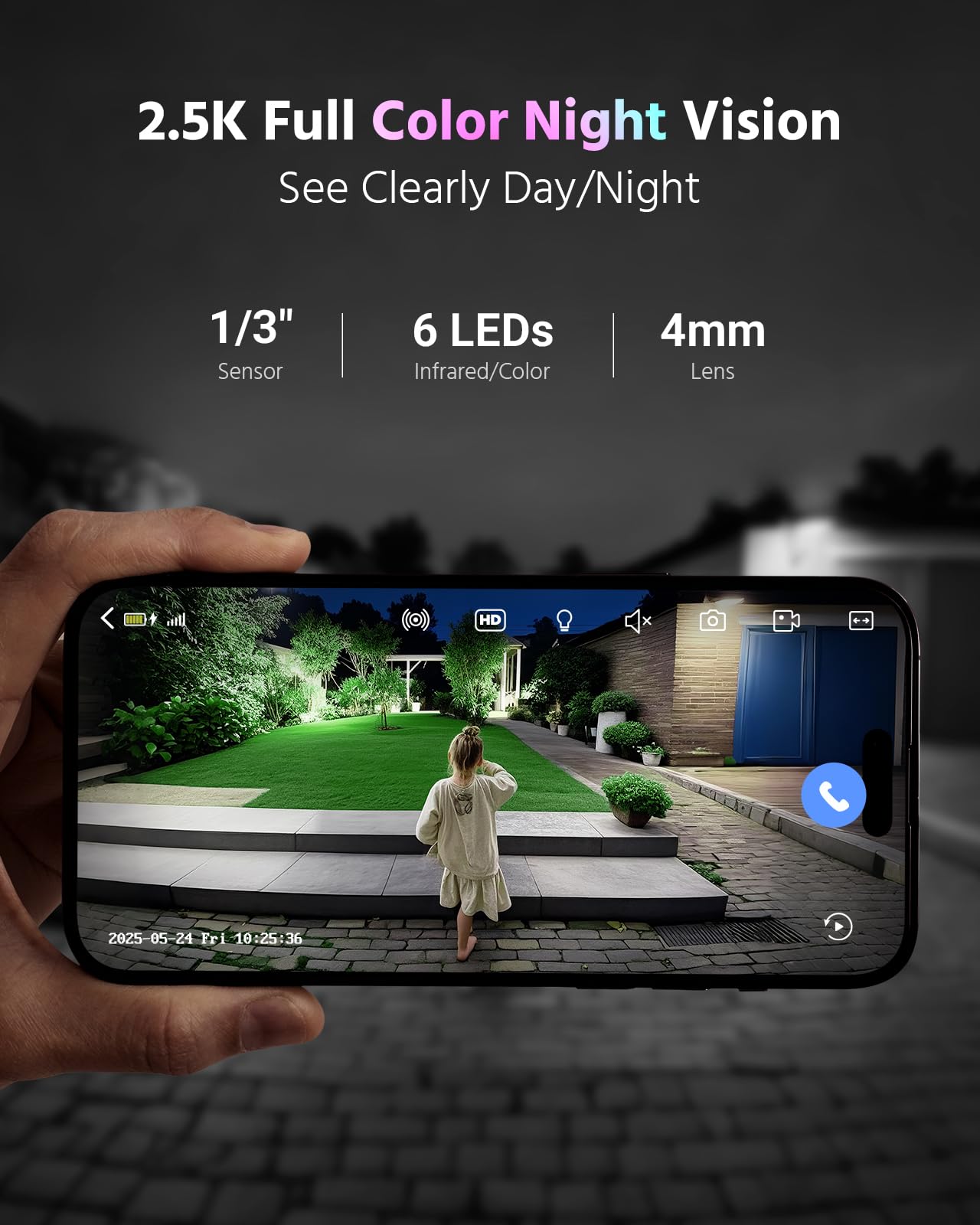 【4MP Full Color Day & Night Vision】Experience crystal-clear 4MP (2560x1440) resolution with true color night vision (spotlight activated) and 15m IR night vision. See facial details and license plates day or night - no more blurry, grainy footage that misses critical details.