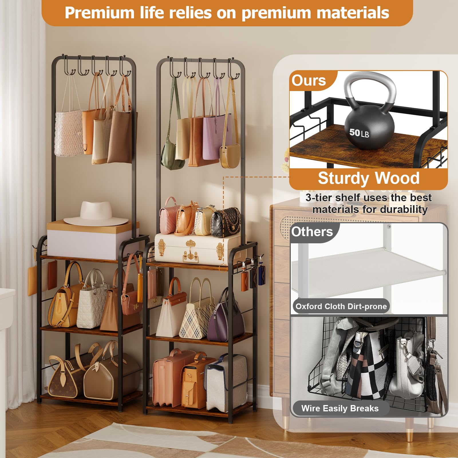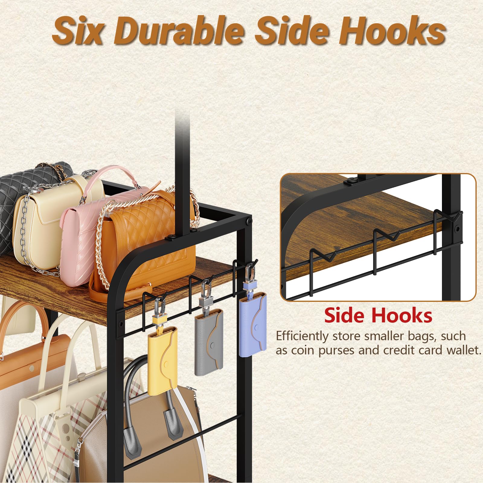 【3-Tier Purse Organizer with 5 Hangers & 6 Side Hooks】Holds 20+ totes, clutches & wallets using sturdy top purse hangers, deep shelves & extra side hooks – powerful purse rack & handbag organizer for closet.