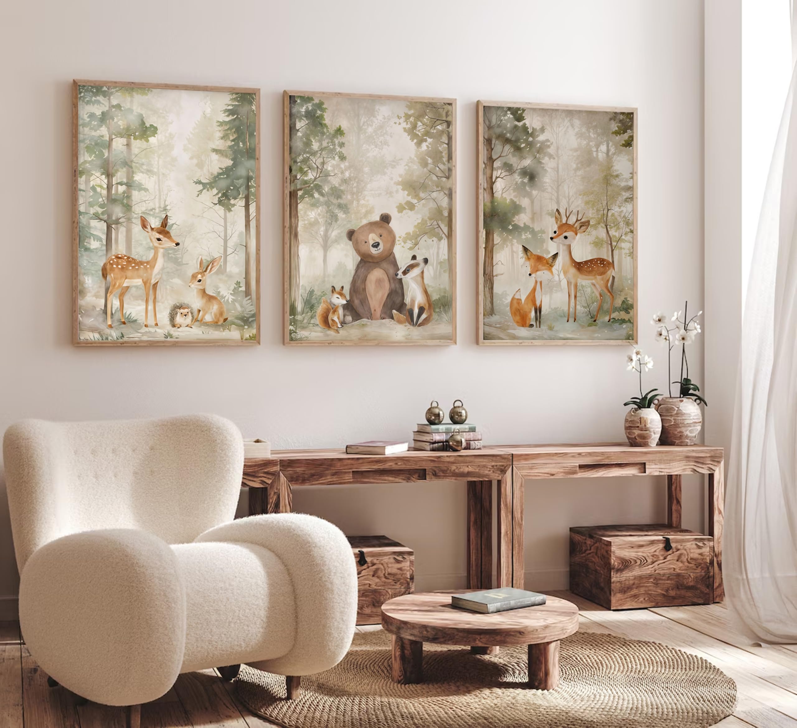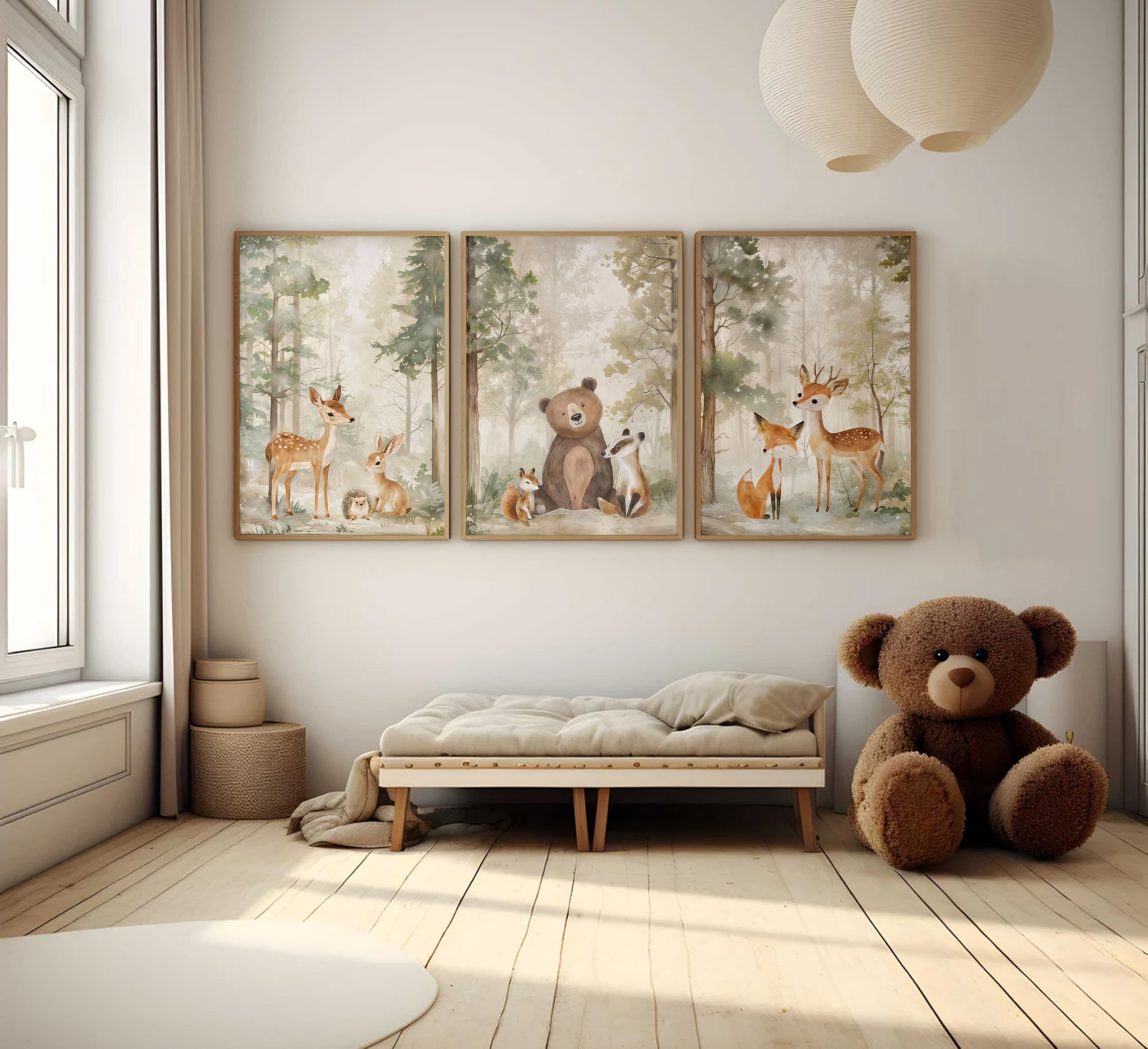 Woodland Animal Nursery wall art: This Woodland Animal nursery wall decor for boys girls, beige and green bedroom wall art nursery decor is perfect for babyboy/babygirl. The nursery animal wall art includes Deer, fox and bear, a completely wild woodland theme nursery decor