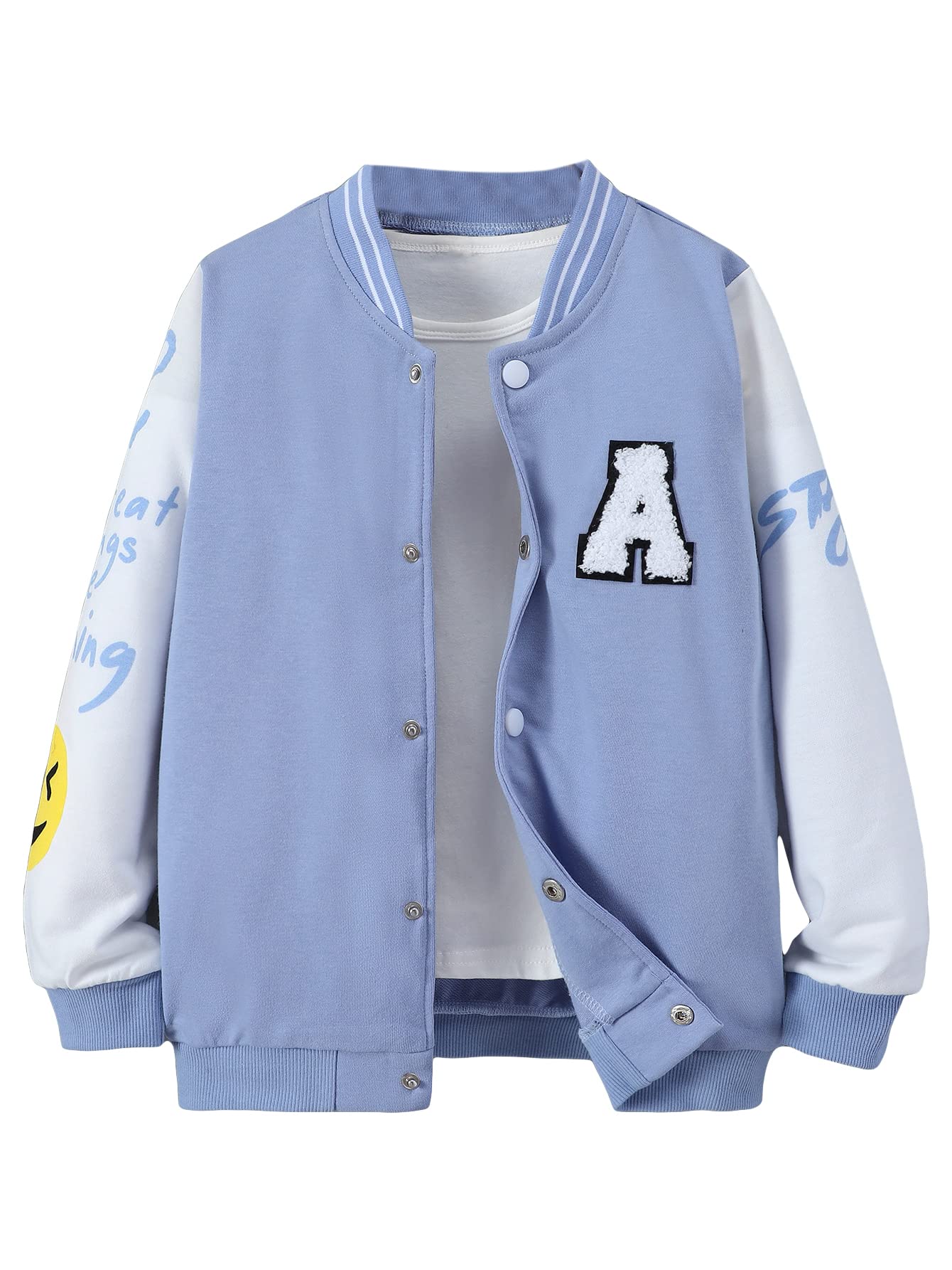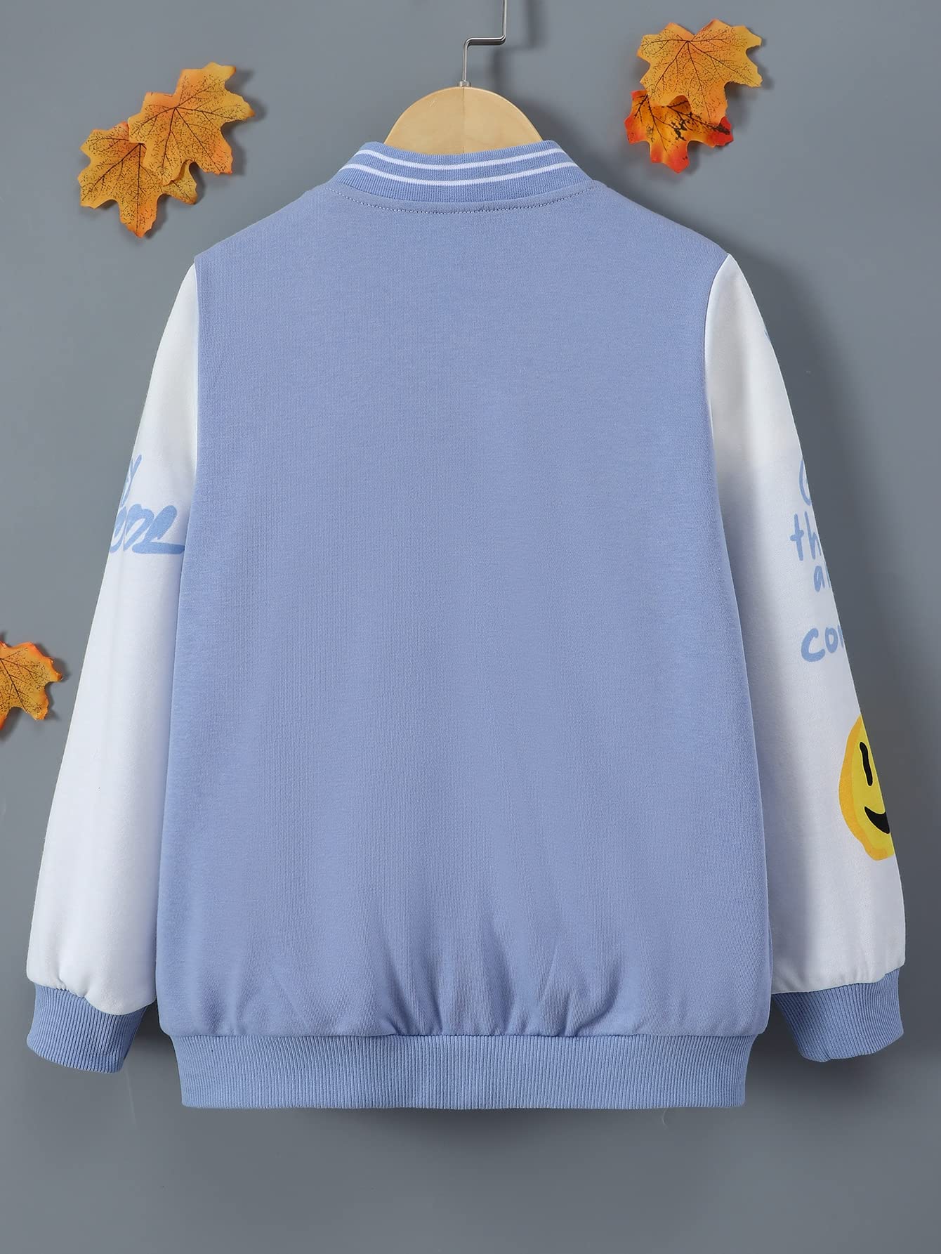 Features: baseball jacket, cartoon and letter prints, long sleeve, snap button, varsity style, causal outerwear