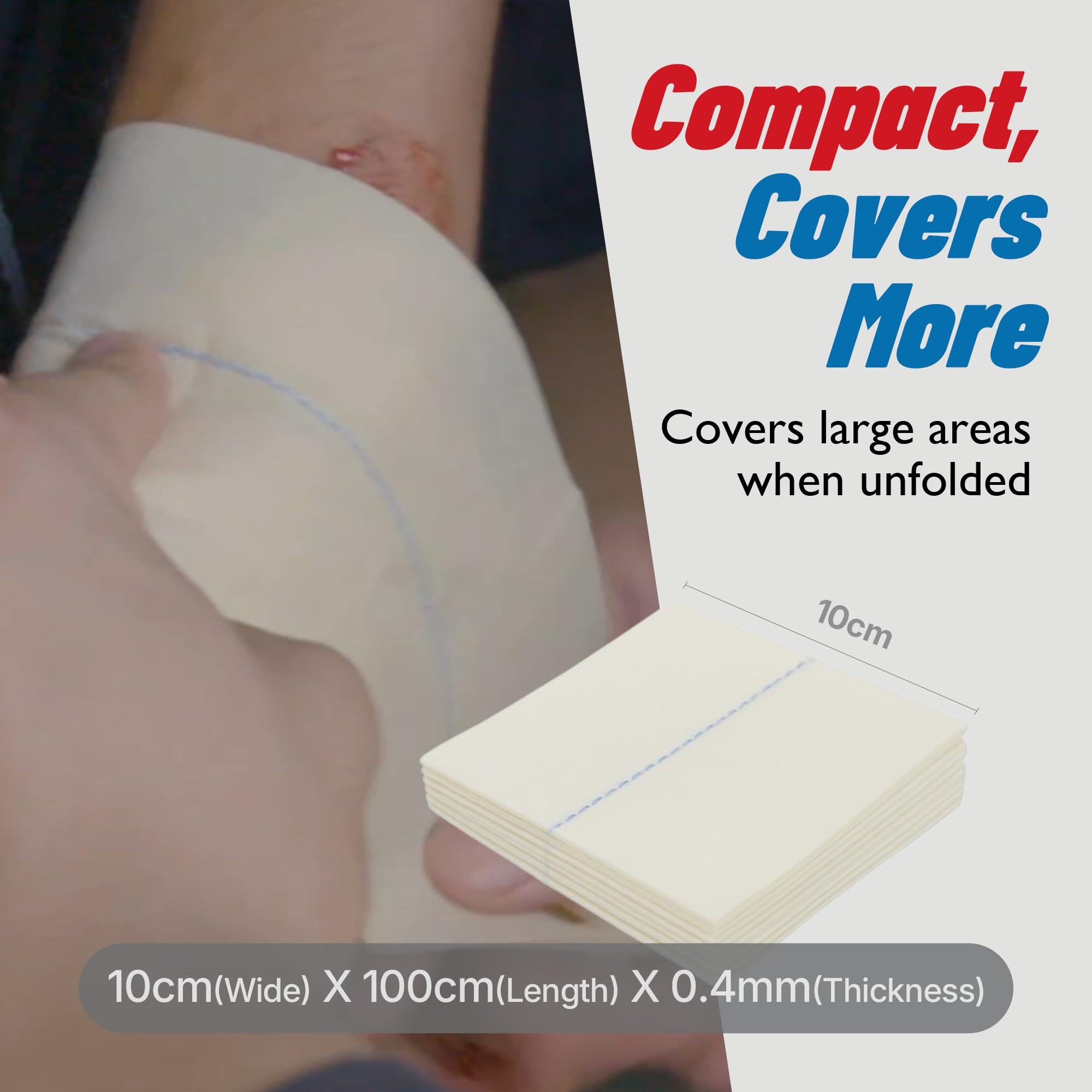 Slim but Effective: 3" x 40" for Wide Coverage This flat and compact dressing unfolds to cover large areas—perfect for arms, legs, or torso wounds. Easy to store in first aid kits, bags, or vehicles.