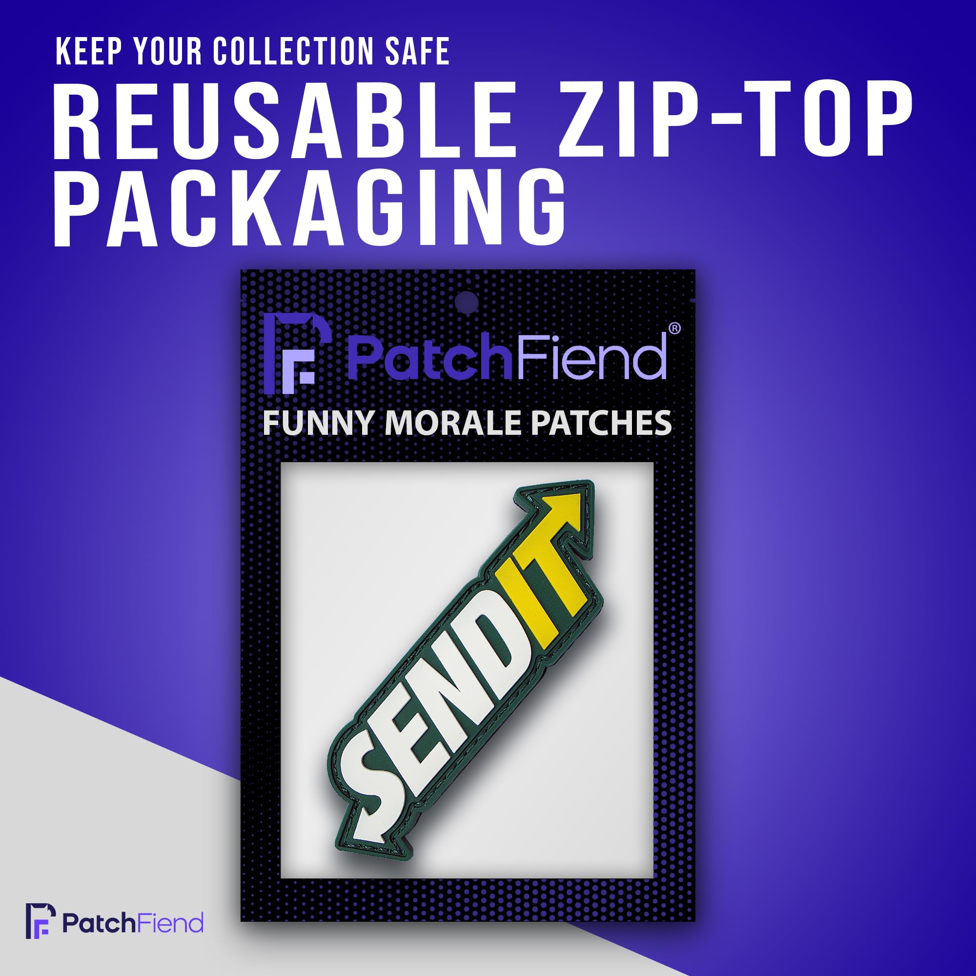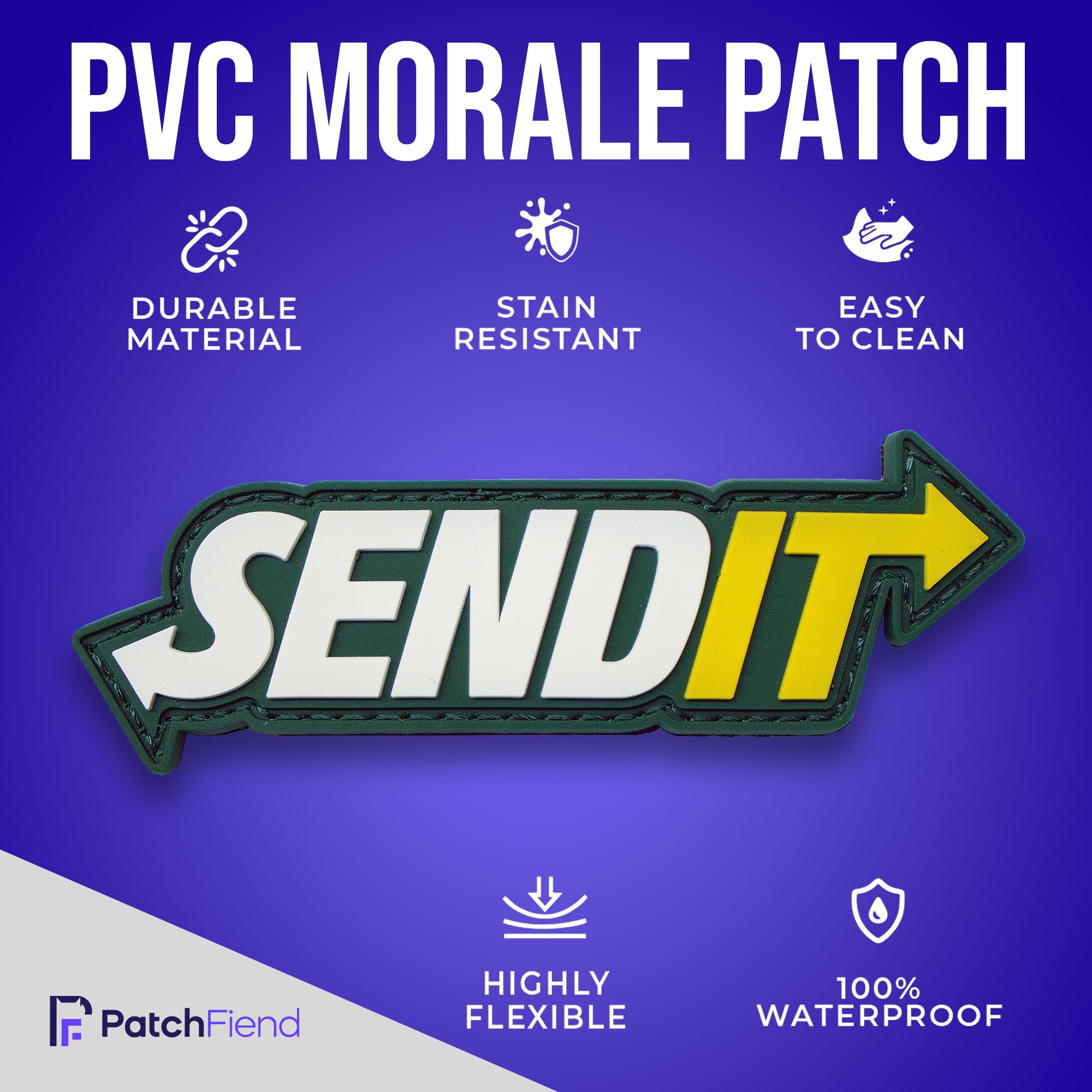 Indecision burns calories, so when it's go-time, just SEND IT! This hilarious 3.5" x 1" PVC morale patch is the ultimate emblem for anyone who charges headfirst into life's adventures. The Send It PVC Funny Morale Patch is made of durable but soft rubber so every scan is clean and easy. "Alpha Male"" is hook-backed so you can attach it to any loop or fuzzy surfaces like a car headliner, military backpack, military gear, patches for jackets, or your favorite patch wall. This meme morale patch is a must-have for any collector, airsofter, military or service dog owner. The small moral patch, features a funny design that is sure to add some humor to your gear. The hook backing makes it easy to attach to any backpack or harness. Not just for military or service dog owners, this tactical patch is also perfect for fans of anime or cool patches. It's a creative and fun way to express your interests. The PVC patches make it easy to switch out your patch depending on your mood. Upgrade your gear today with our PVC patch - the perfect addition to any backpack or tactical bag. Choose from our selection of funny patches, tactical patches, morale patches, and more. With patches for backpacks and jackets, you can easily customize your gear to fit your style. Whether you're a fearless airsoft warrior, a dedicated service dog handler, or just love to add a touch of humor to your tactical bag, this patch is the perfect way to show the world your adventurous spirit. Here's why you'll love the "Send It" Morale Patch: Funny and Functional: Stands out with its bold message and versatile use. Durable PVC Construction: Built to last through your toughest adventures. Universal Hook Backing: Attaches easily to backpacks, jackets, vests, tactical gear, and more. Perfect Size: Measures 3.5" x 1" for maximum impact without overwhelming your gear. Multiple Uses: From military backpacks and service dog harnesses to airsoft vests and anime patch collections, this patch goes anywhere. Show off your go-getter attitude and add some laughter to your tactical gear. Get your "Send It" Morale Patch today!