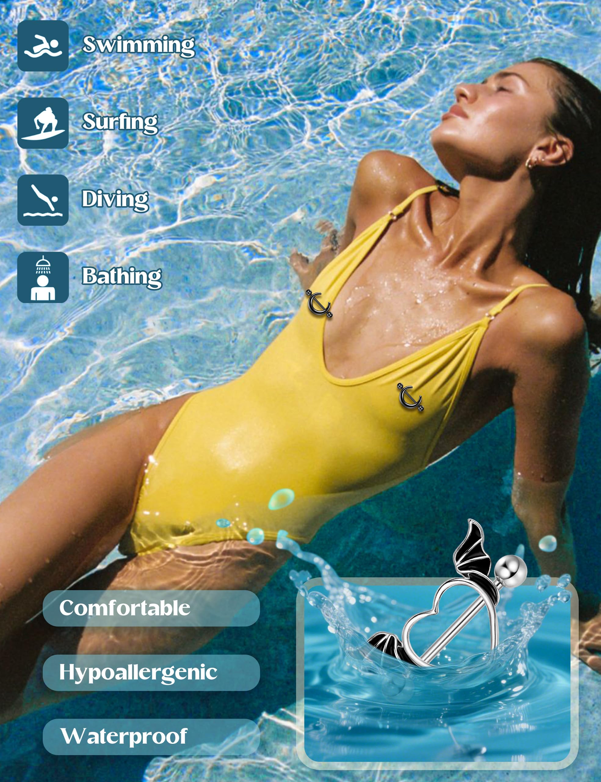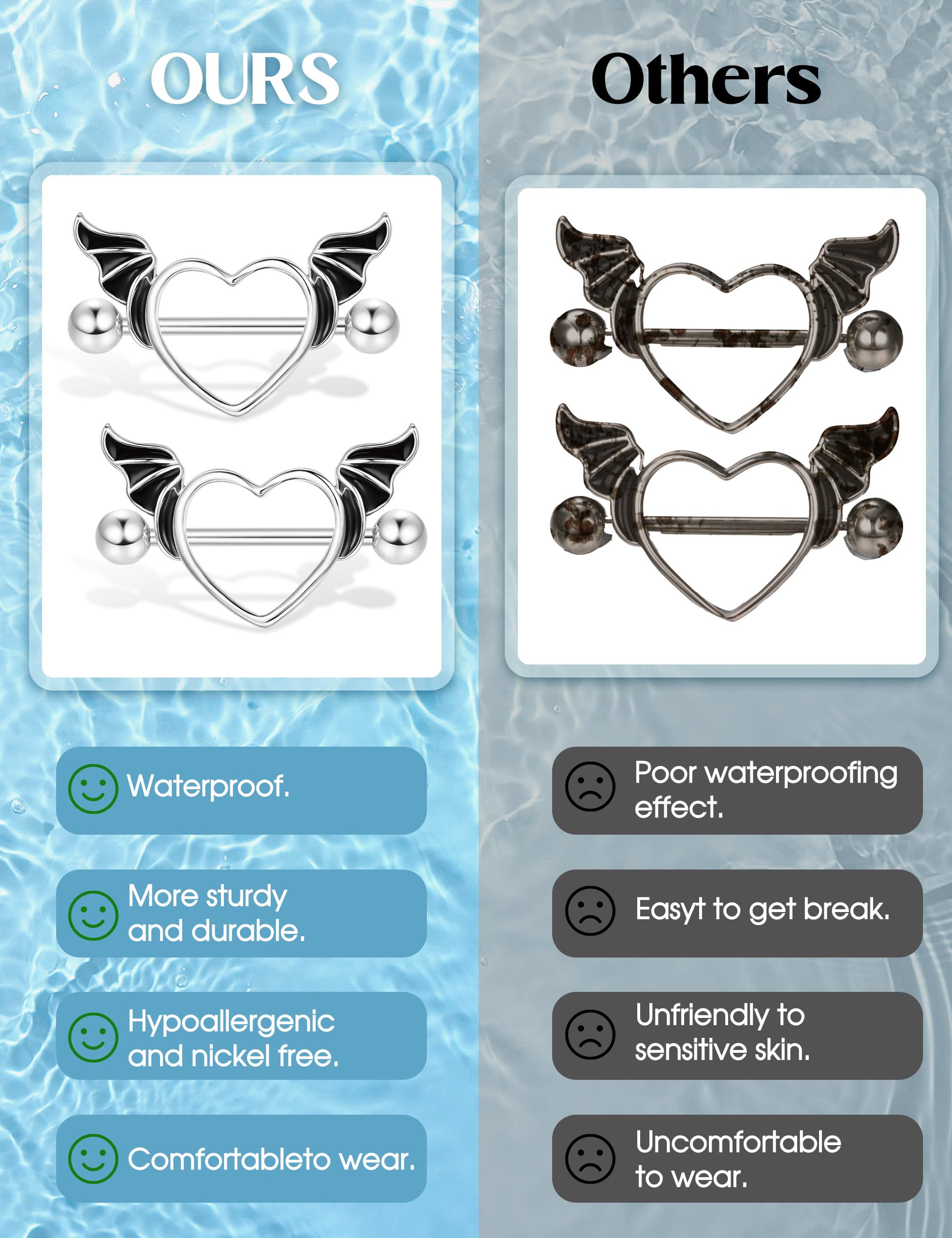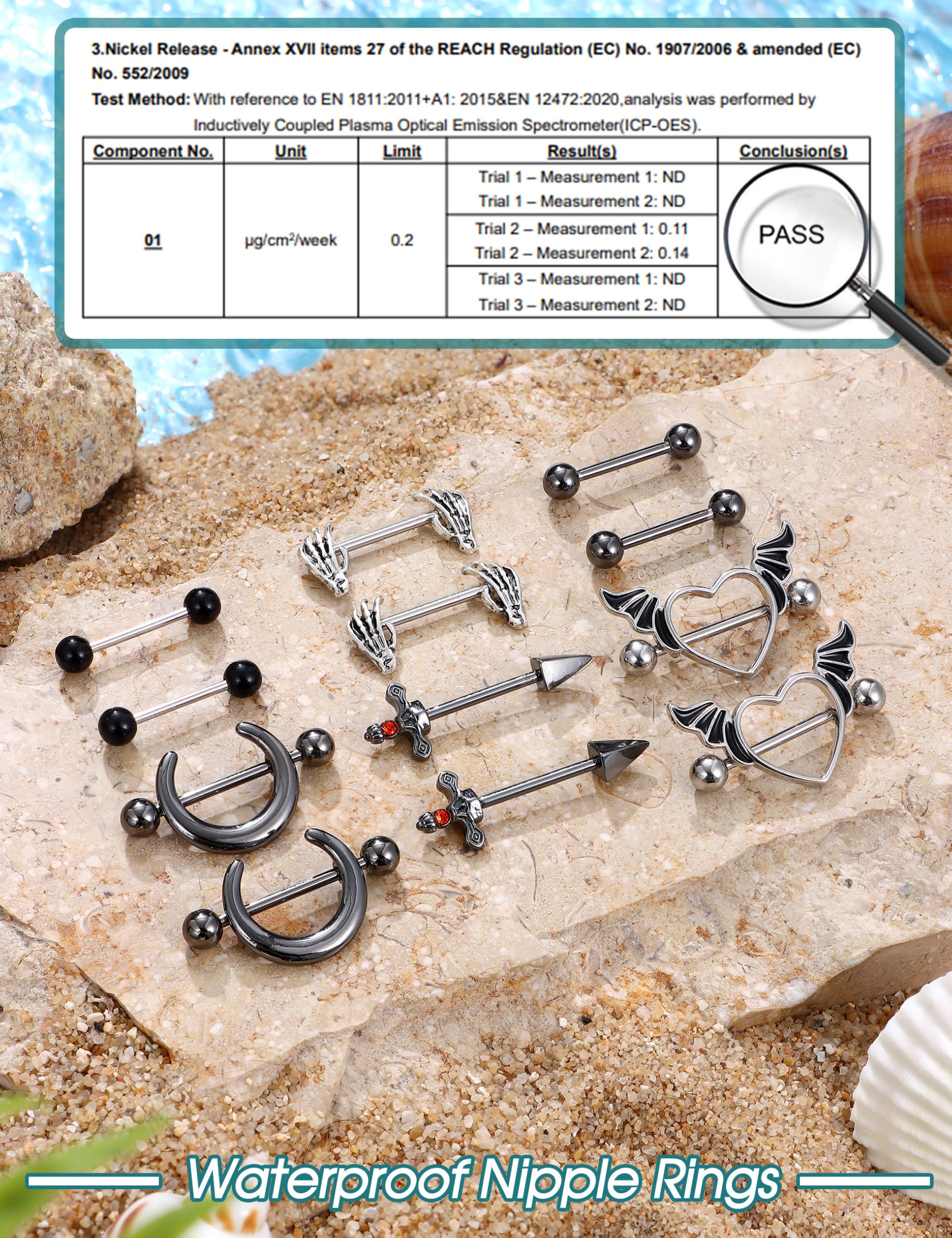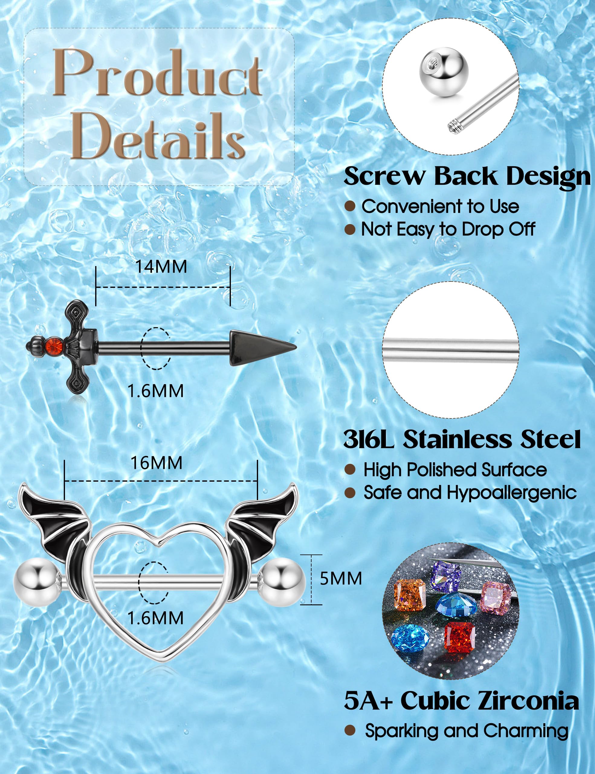 Size & Specifications: Nipple piercing jewelry gauge size: 14G(1.6mm), claw nipple ring, sword nipple ring and ball nipple ring bar Length: 14mm, heart with wing nipple ring and moon nipple ring bar Length: 16mm, ball diameter: 5mm. The size is suitable for most people, comfortable to wear, avoiding the size difference trouble, perfect size of nipple piercing, keep you happy every day