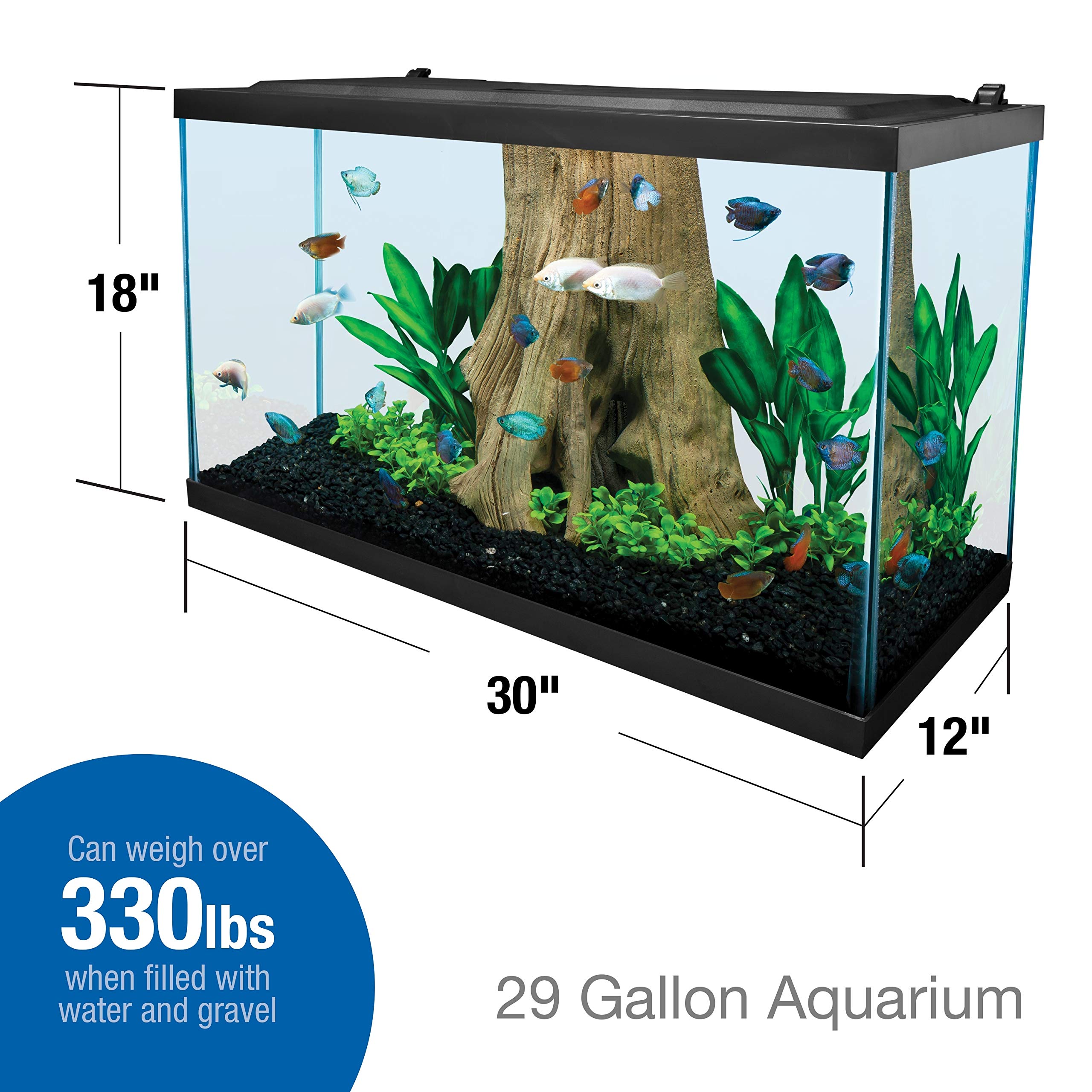 29 GALLON TANK: Measures 30 inches wide by 12 inches deep by 18 inches high.