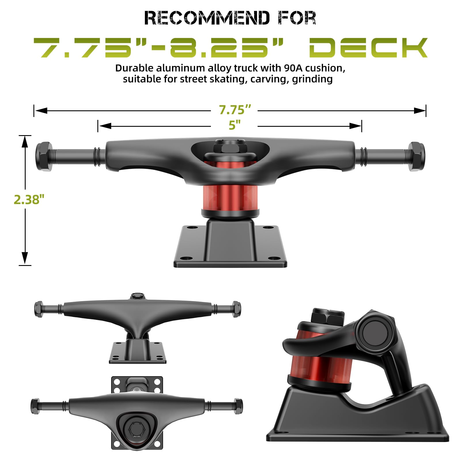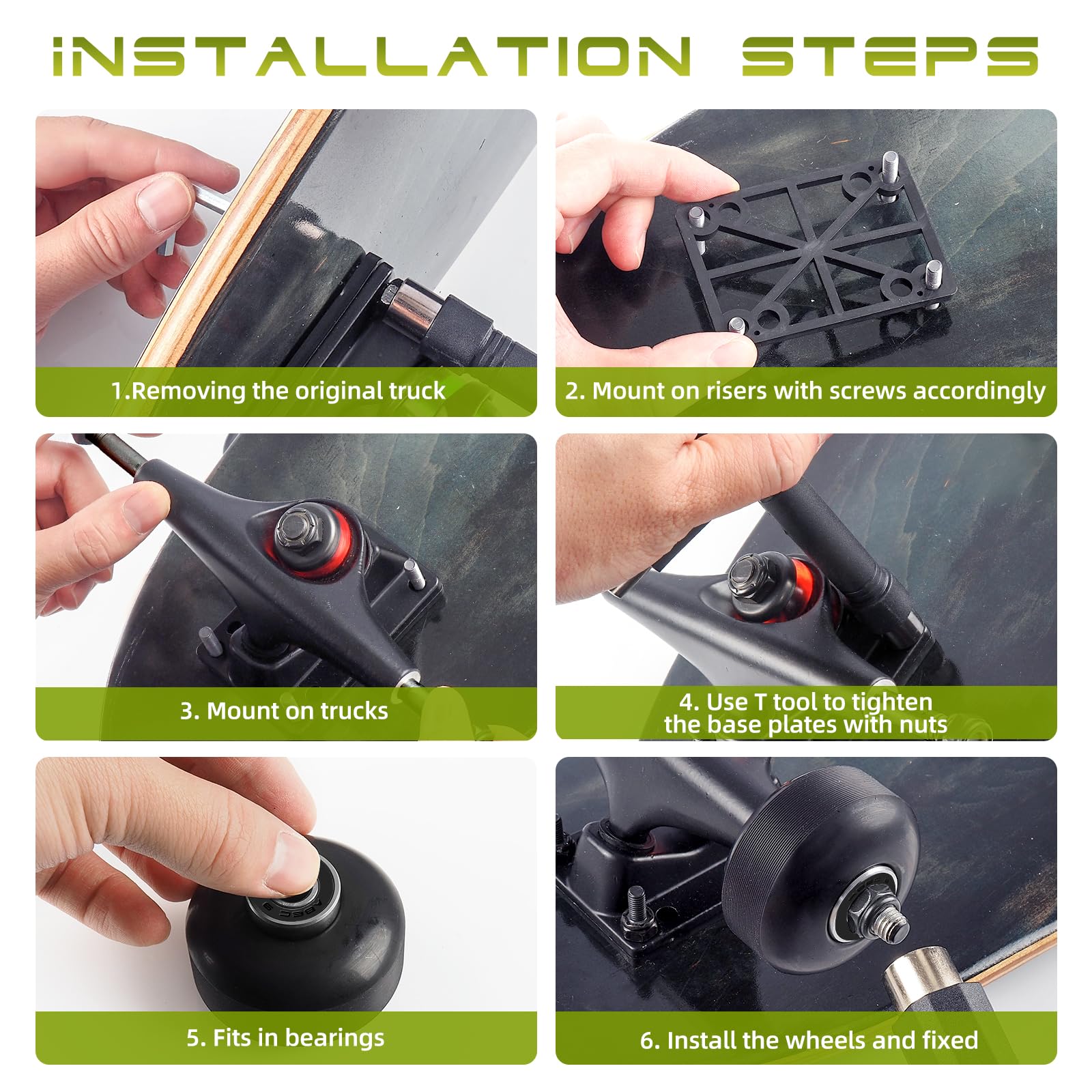 Skateboard Trucks and wheels Set for 7.75-8" decks. This starter set includes 2 skateboard trucks 139mm standard, 4 skateboard wheels 52mm, High precision ABEC-9 Skateboard bearings, Practical T-tool, 2 riser pads 2mm, and standard skateboard hardware. Build a entry-level skateboard with this set