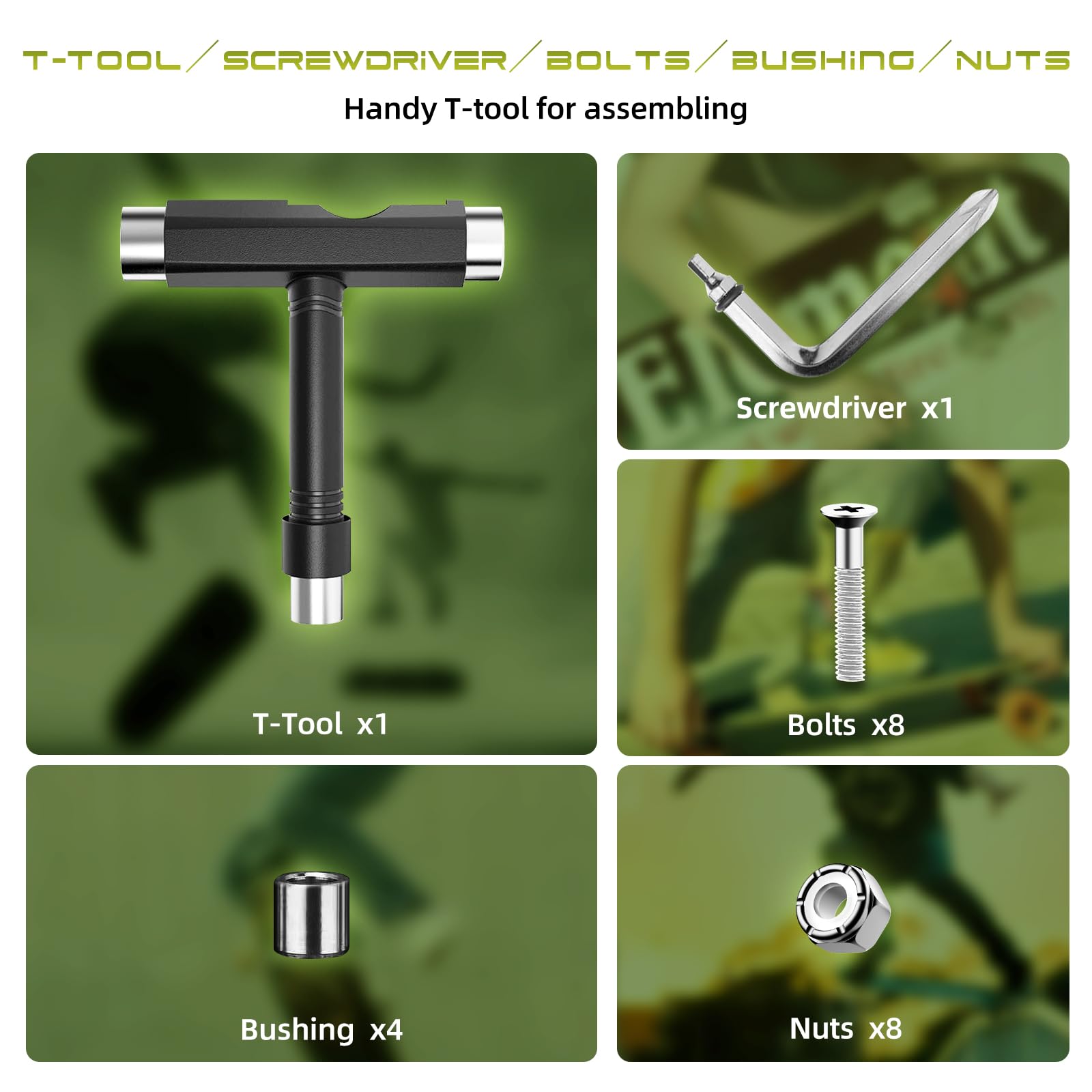 Overview Jizmo skateboard trucks kit includes everything you need to build a skateboard with your 7.75-8” deck. The Jizmo Trucks are durable, high-performance trucks for every type of skateboarding. Featuring a standard baseplate with hollow axles and hollow kingpin. Feature Strong and durable trucks for multipurpose skateboarding High precise ABEC-9 skateboard wheels ensure smooth rolling. Includes all the hardware and universal T-tool to build and adjust the skateboard. 99A hard wheels roll faster, offer good grip and speed, ideal for street skateboarding and for smooth surfaces like skate parks and ramps. Good cost-effective kit to build a beginners’skateboard Package includes 2 x skateboard truck 2 x riser pad 1 x T-tool 4 x wheels 8 x bearings Hardware Note: Please lubricate the wheels and bearings for the first time skating if you want to roll faster.