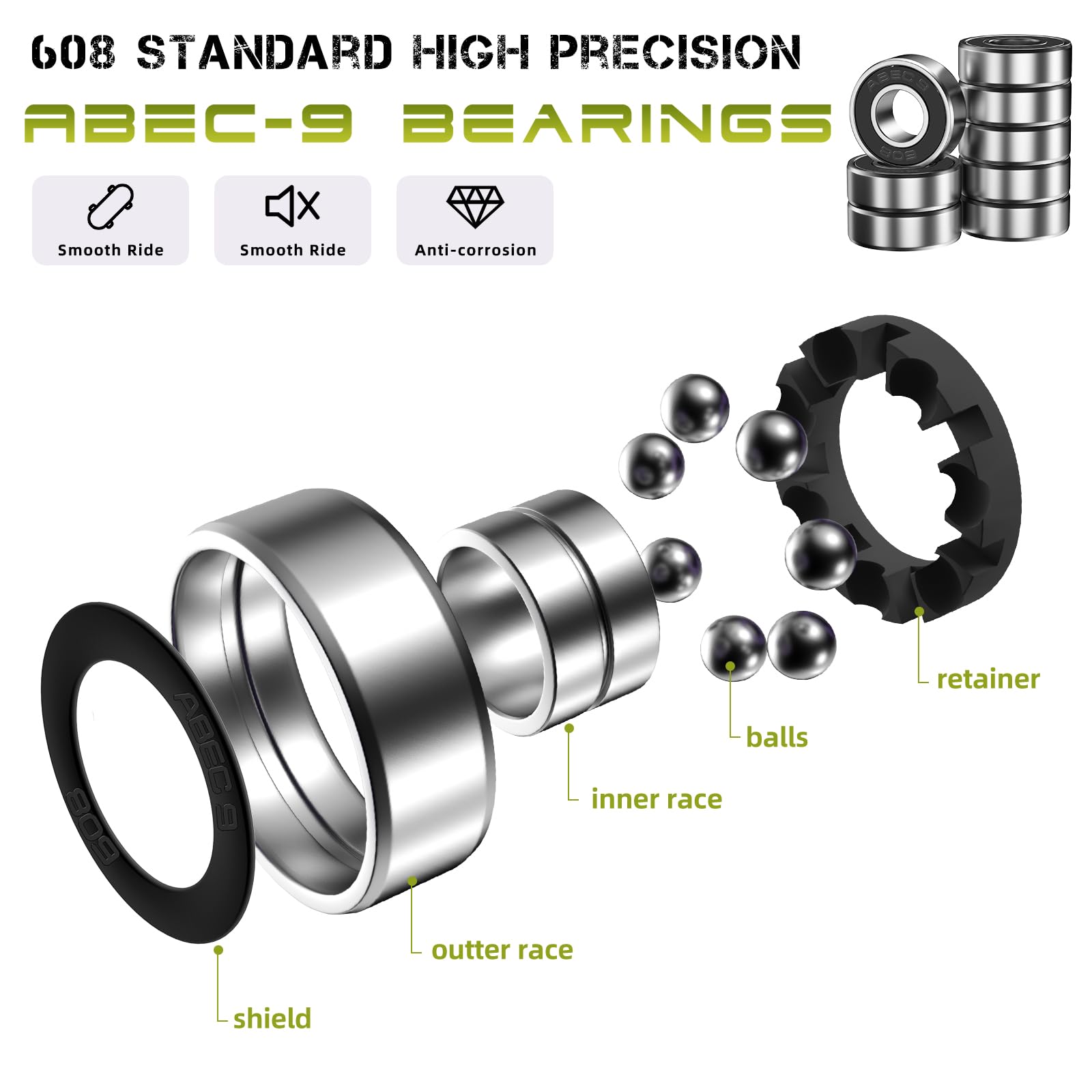 High Precision ABEC-9 Bearings. These skateboard bearings keep rolling smooth and fast. Good alternative to expensive bearings