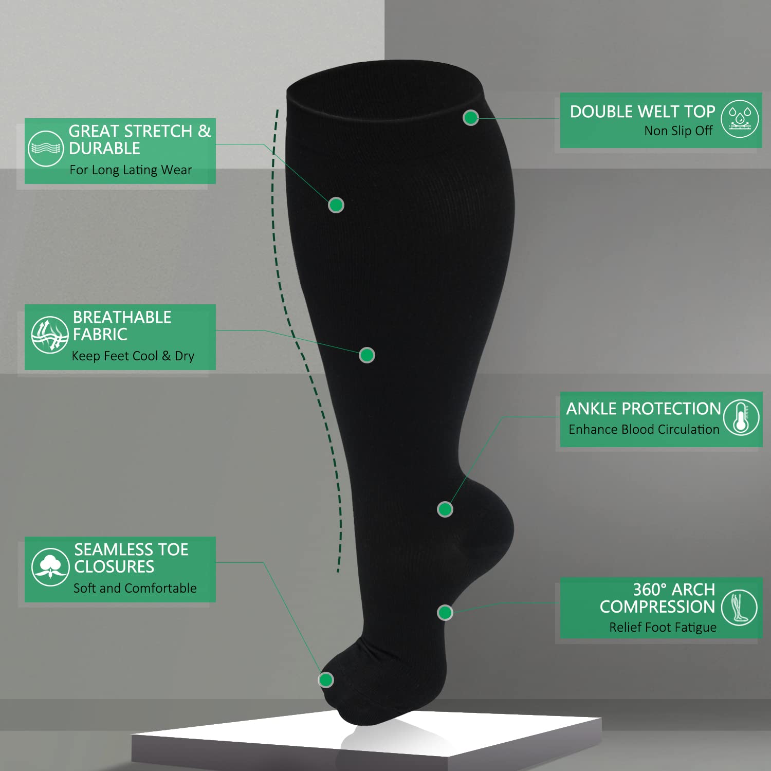 【WIDE CALF DESIGN】- NEW FIT Extra Wide Calf Compression Socks, specially designed for women and men who wear in exlarge or plus size, bring your legs strong support and long lasting comfort. We provide more size choices (XL-5XL) for ankle up to 18 inches, calf 10 to 30 inches’ circumference, you can refer to the size chart to choose the suitable size.