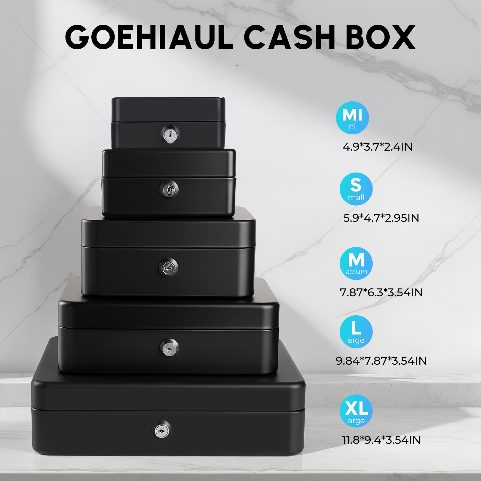VERSATILE CASH LOCK BOX: Measuring 11.8" x 9.4" x 3.54", our metal cash box with key is ideal for daily cash organization, yard sales, garage sales, craft shows, or use as a money saving box, change box, cash drawer, cash register for small businesses