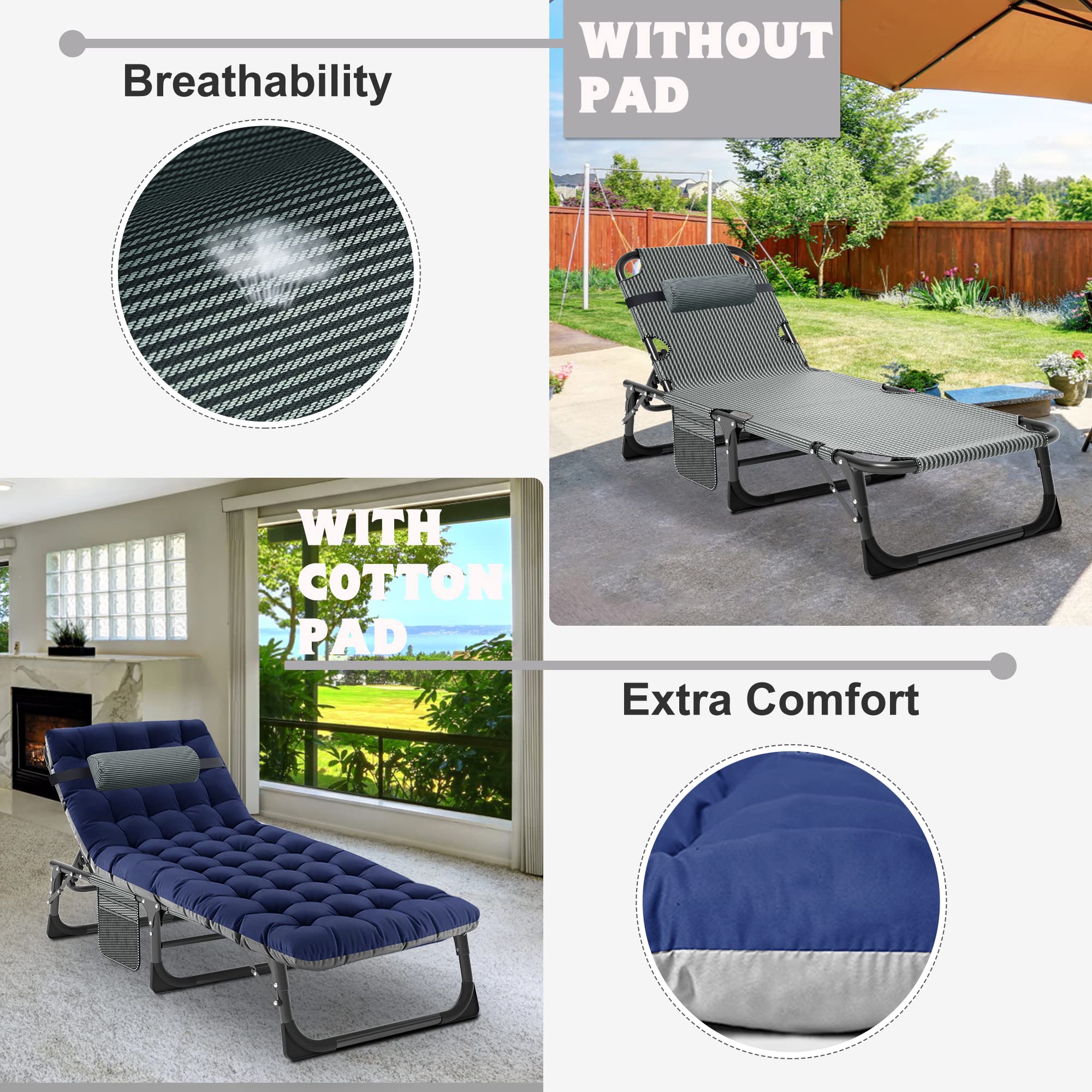 Comfortable Outdoor Lounge :Spacious folding chaise lounge chair comes with mat, suitable for individuals up to 6.2 feet. Breathable fabric and ergonomic design provide a perfect balance of firmness and softness, reducing muscle tension