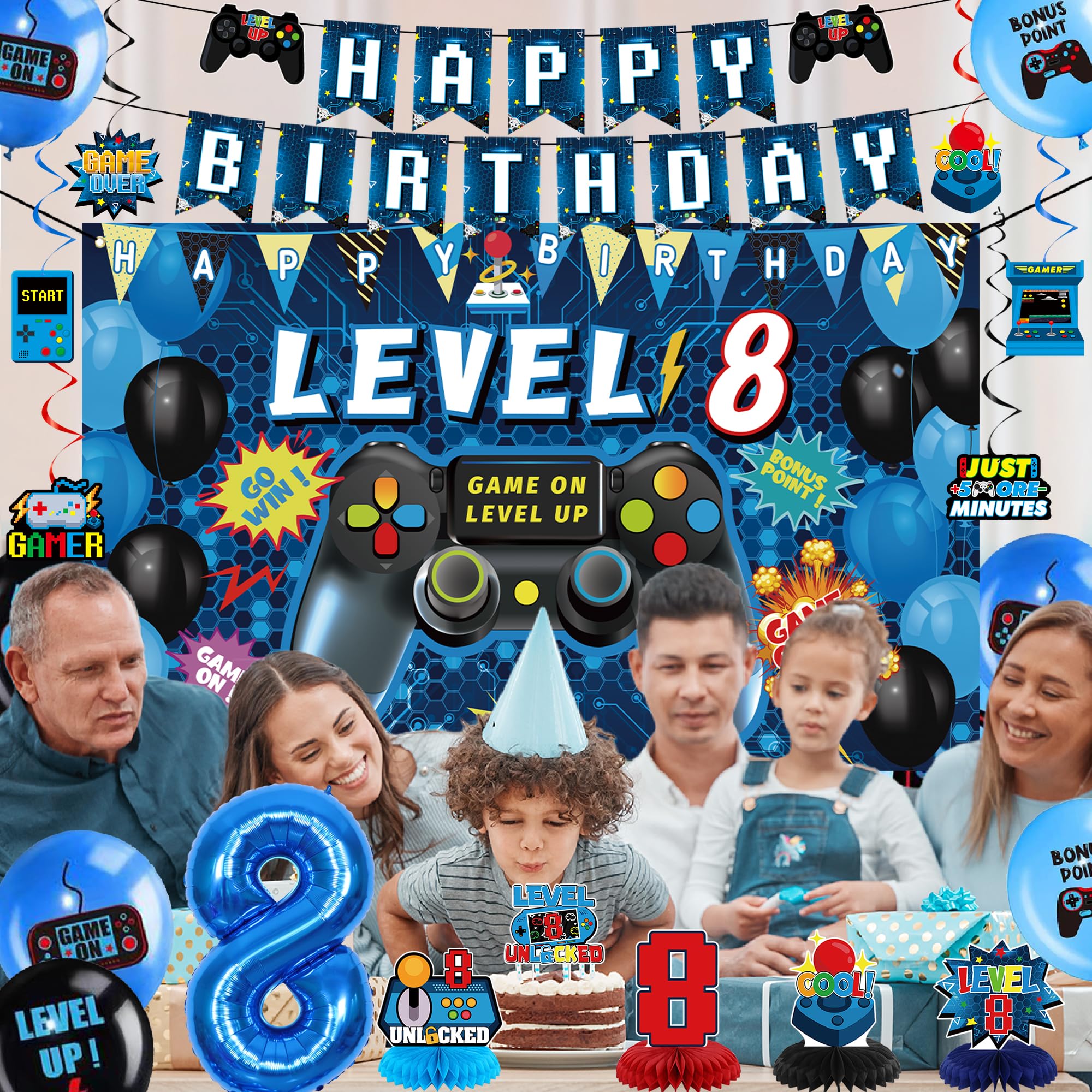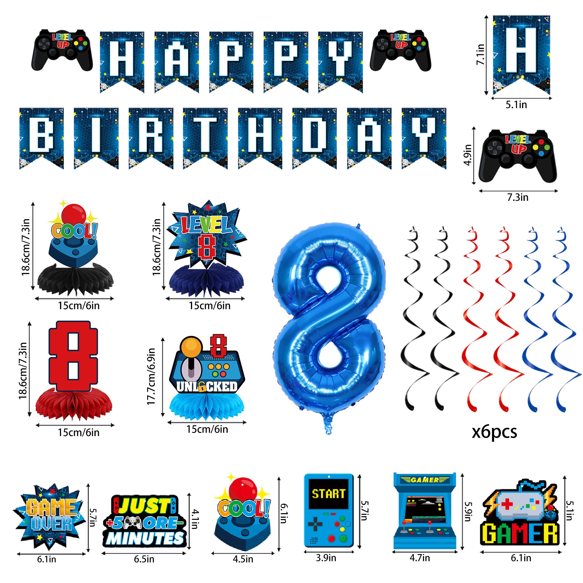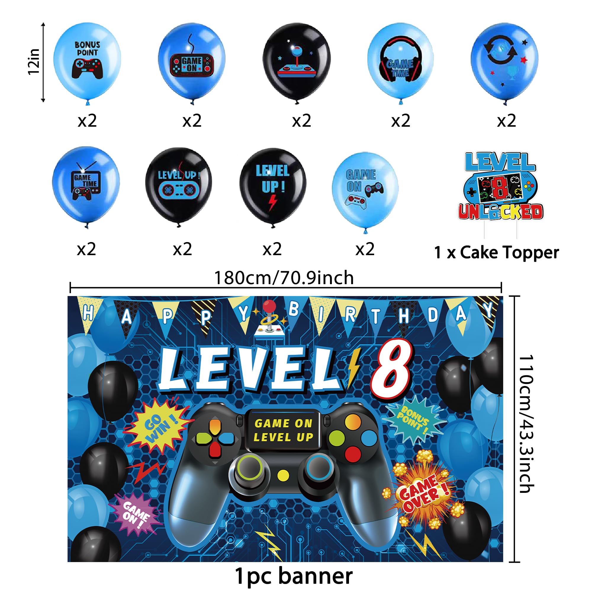 [Package includes]- 1 x Level 8 Backdrop, 1 x "HAPPY BIRTHDAY" banner, 1x level 8 cake topper, number 8 foil balloon, 4 x honeycomb, 18 x latex balloons and 6 hanging swirls.