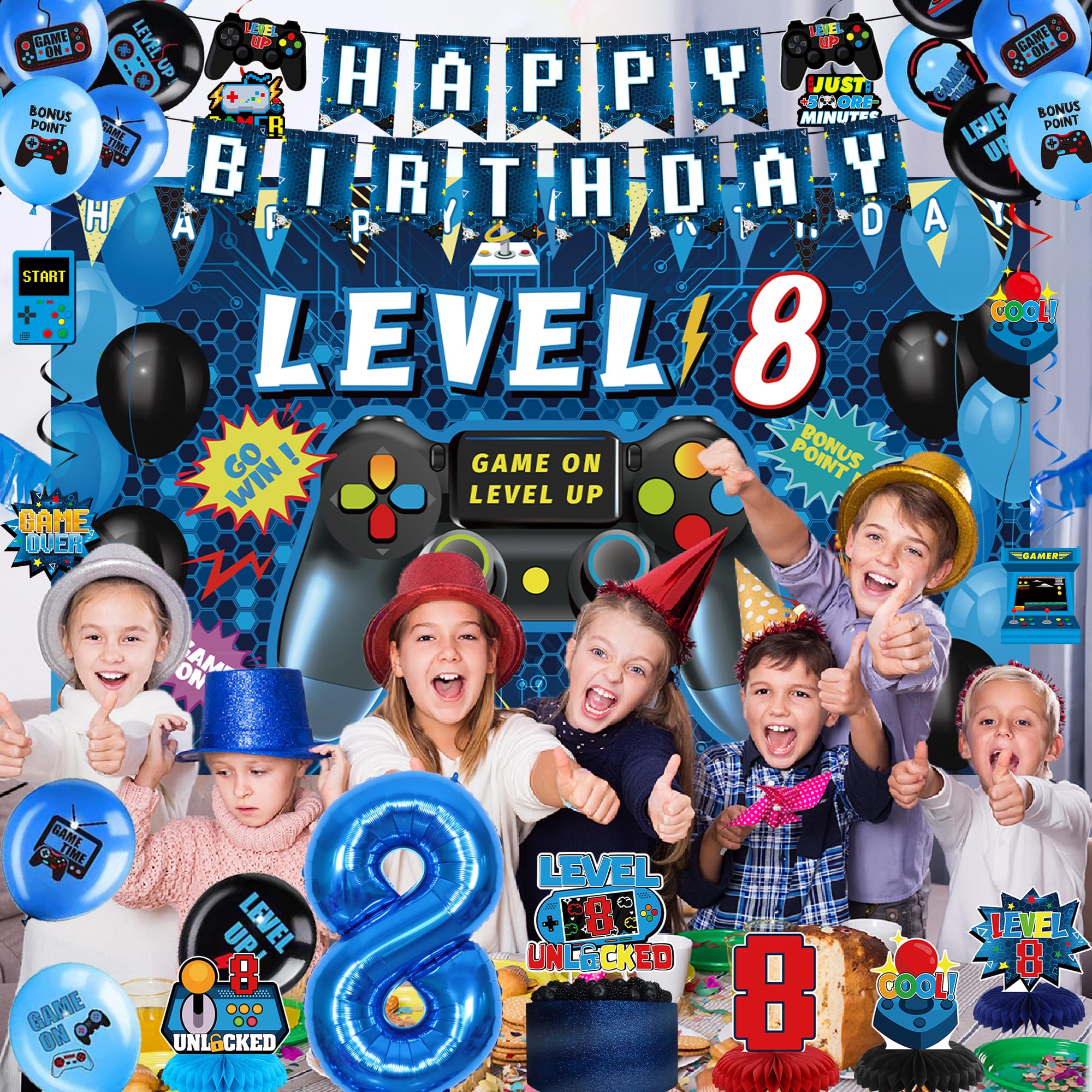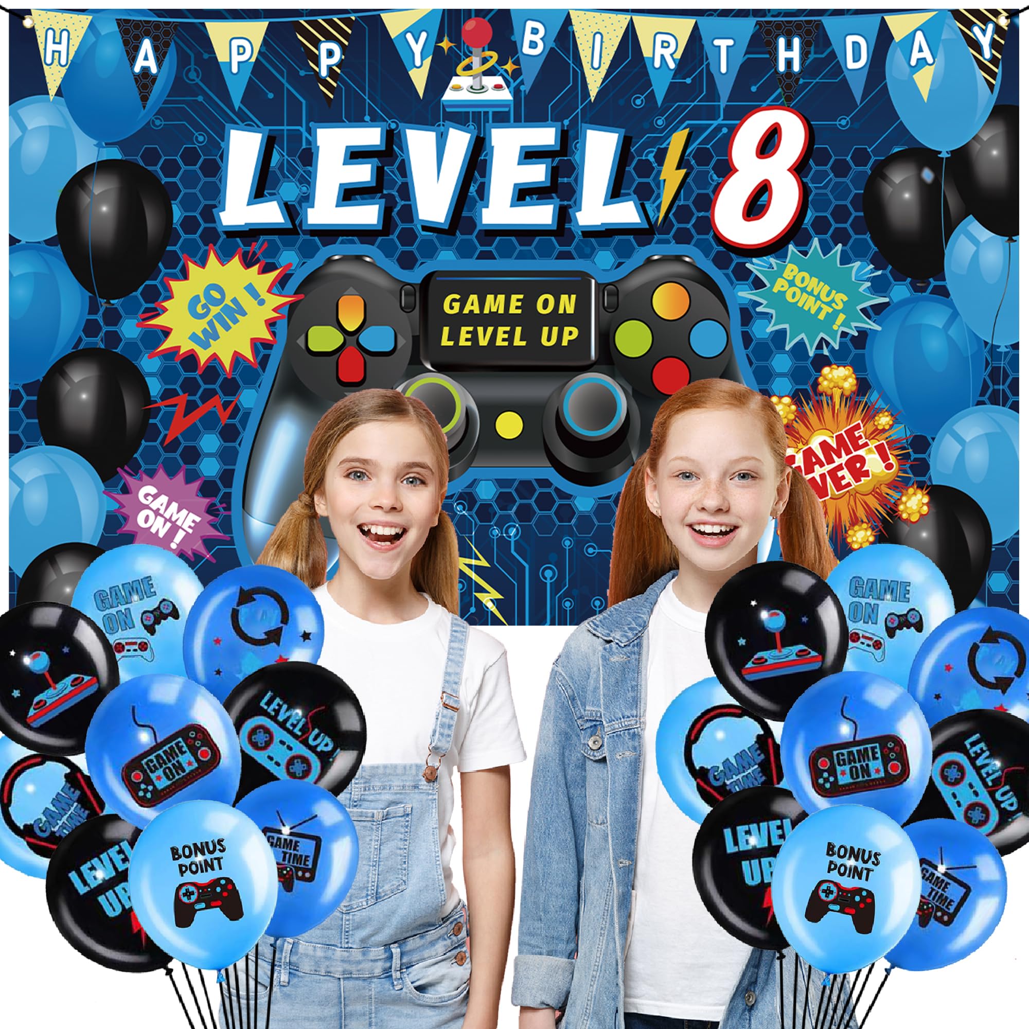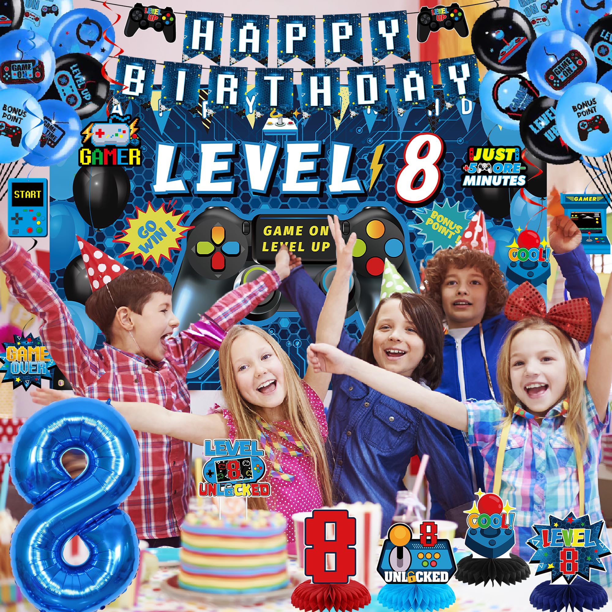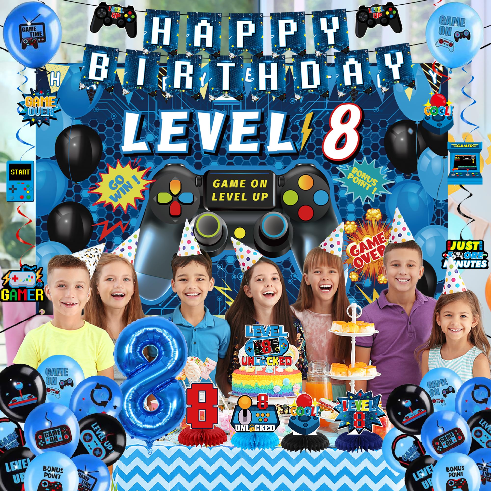 [Package includes]- 1 x Level 8 Backdrop, 1 x "HAPPY BIRTHDAY" banner, 1x level 8 cake topper, number 8 foil balloon, 4 x honeycomb, 18 x latex balloons and 6 hanging swirls.